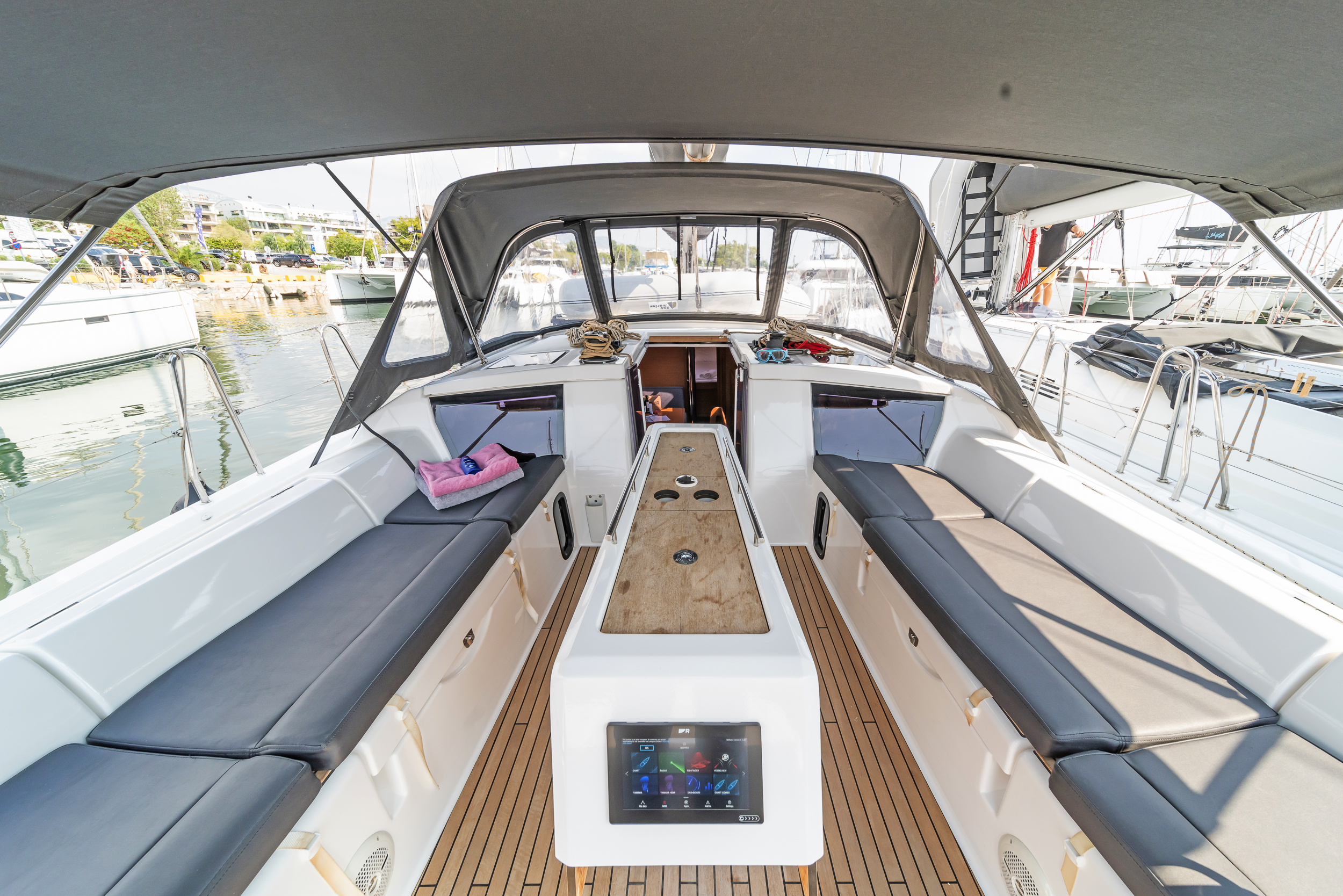| Outside | Anker mit Kette, Badeleiter, Biminitop, Bootshaken, Cockpitdusche, Cockpitlautsprecher, Cockpitpolster, elektr. Ankerwinsch, Gangway, Solaranlage, Sprayhood, Teak im Cockpit, Winschen |
