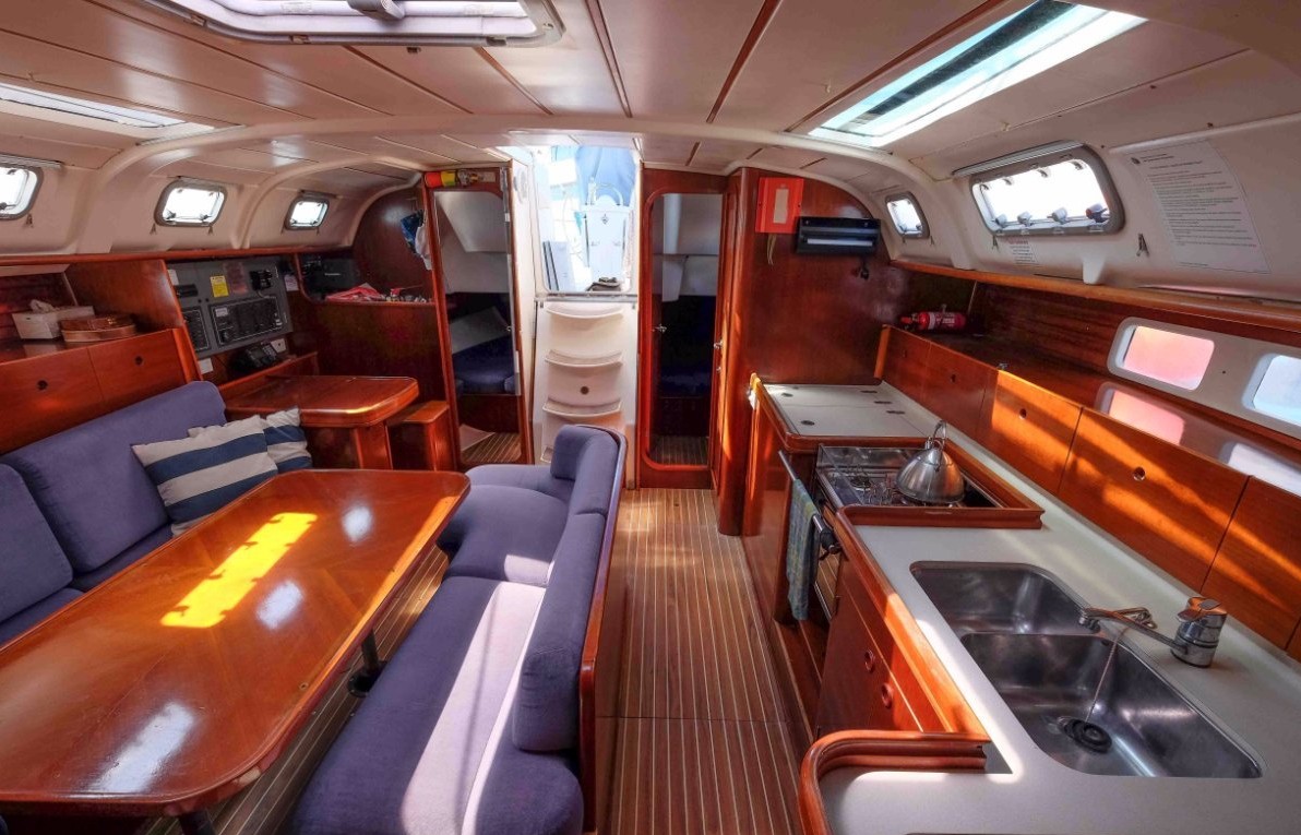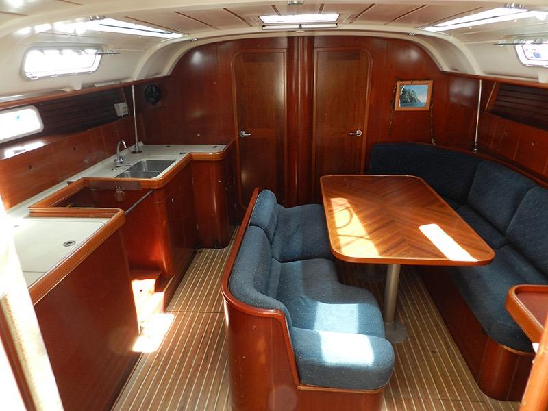 | Outside | Anker mit Kette, Ankerwinsch, Badeleiter, Badeplattform, Bootshaken, Cockpitlautsprecher, Cockpitpolster, Cockpittisch mit Eisbox, Fender, Teak im Cockpit, Wantenschneider, Winschen |