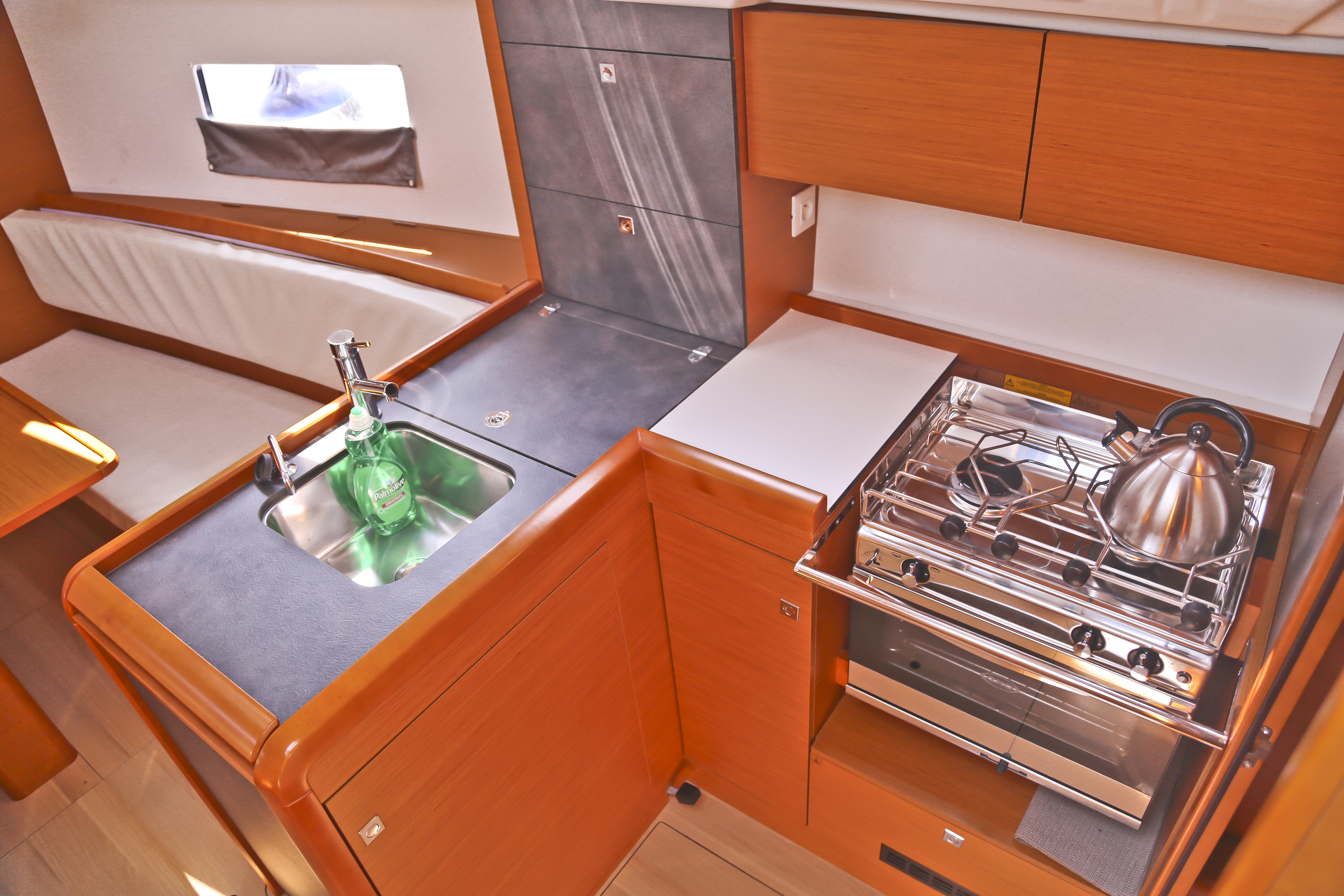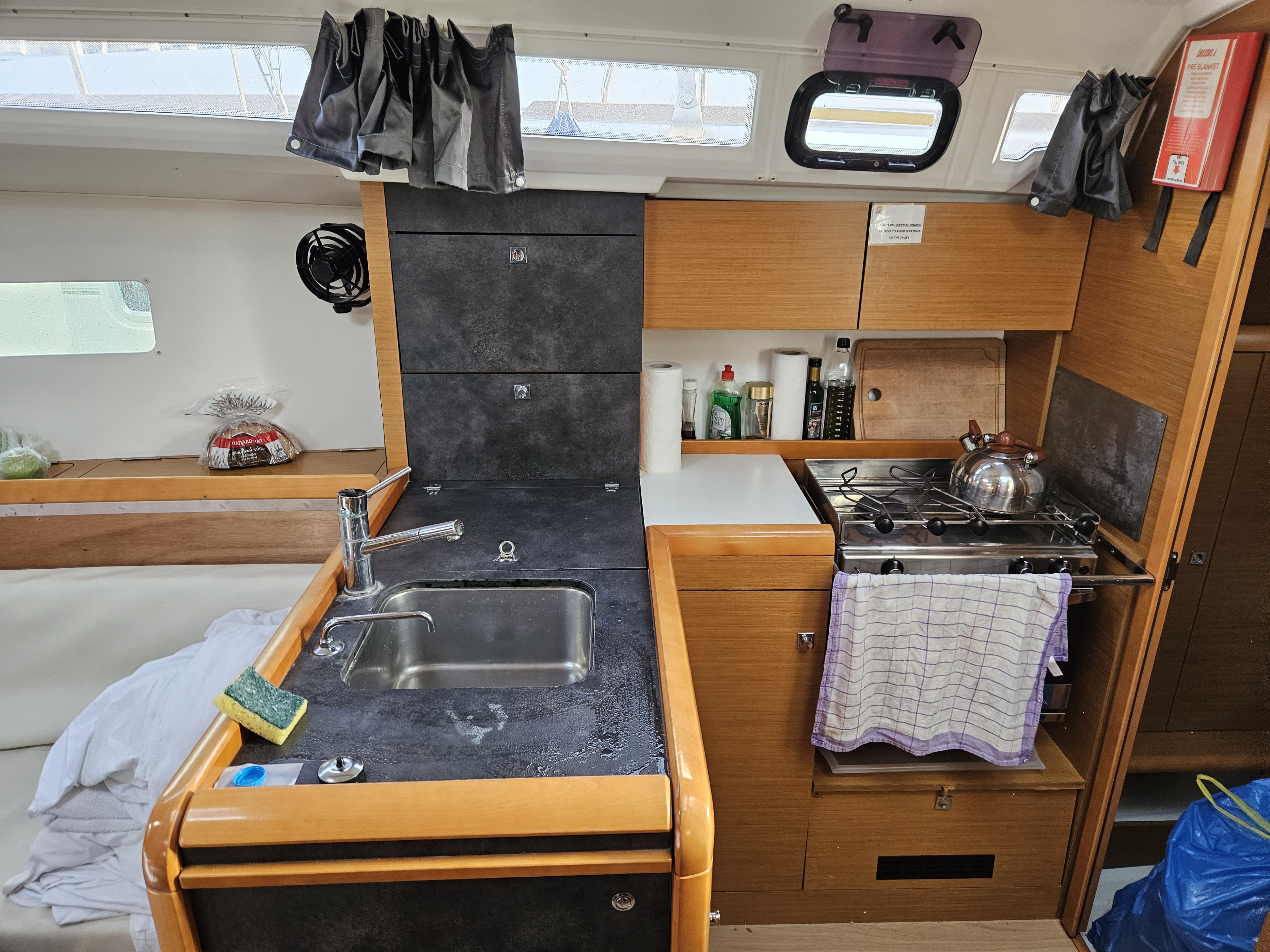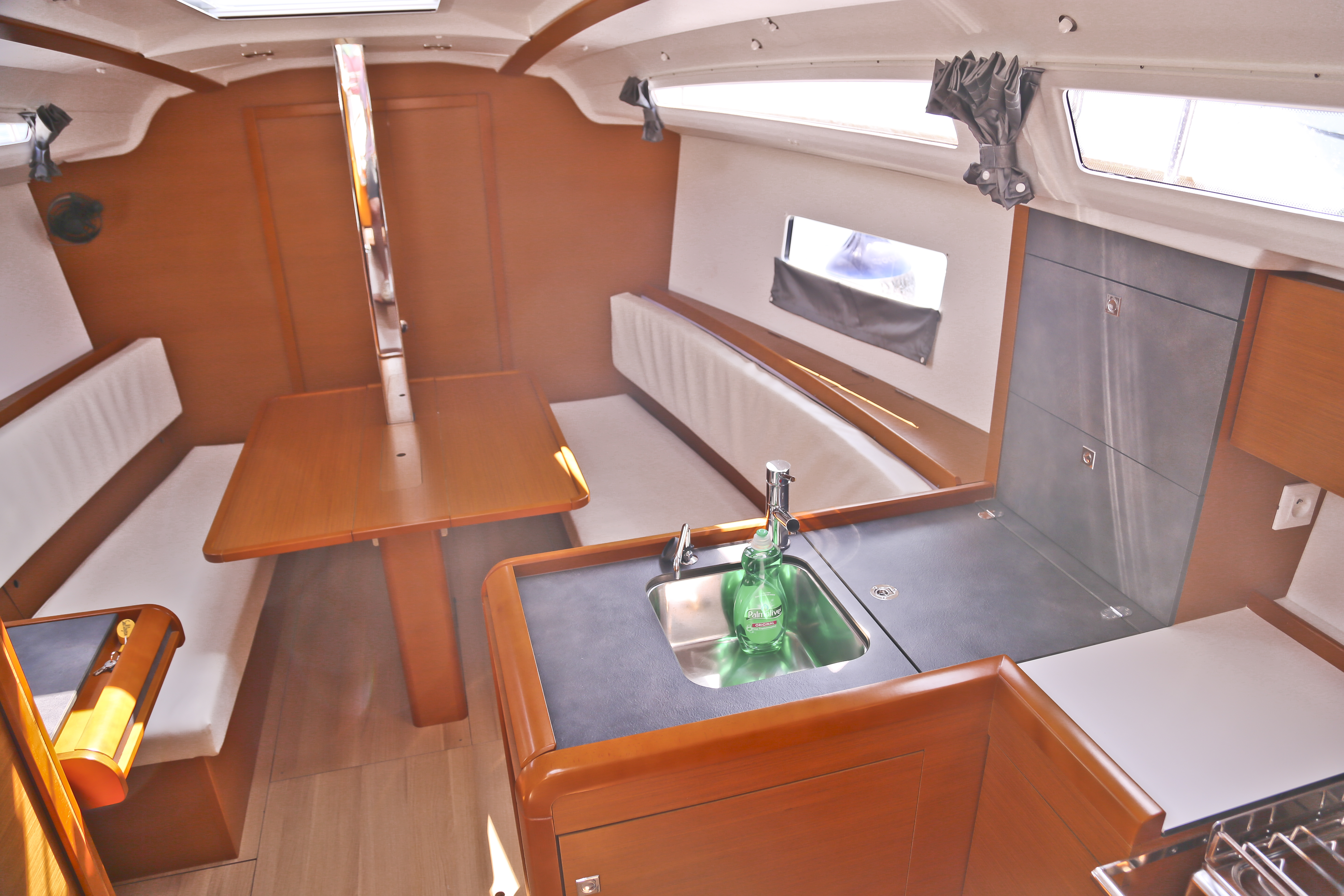Inside Fäkalientank, Gasherd, Gefrierschrank, Inverter 12V/220V, Kühlschrank, Moskitonetze, Pantryausstattung, Radio mit USB, Bluetooth und AUX-In, Ventilator, Ventilatoren in Kabinen, Warmwasser