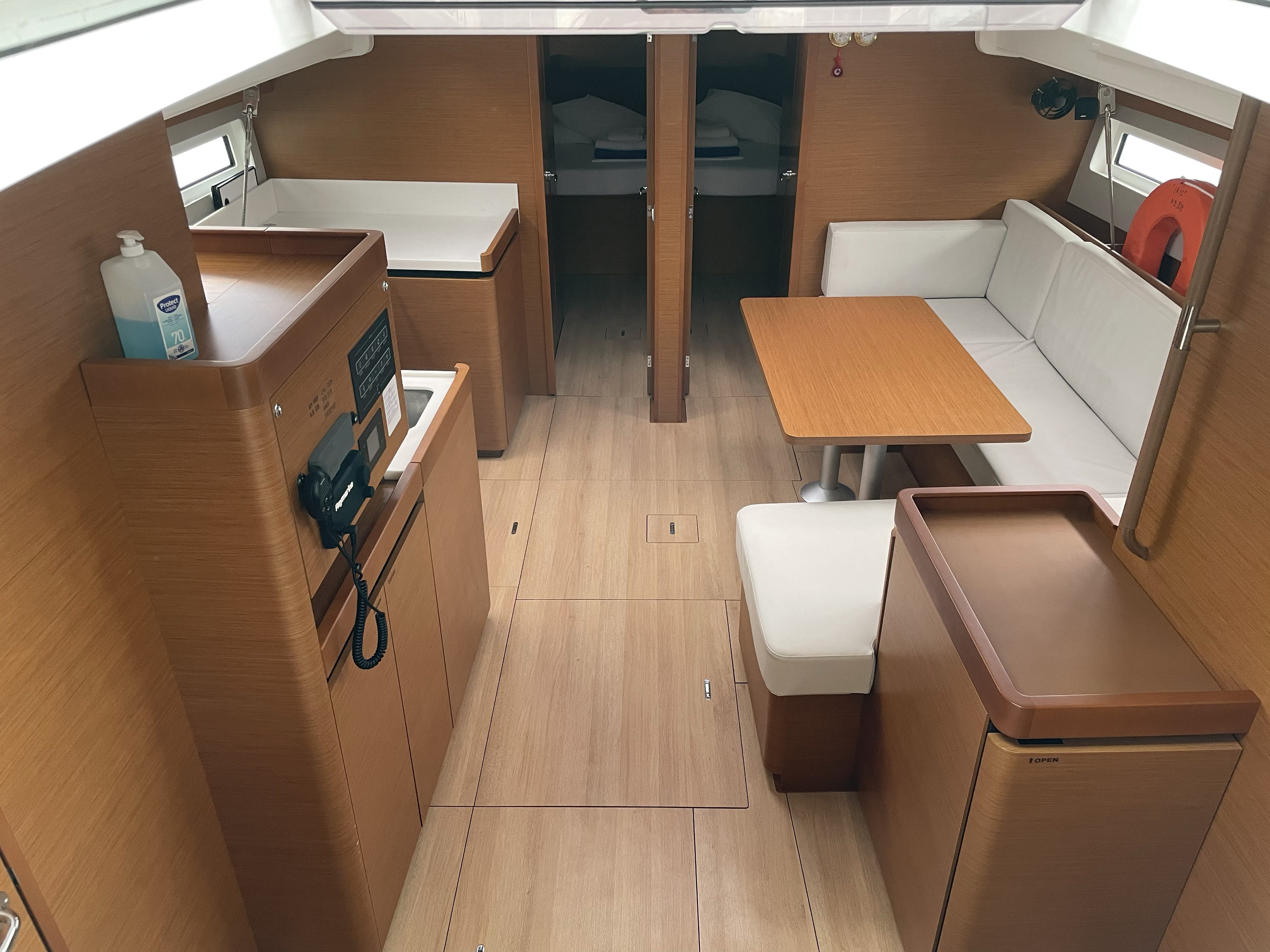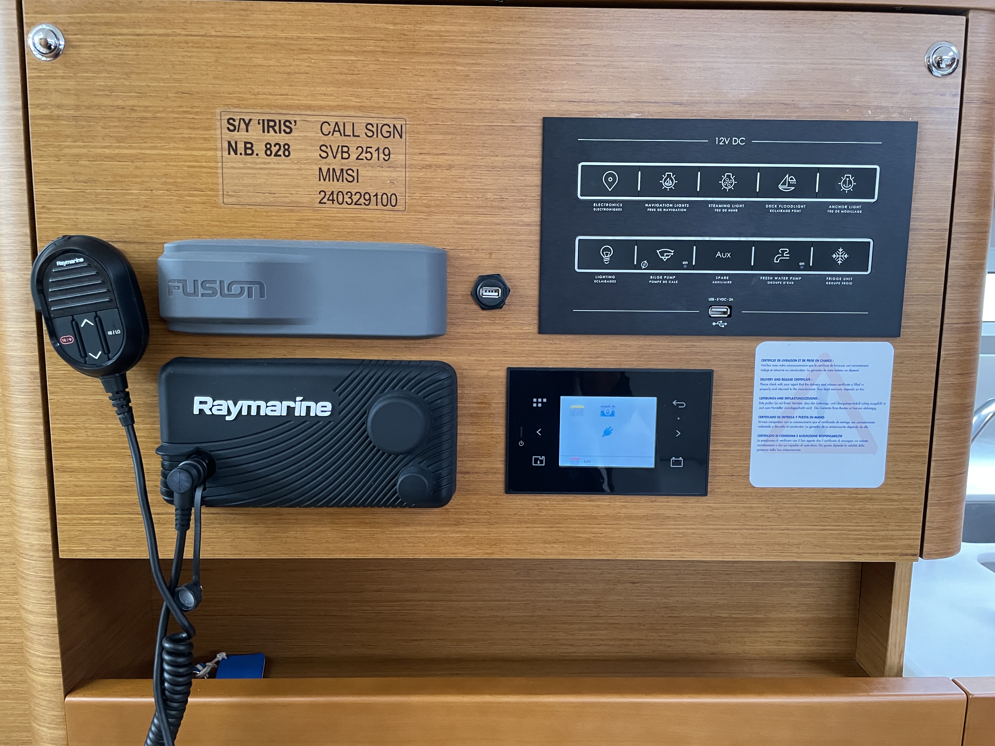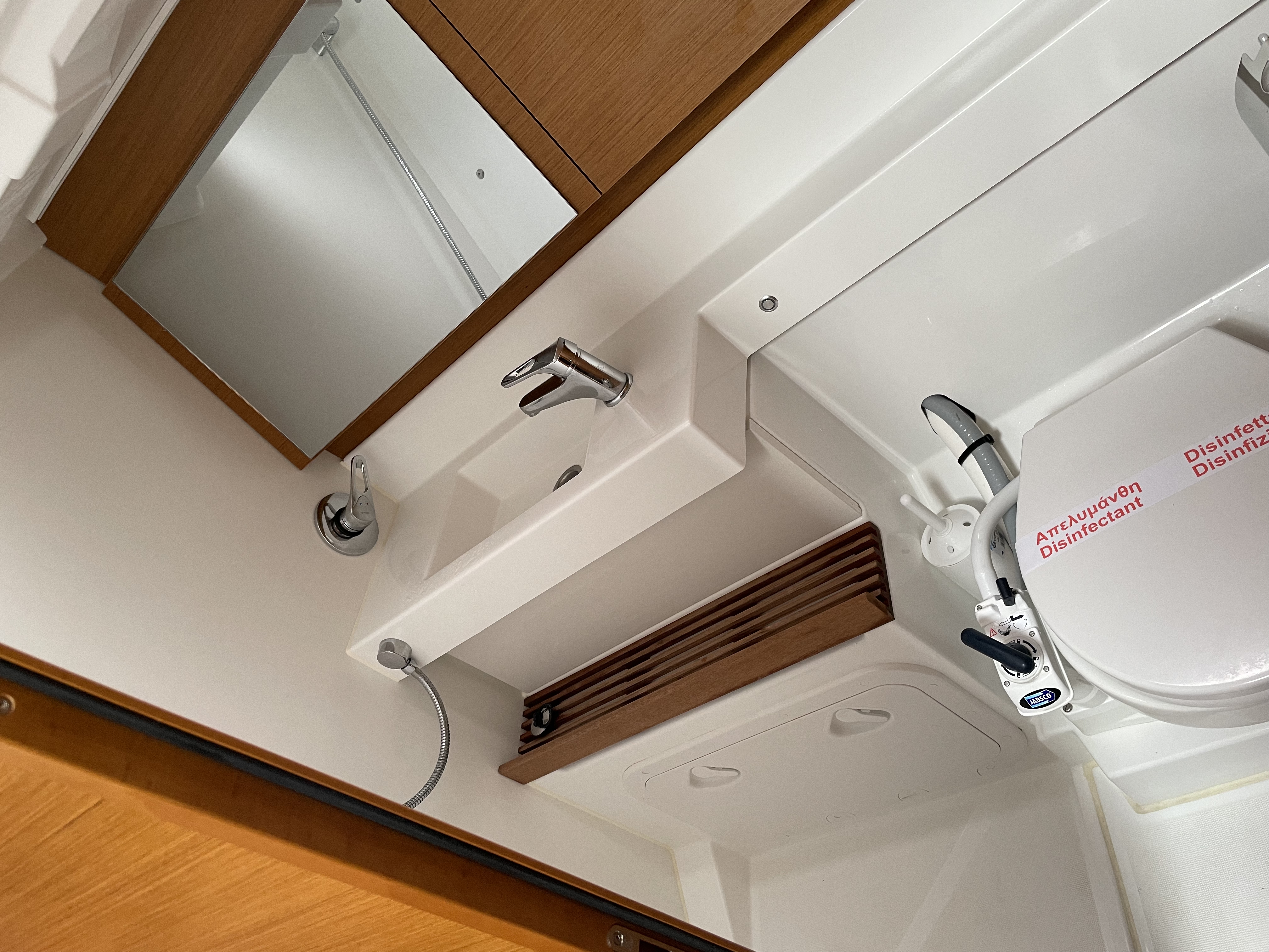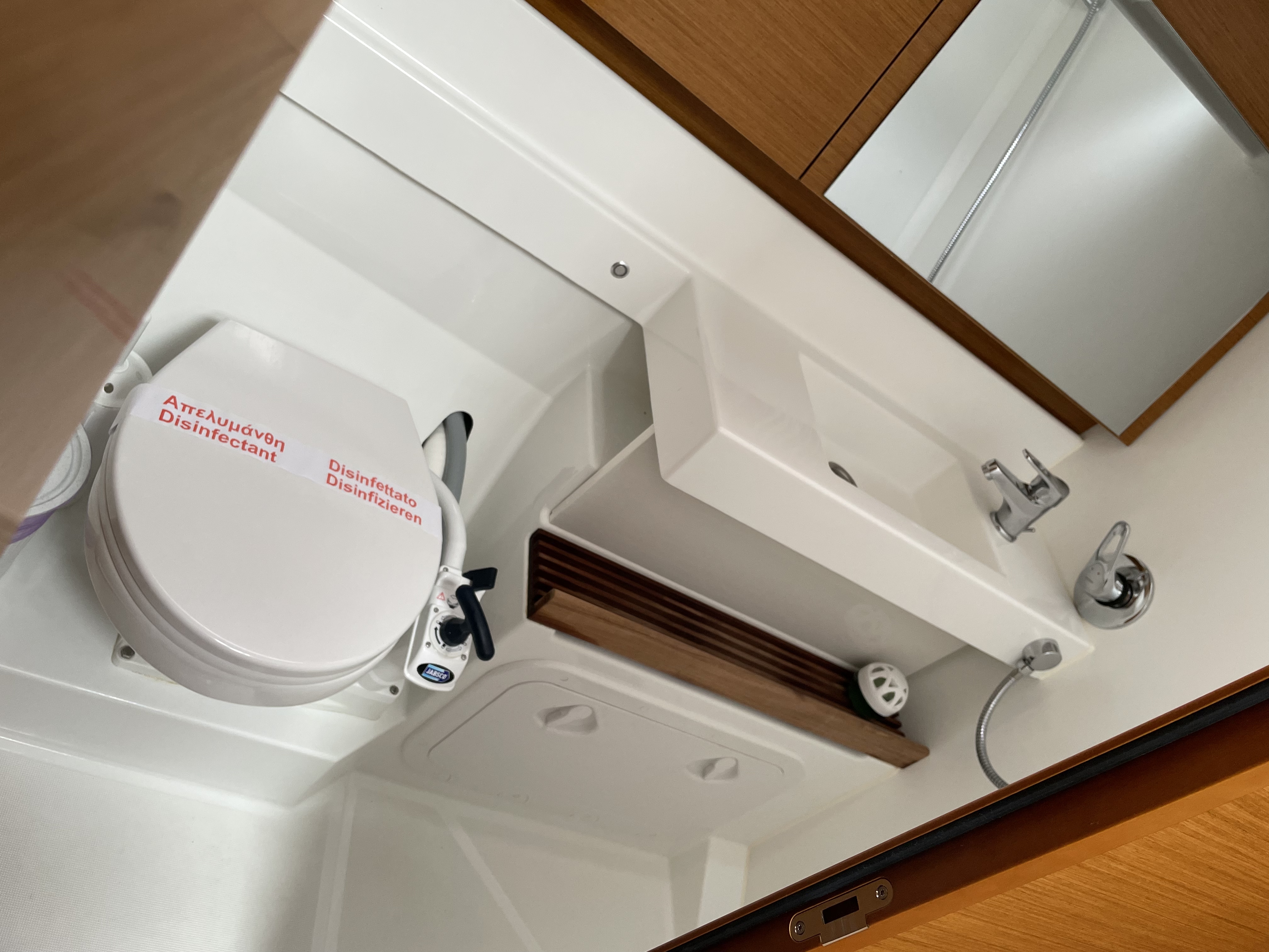| Outside | Außendusche, Badeleiter, Biminitop, Cockpitlautsprecher, Cockpitpolster, Cockpittisch, elektr. Ankerwinsch, Gangway, Sprayhood, Teak im Cockpit |