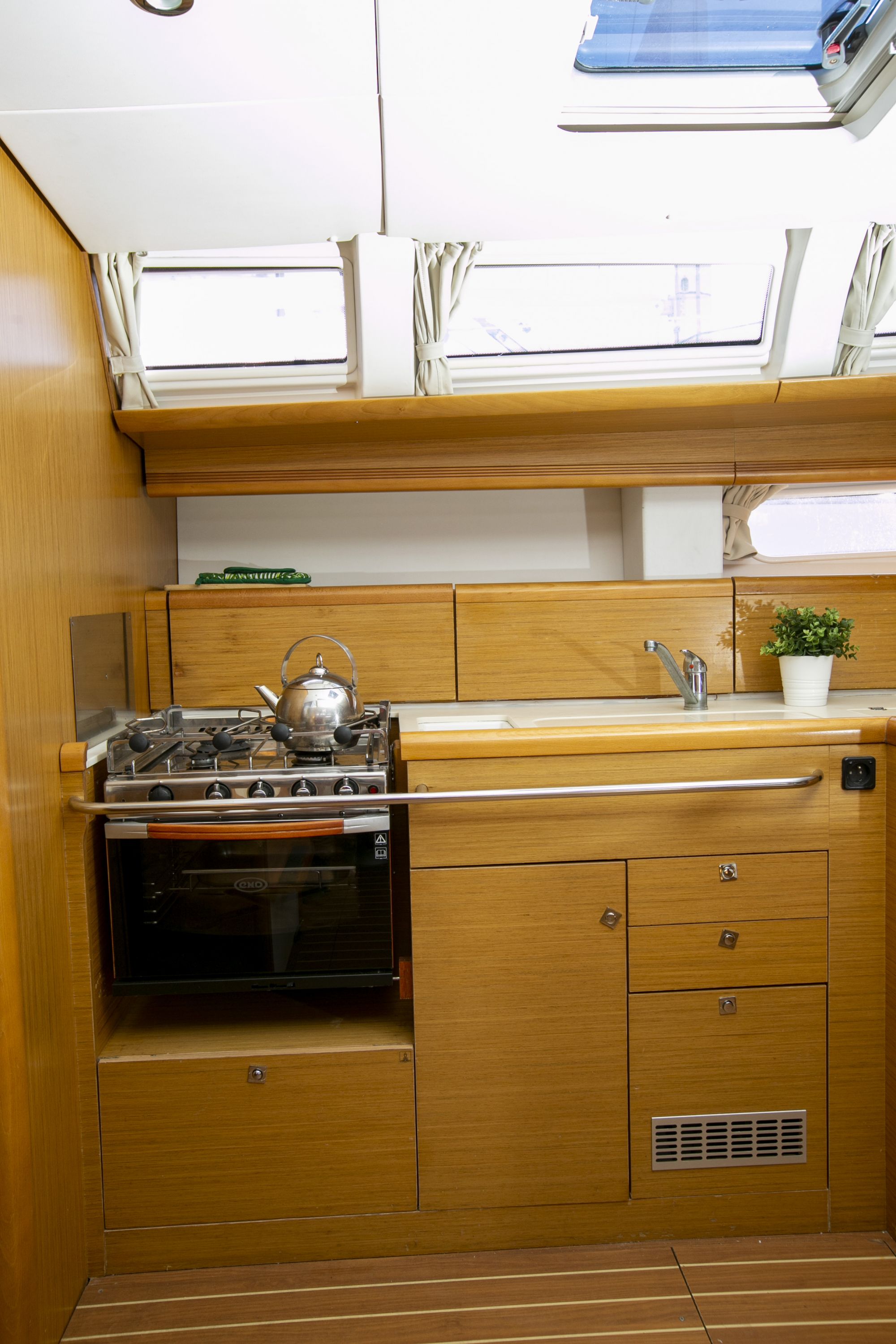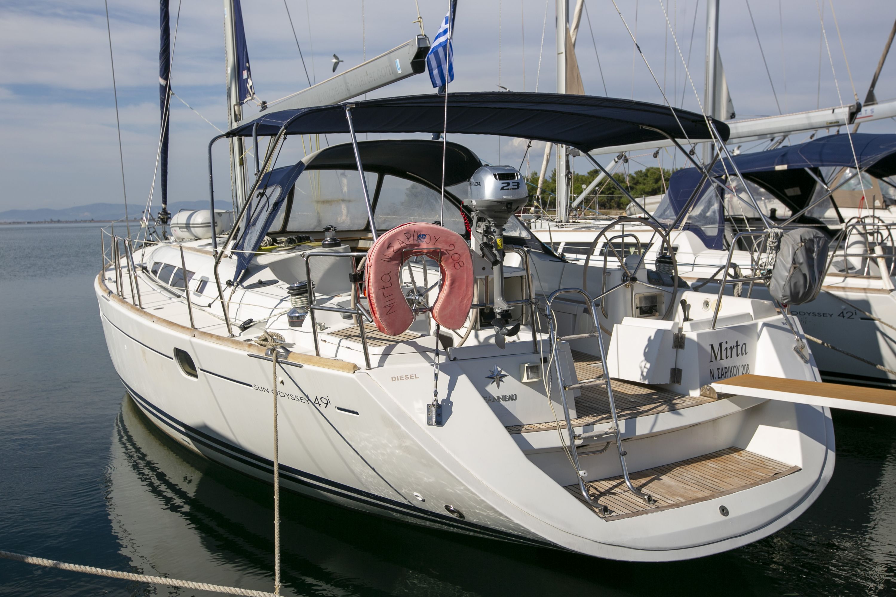 | Outside | 220 V-Landanschluss, Badeleiter, Biminitop, Cockpitdusche, Cockpitlautsprecher, Cockpitpolster, Cockpittisch, elektr. Ankerwinsch, Gangway, Schnorchelausrüstung, Sprayhood, Teak im Cockpit, Wantenschneider |
