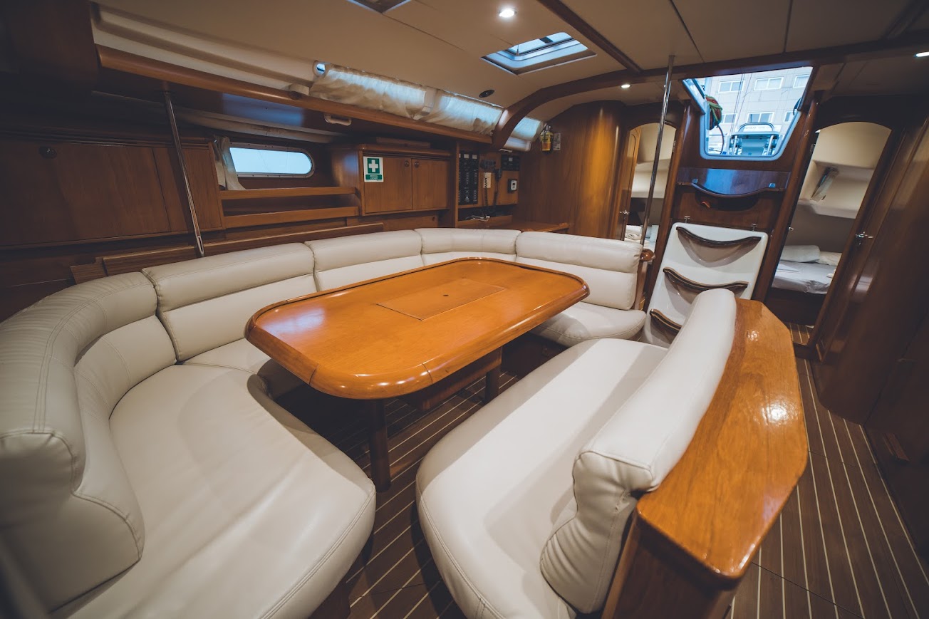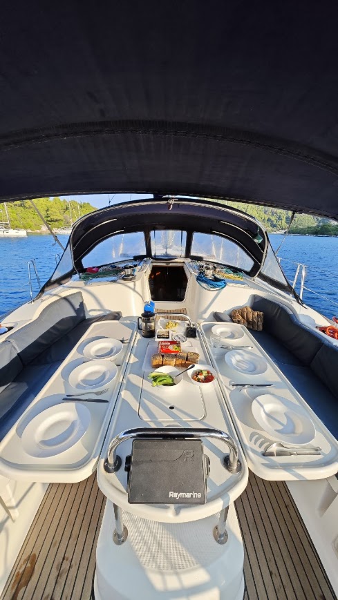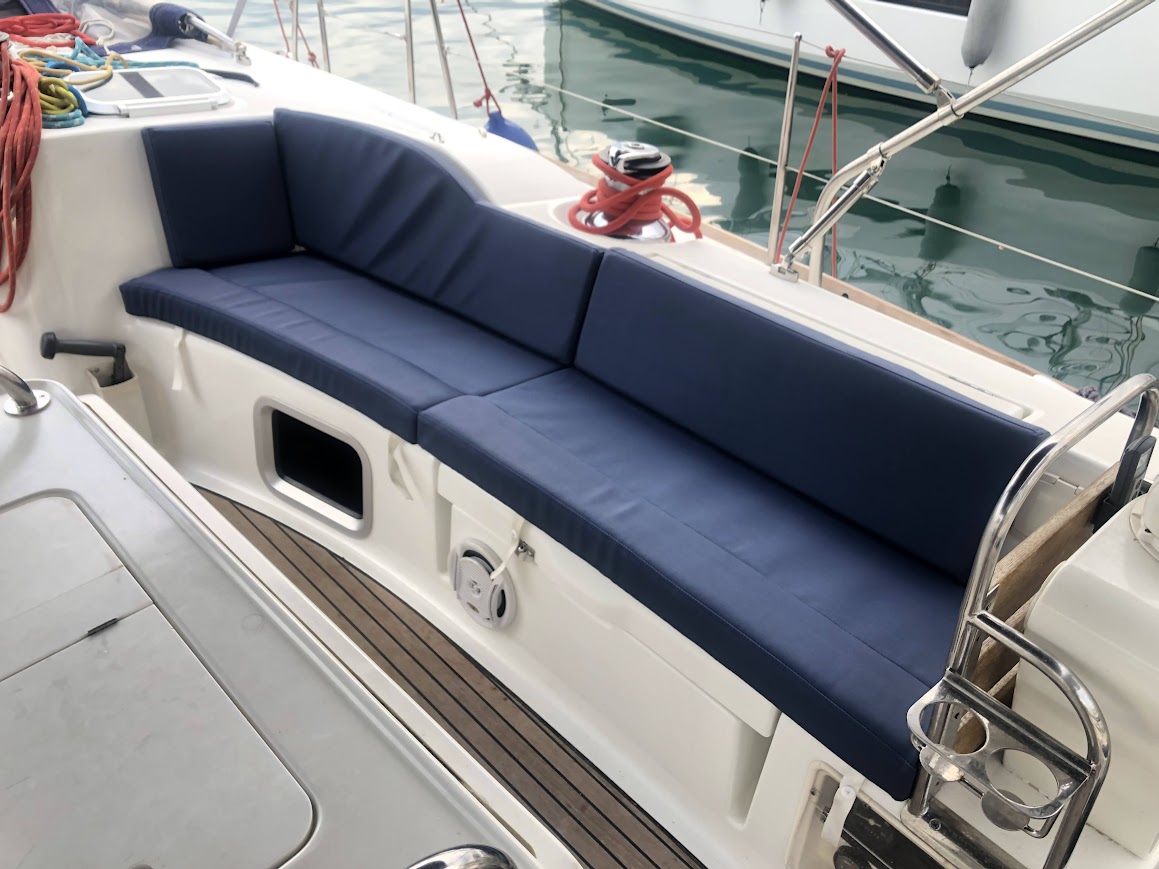 | Outside | Biminitop, Cockpitlautsprecher, Cockpitpolster, elektr. Ankerwinsch, Solaranlage, Sprayhood, Teak im Cockpit |