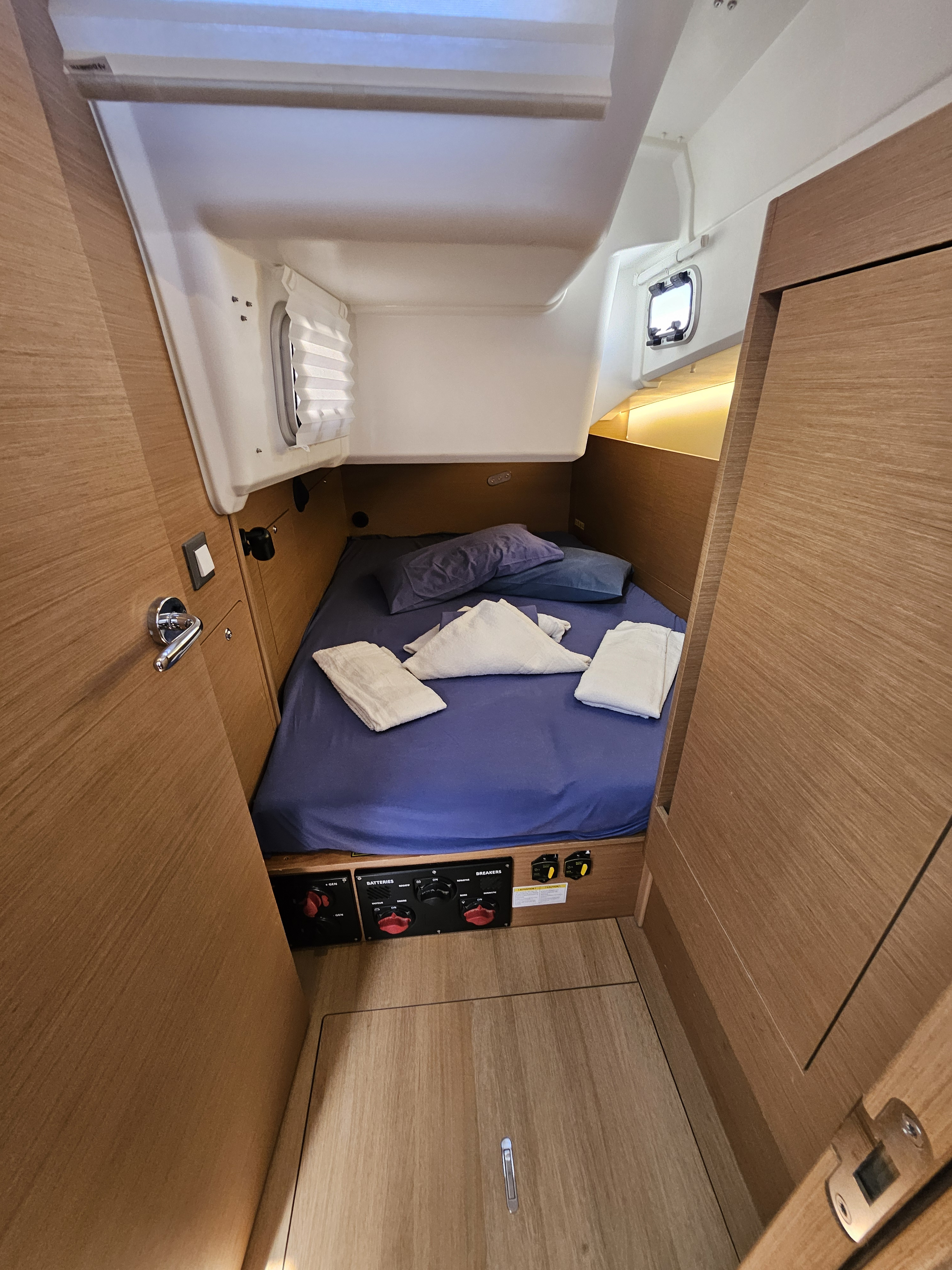 | Safety | Autopilot, Bootsmannstuhl, Bordapotheke, Bordwerkzeug, Bugstrahlruder, elektr. Bilgepumpe, Feststoffschwimmwesten, Feuerlöscher, Handbilgepumpe, Lifebelts, Nebelhorn, Notpinne, Notsignale, Radarreflektor, Rettungsinsel, Rettungskragen, Taschenlampe, UKW-Funk, Zweitanker |