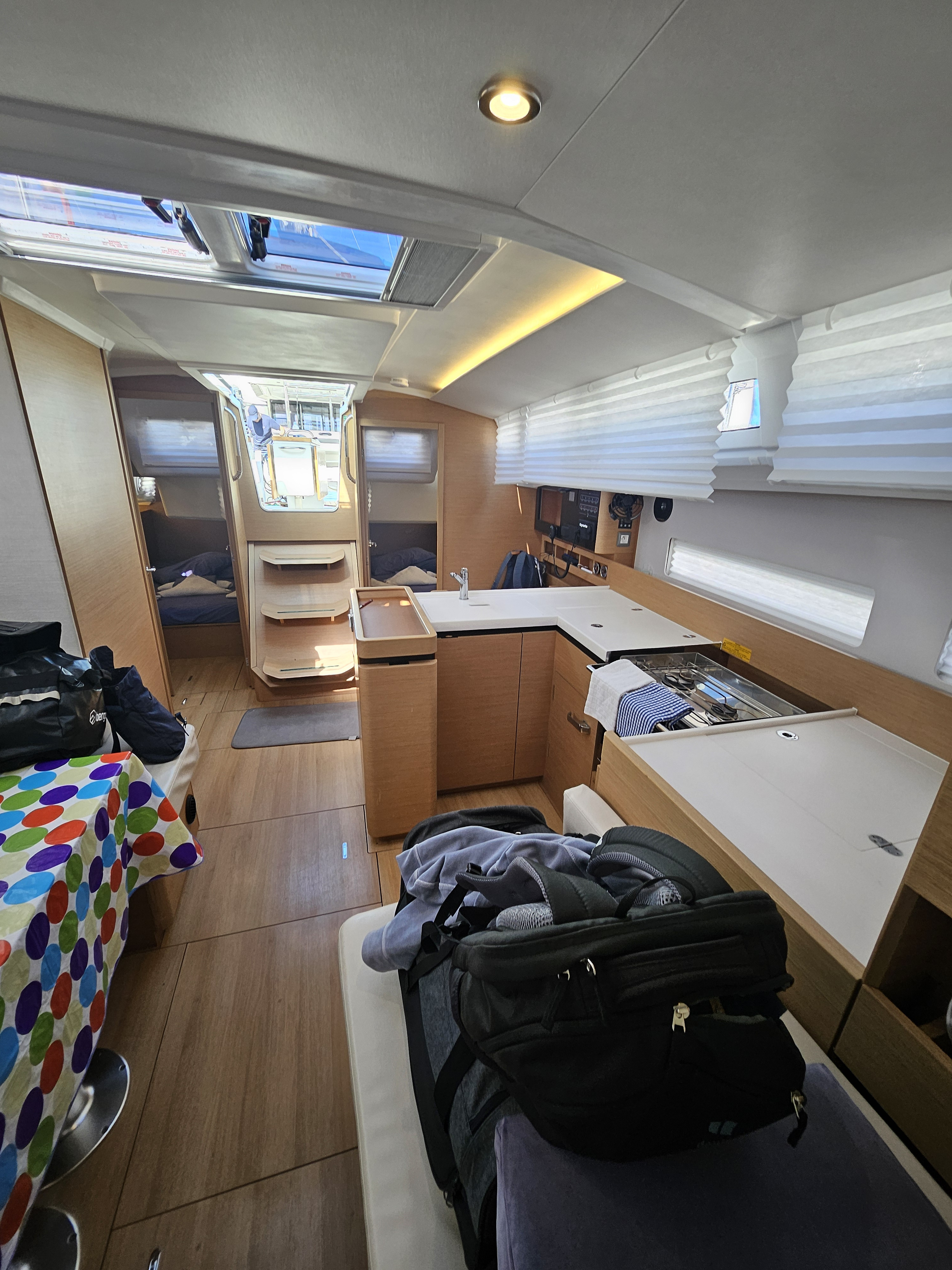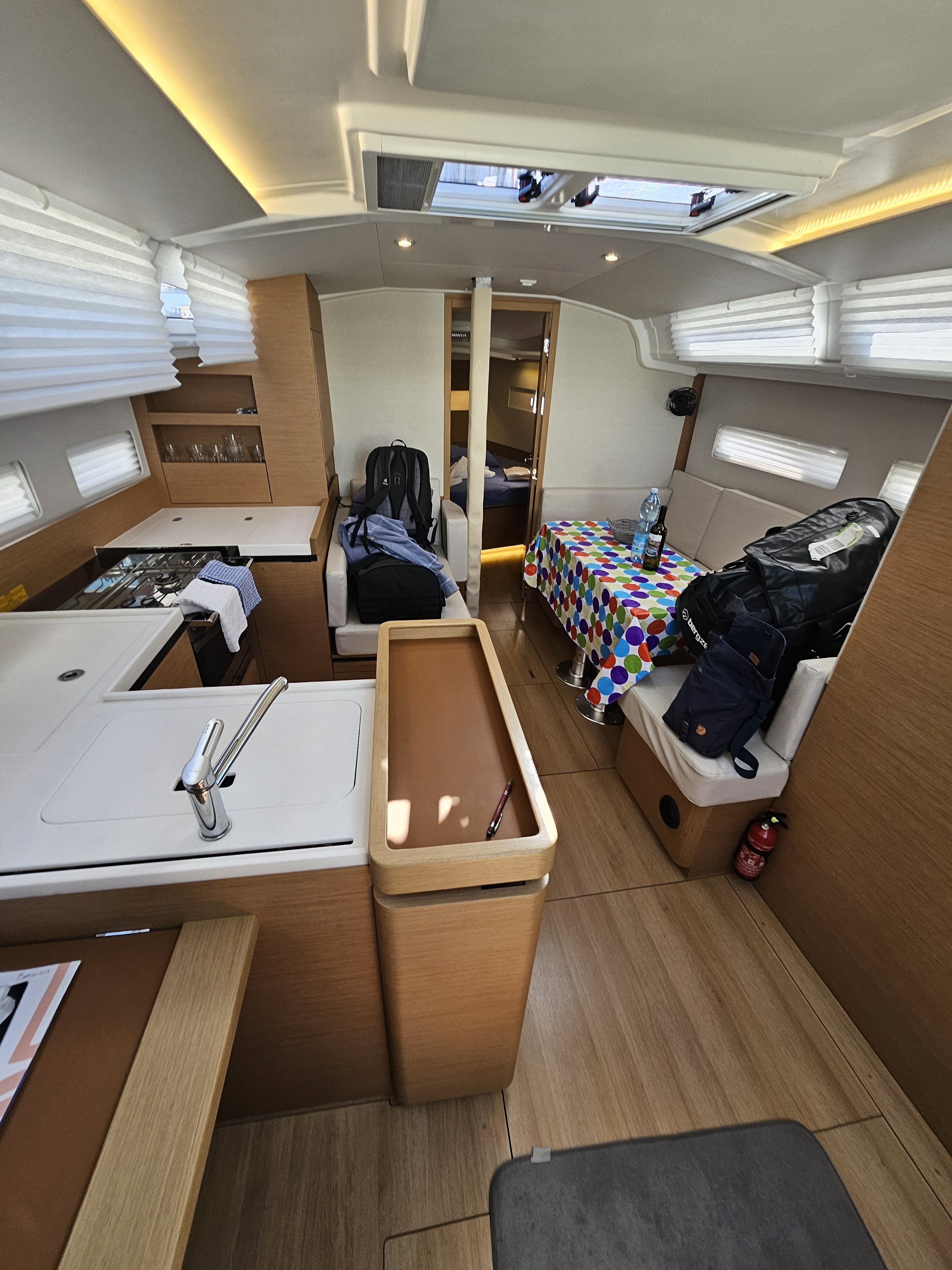Ich war etwas verärgert, da nach einen Tag die Gasflasche leer war. und ich mir im Marinestore im Ort eine kaufen musste Ausserdem stellte ich am 2. Tag fest, dass ein Adapter für Landstrom fehlte. Auch diesen musste ich käuflich erwerben.( in beiden Fällen wurde mir der Kaufpreis erstattet) Daslaufende Gut war sehr scwergängig. (Schoten und Falle sowie Rollen wahrscheinlich vom Salzwasser verkrustet) Für Gut hielt ich die sofortige Bemühungen, die Mängel unverzüglich zu beseitigen. Gröbsten Mangel war: Halterung der Großschreibung war angeschmutzt. Dies wurde aber sofort behoben. Alles in Allem würde ich sagen, viele Dinge lagen nicht am Stützpunkt, sondern an der Kommunikation dei vorherigen Crew mit dem Stützpunkt.