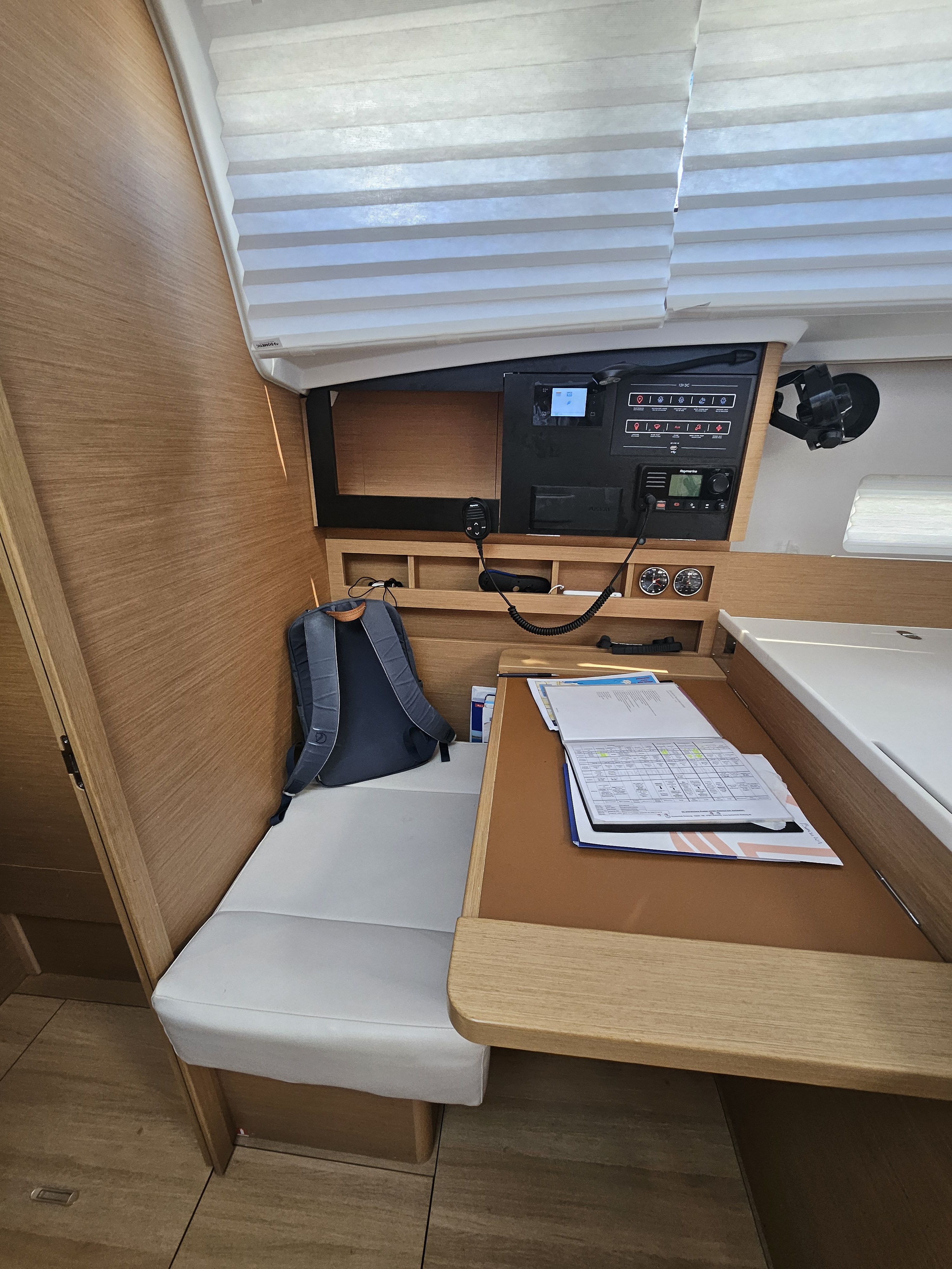 | Navigation | Barometer, Echolot, Fernglas, GPS mit Kartenplotter im Cockpit, Hafenhandbücher, Handpeilkompass, Kompass, Sumlog, Windmesser |
