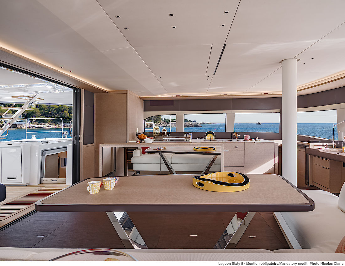| Inside | Entsafter, Gasherd mit Backofen, Generator, Geschirrspüler, Inverter 12V/220V, Kaffeemaschine, Klimaanlage (ohne Landstrombedarf), Kühlschrank mit Gefrierfach, Lautsprecher in Salon und Cockpit, Luftpumpe für Beiboot, Mikrowelle, Toaster, TV, USB Steckdosen in den Kabinen, Ventilatoren in Kabinen, Wasserkocher, Watermaker, WC (elektr.), Weinkühlschrank |