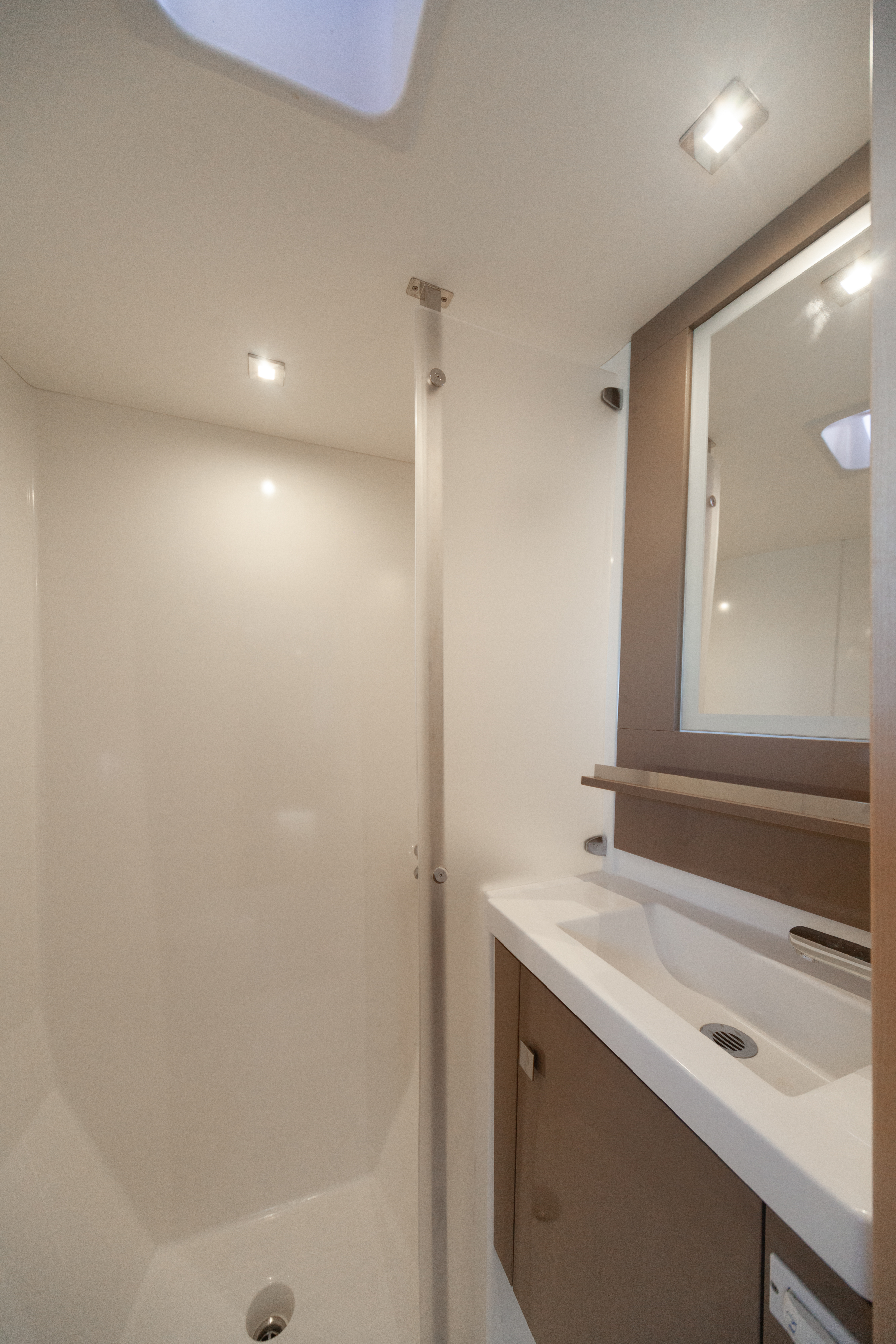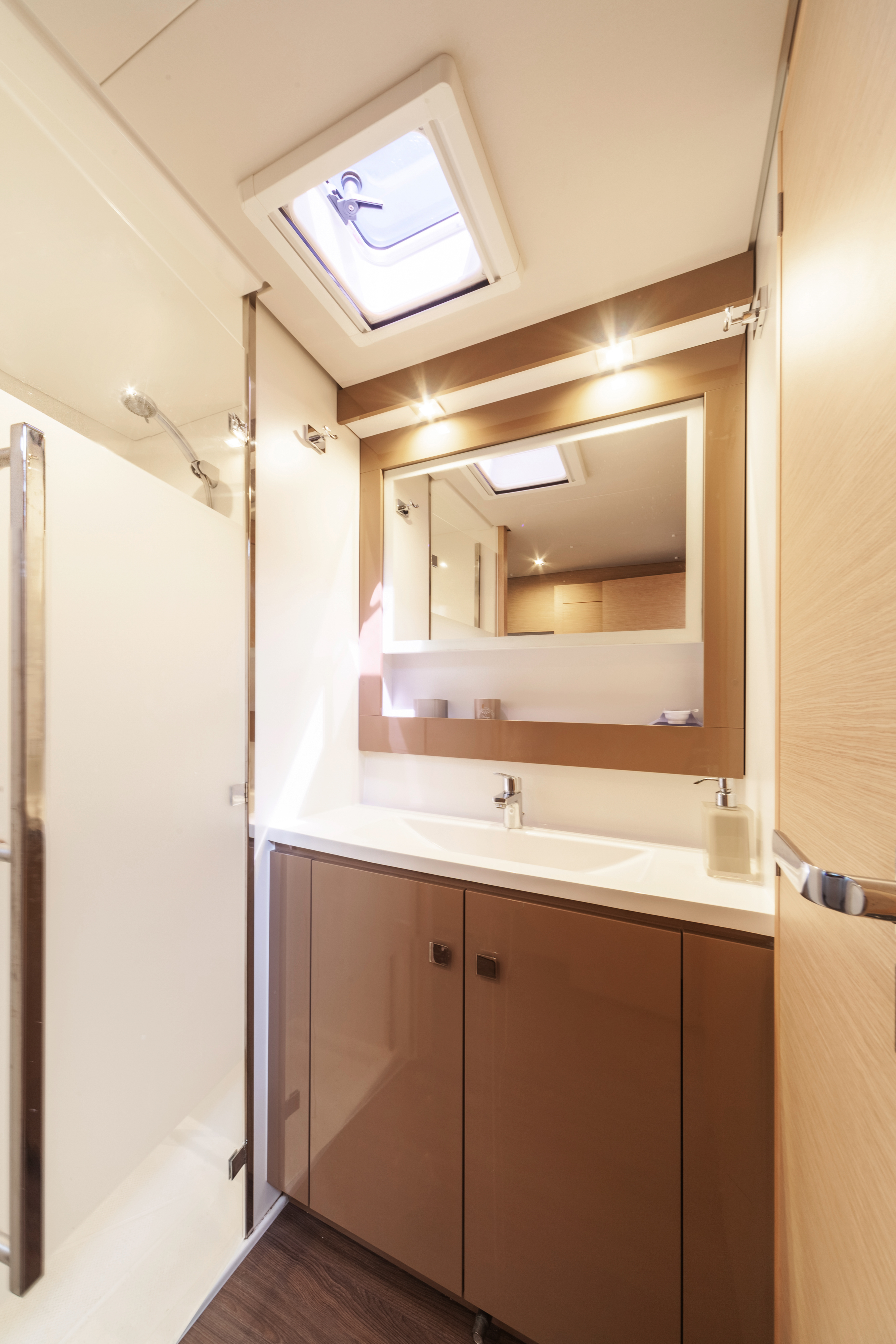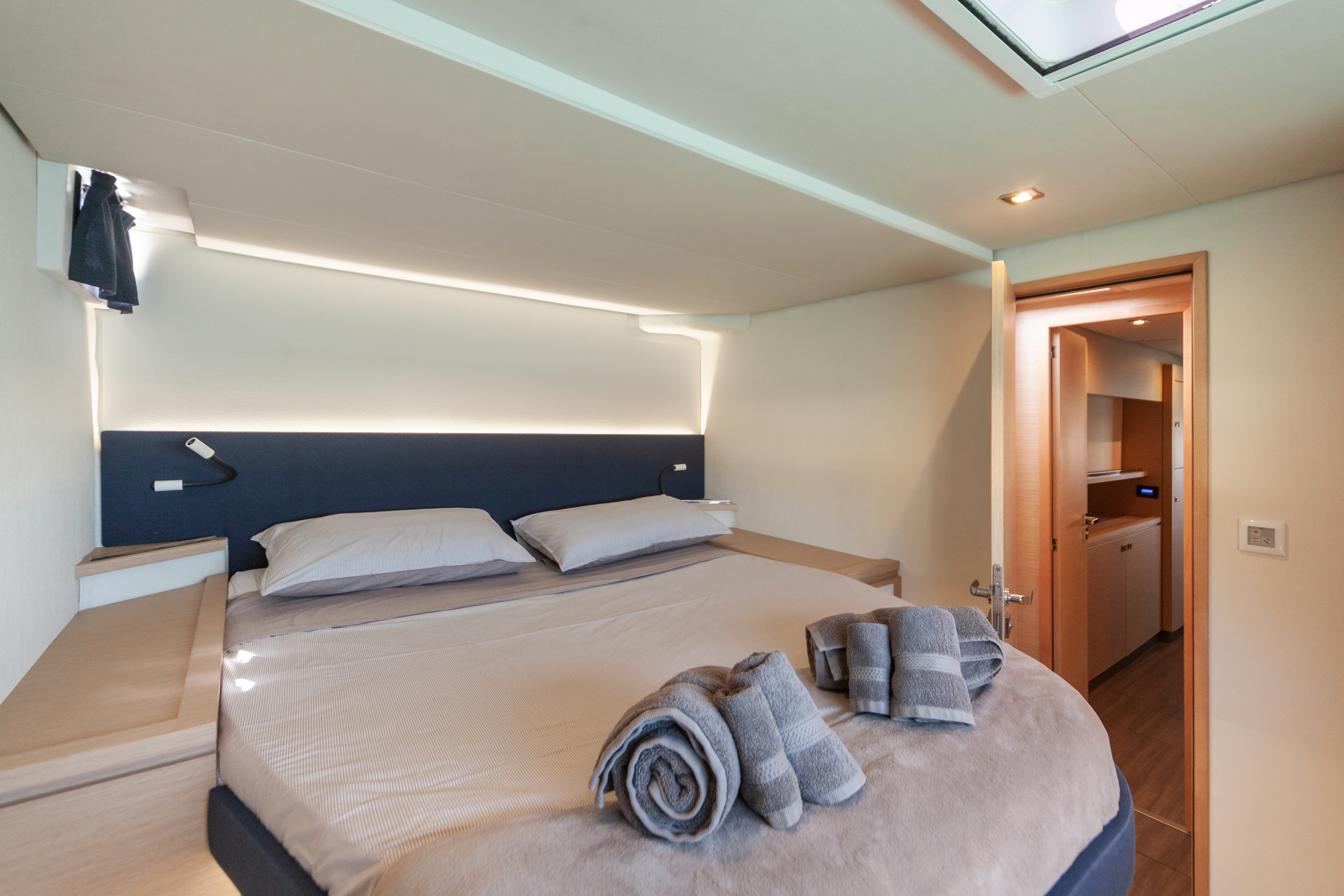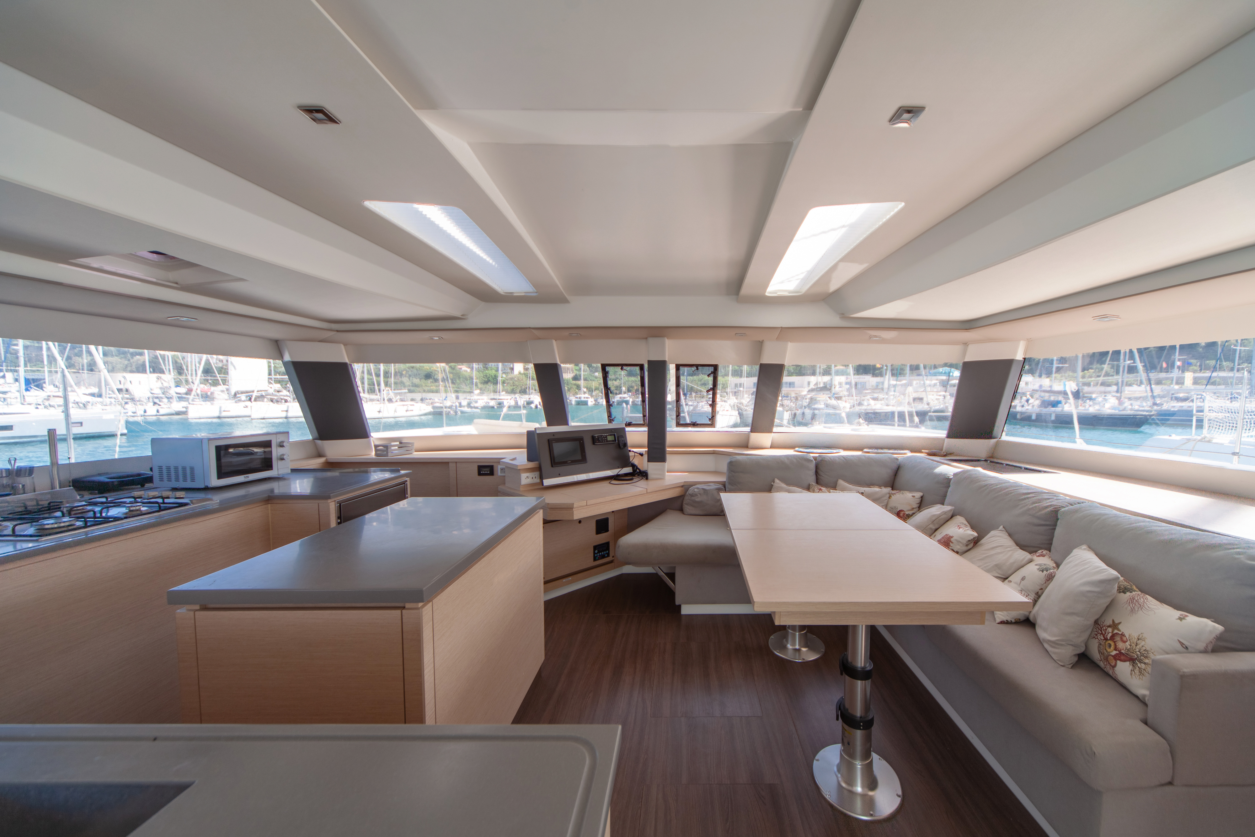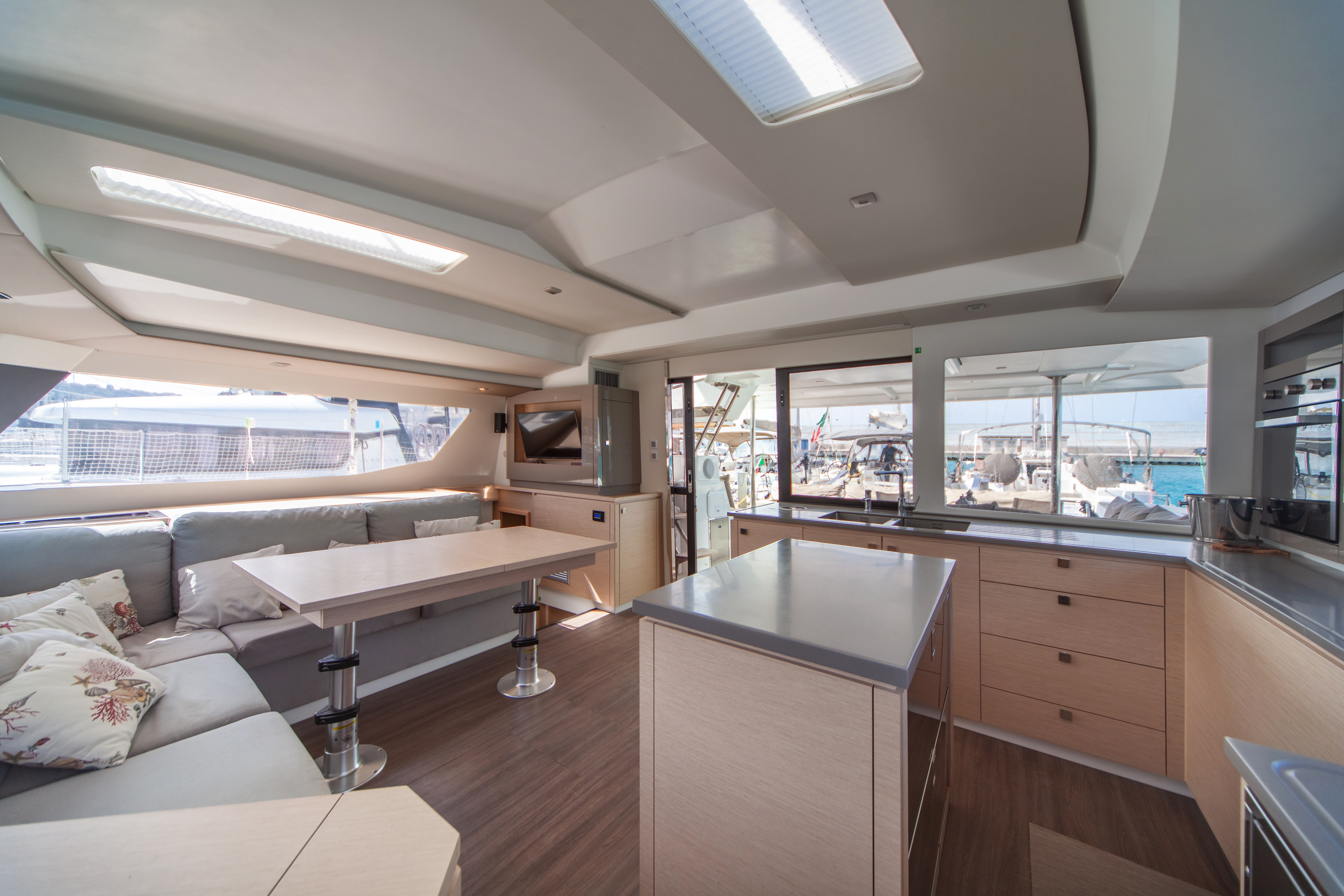 | Inside | 12V Steckdose, Gasherd mit Backofen, Gefrierschrank, Generator, Inverter 12V/220V, Kaffeemaschine, Klimaanlage (ohne Landstrombedarf), Kühlschrank, Mikrowelle, Mixer, Pantryausstattung, Radio mit Bluetooth, TV, Ventilatoren in Salon und Kabinen, Warmwasser, Watermaker, WC (elektr.) |