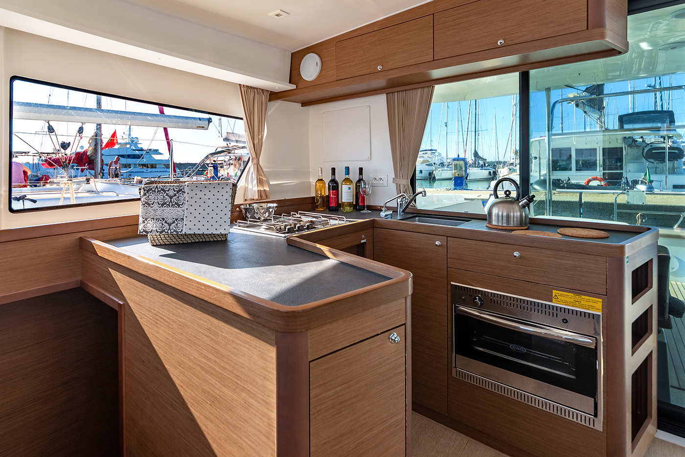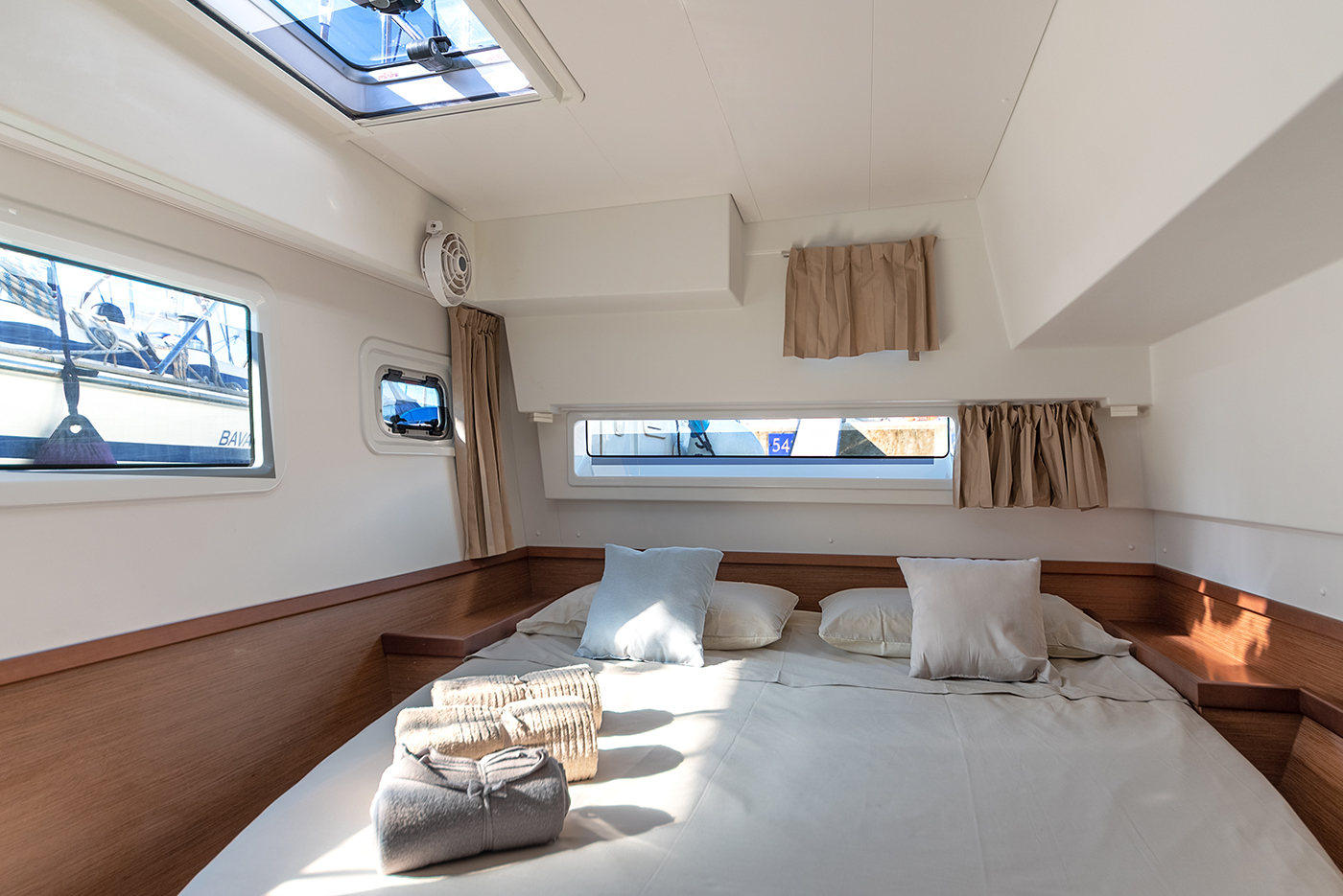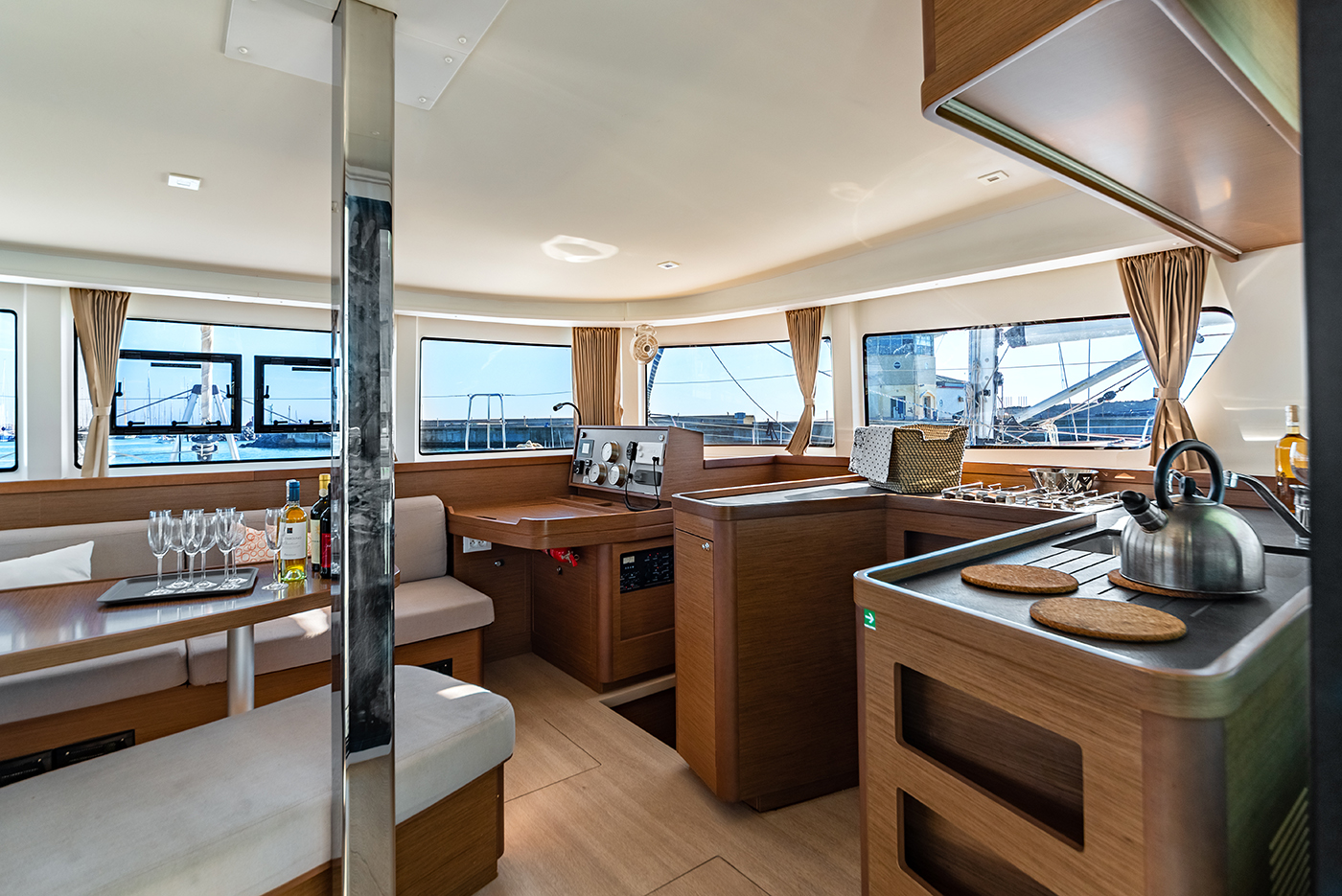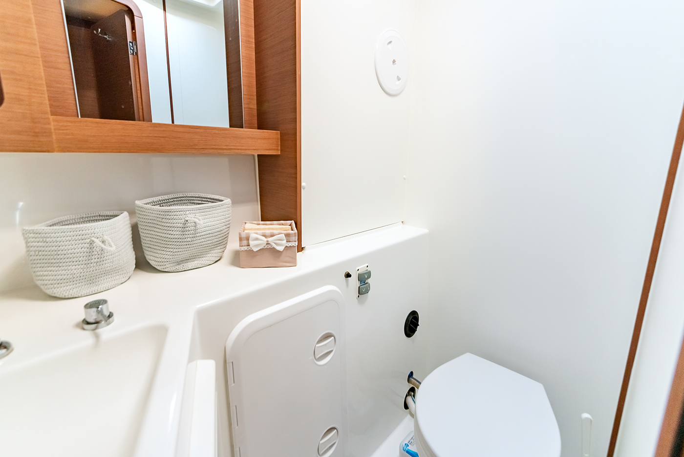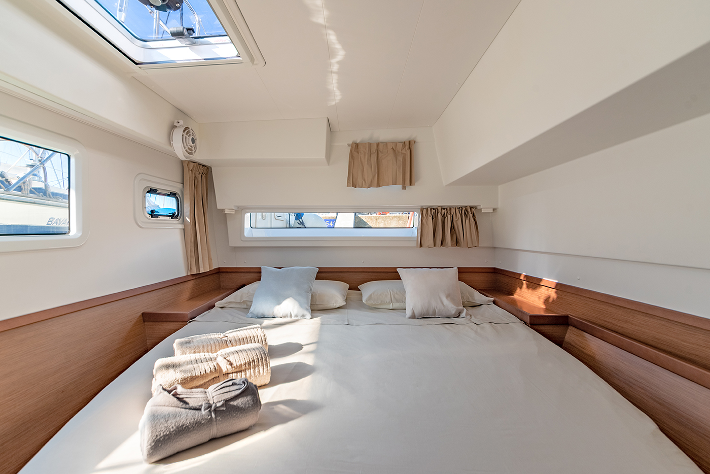 | Inside | Gefrierschrank, Generator, Inverter 12V/220V, Kühlschrank, Ladegerät, Mikrowelle, Nespresso-Maschine, Radio mit CD, Warmwasser, Watermaker, WC (elektr.) |
