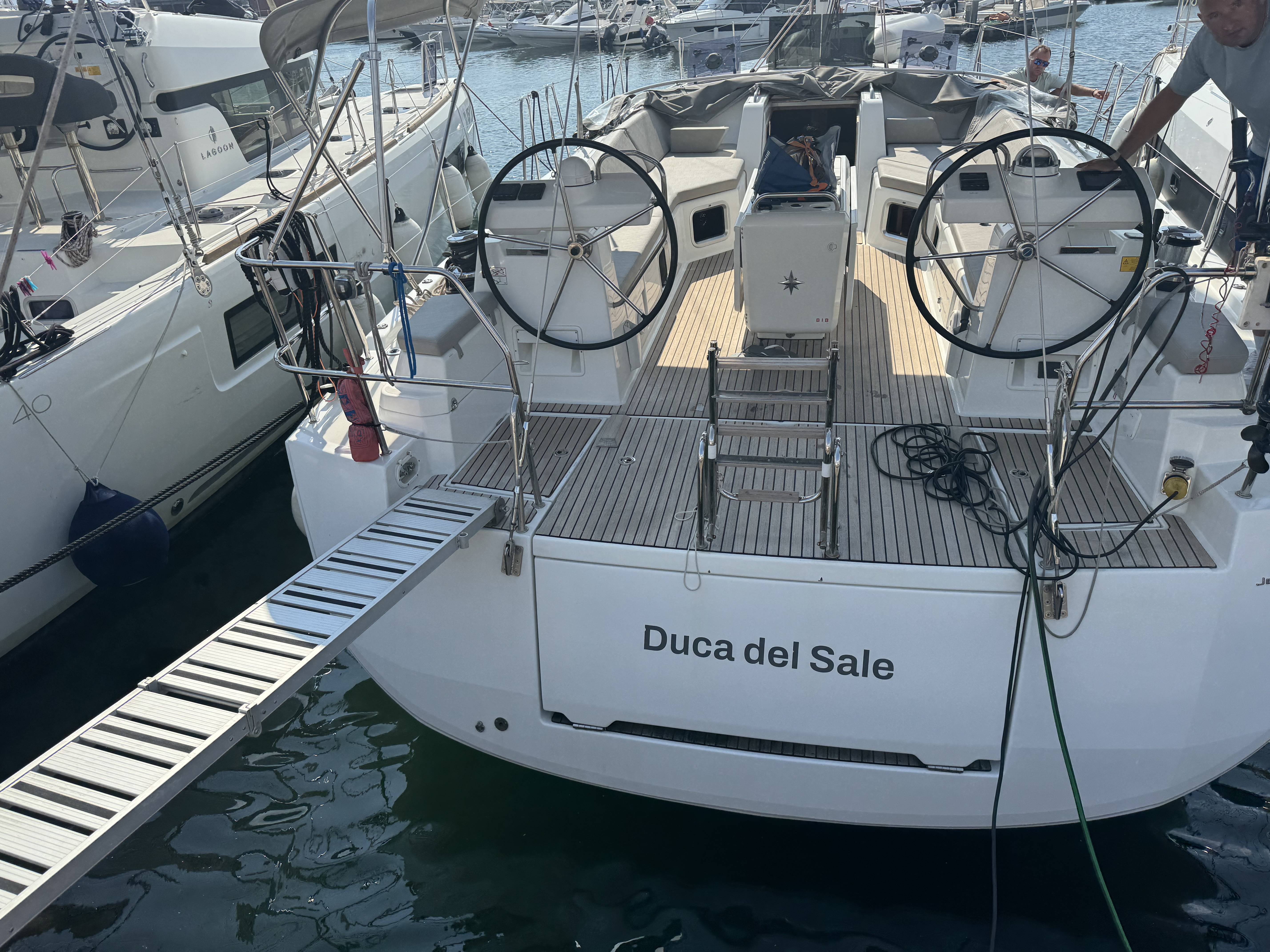 | Outside | 220 V-Landanschluss, Anker mit Kette, Badeplattform elektr., Biminitop, Cockpitdusche, Cockpitlautsprecher, elektr. Ankerwinsch, elektr. Winsch, Sprayhood, Teak im Cockpit |