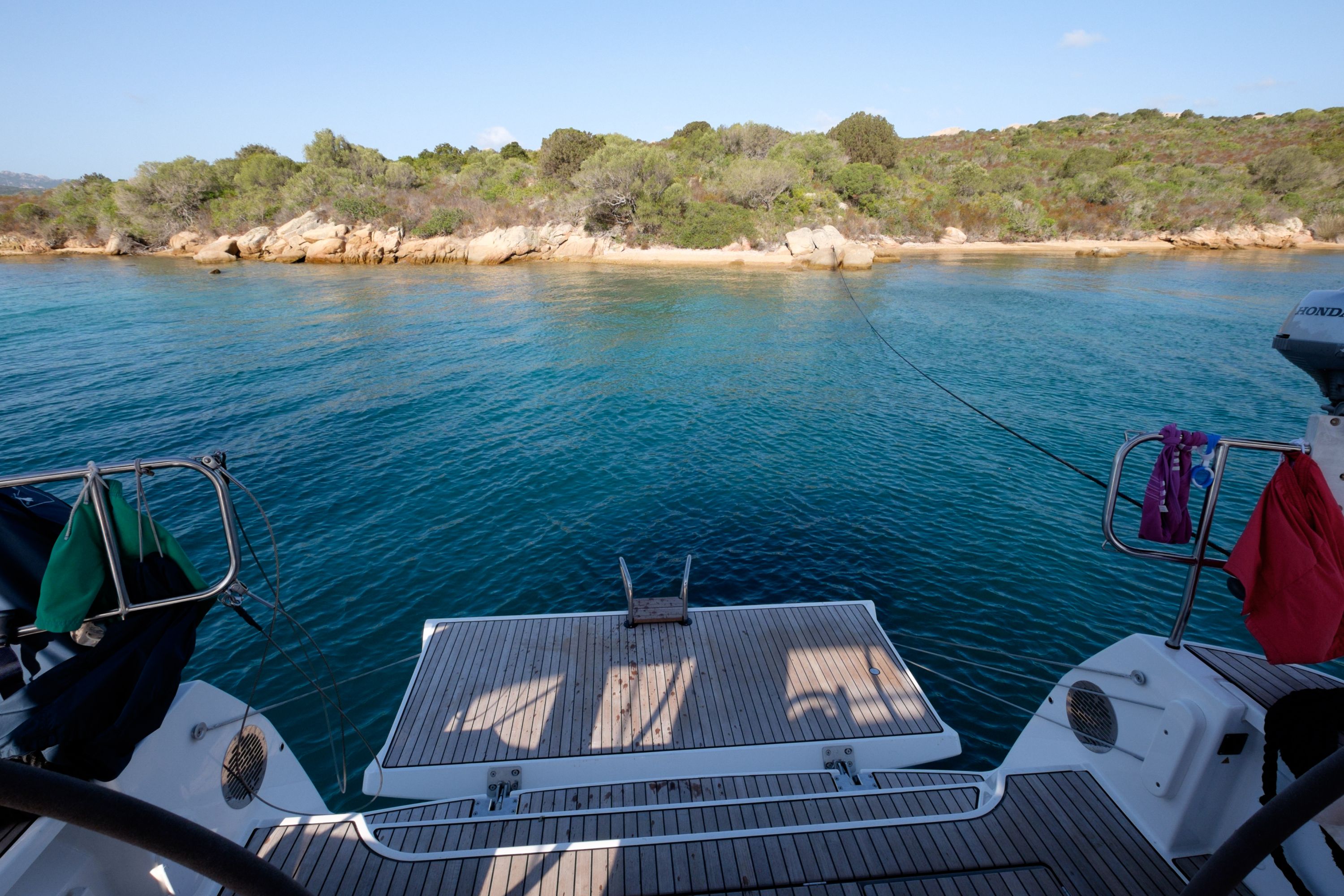 | Outside | Badeplattform, Biminitop, Cockpitdusche, Cockpitlautsprecher, Cockpitpolster, elektr. Ankerwinsch, Sprayhood, Teak im Cockpit, Teakdeck |