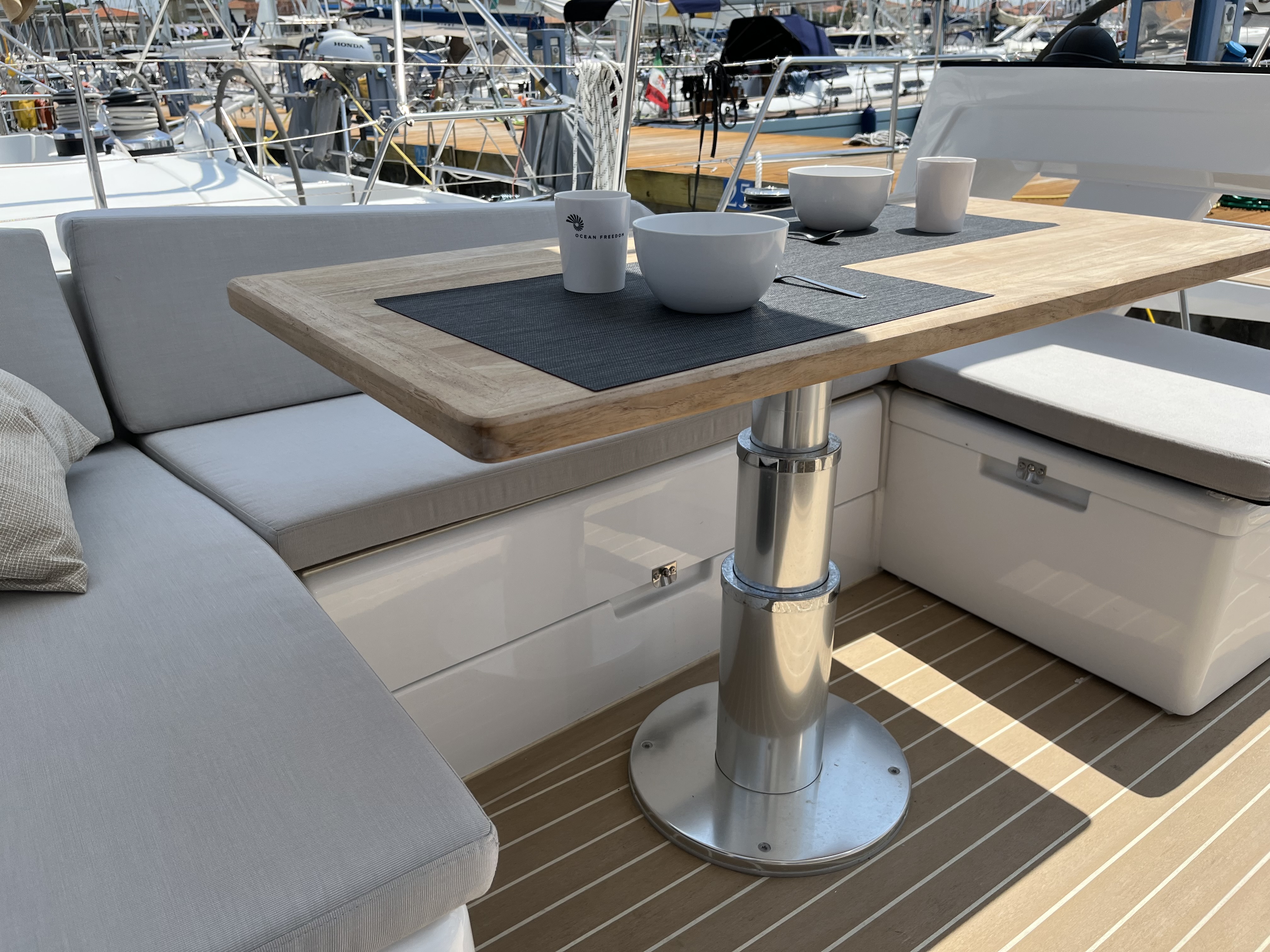| Outside | Badeplattform, Cockpitpolster, Cockpittisch, elektr. Ankerwinsch, Hardtop, Solaranlage, Sprayhood |