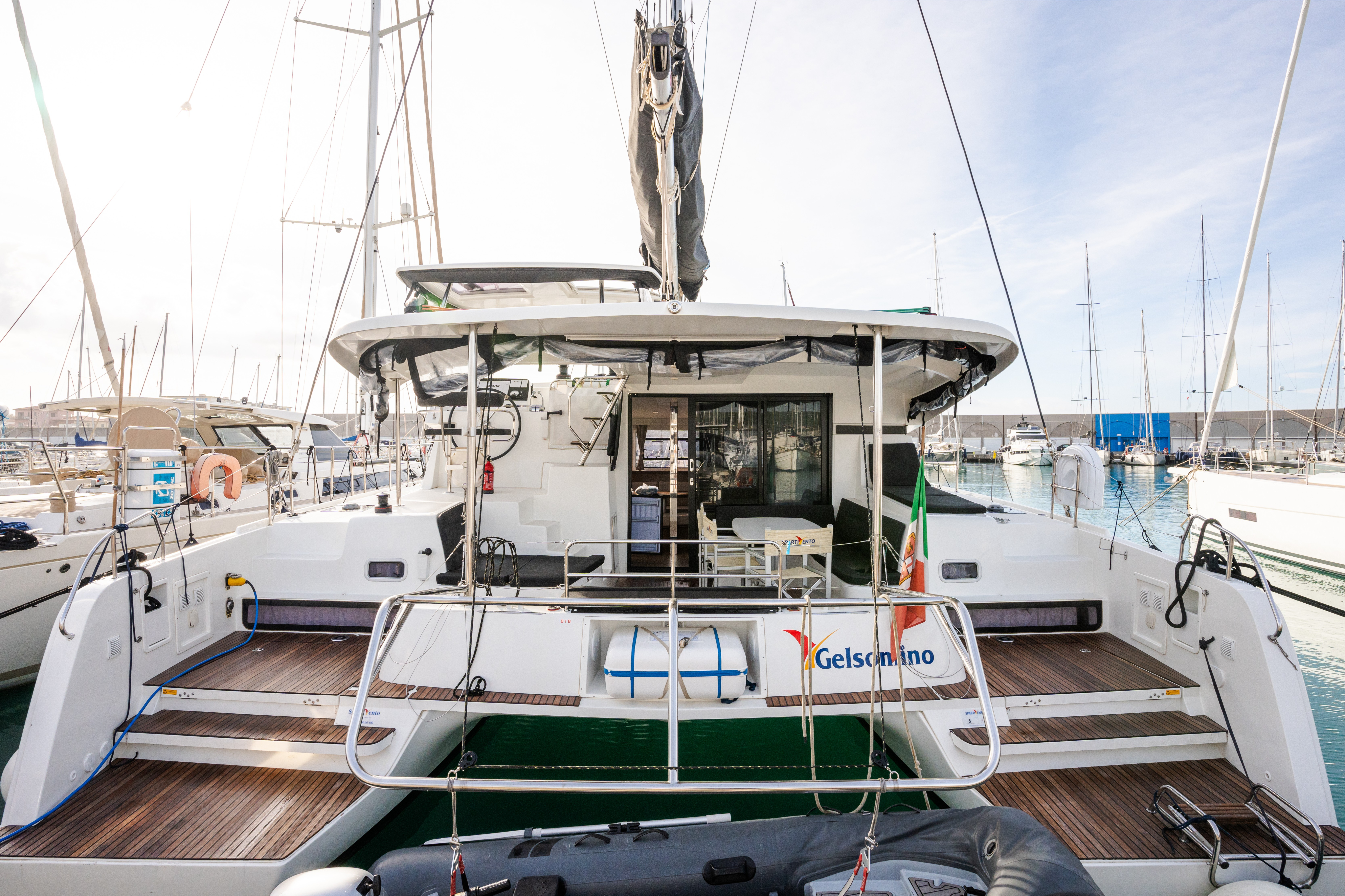 | Inside | Gasherd mit Backofen, Generator, Inverter 12V/220V, Klimaanlage (ohne Landstrombedarf), Kühlschrank, Landstromkabel, Luftpumpe für Beiboot, Mikrowelle, USB Steckdose, Ventilator, Warmwasser, Watermaker, WC (elektr.) |