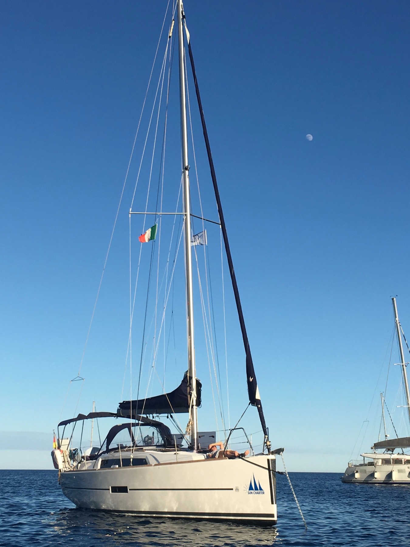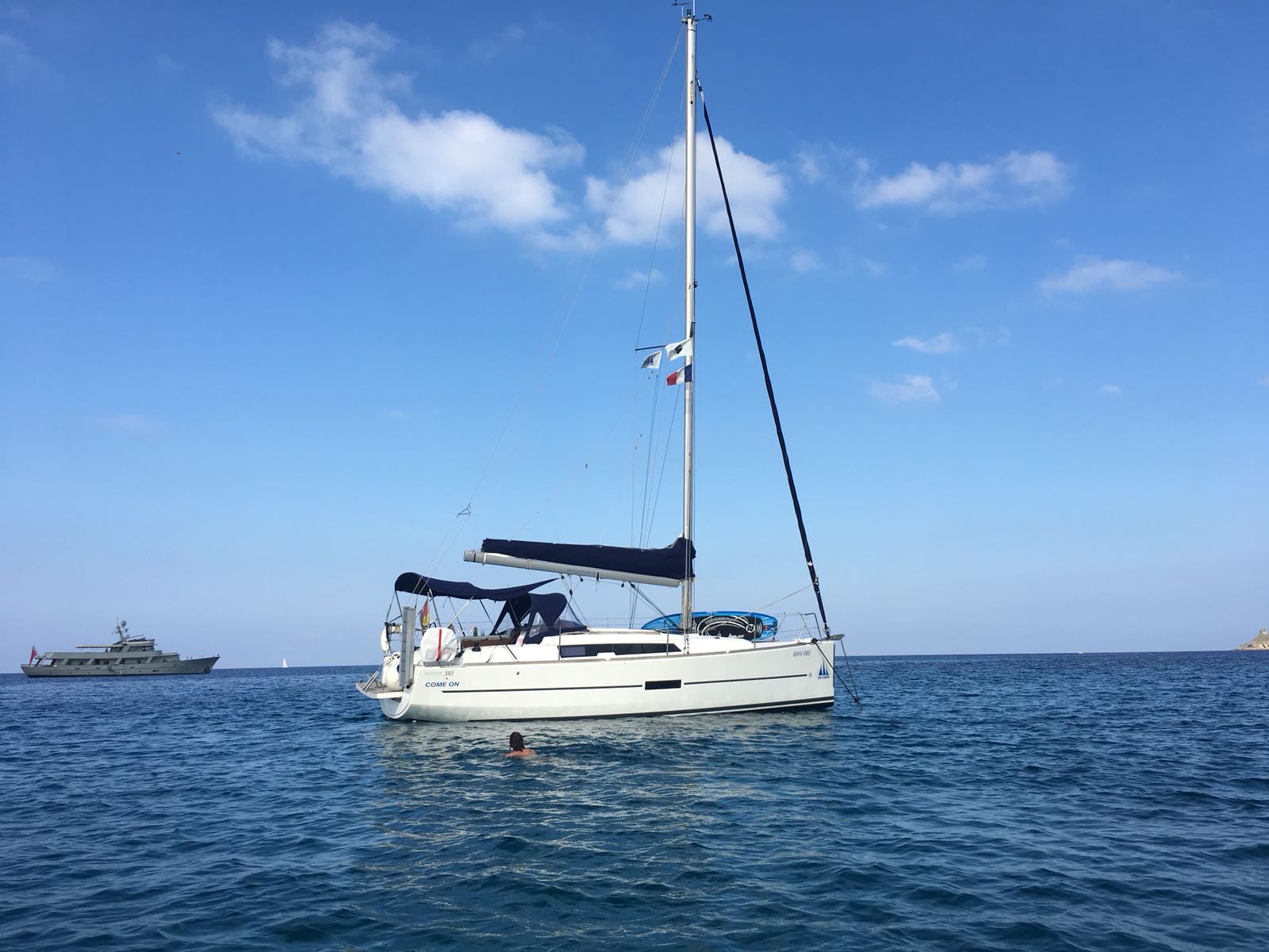 | Outside | 220 V-Landanschluss, Anker mit Kette, Ankerwinsch, Biminitop, Bootshaken, Cockpitdusche, Cockpitlautsprecher, Cockpitpolster, Cockpittisch, Dieselkanister , elektr. Ankerwinsch, Fender, Festmacherleinen, Gangway, Kugelfender, Kunststoff-Eimer (Pütz), Lifeline System, Sprayhood, Teak im Cockpit, Wantenschneider, Wasserkanister , Wasserschlauch, Windex |