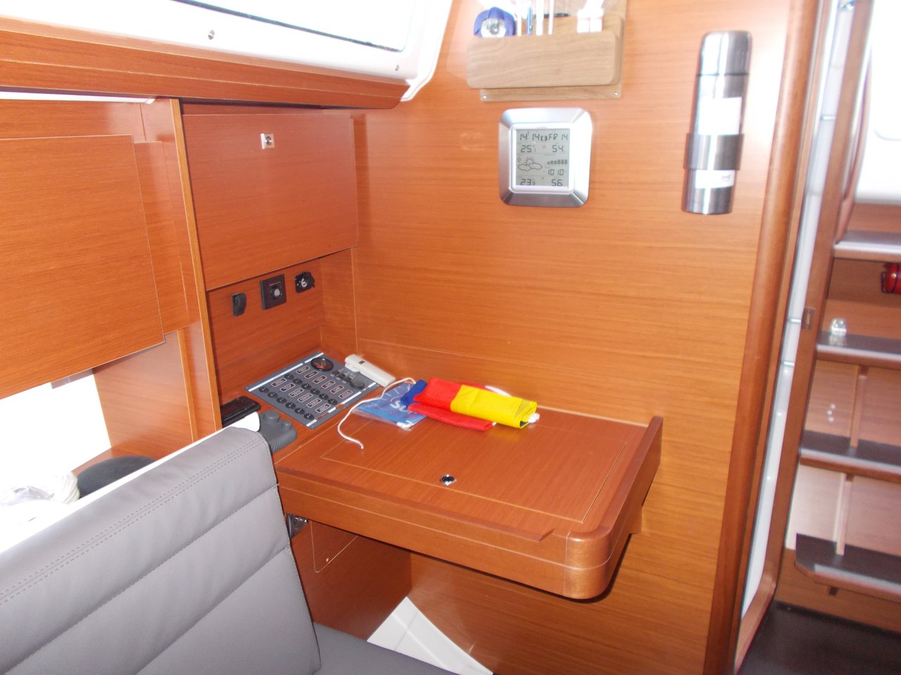 | Navigation | Barometer, Fernglas, GPS mit Kartenplotter im Cockpit, Hafenhandbücher, Handpeilkompass, Navigationsbesteck, Seekarten, Tridata (Log, Echolot, Windm.) |