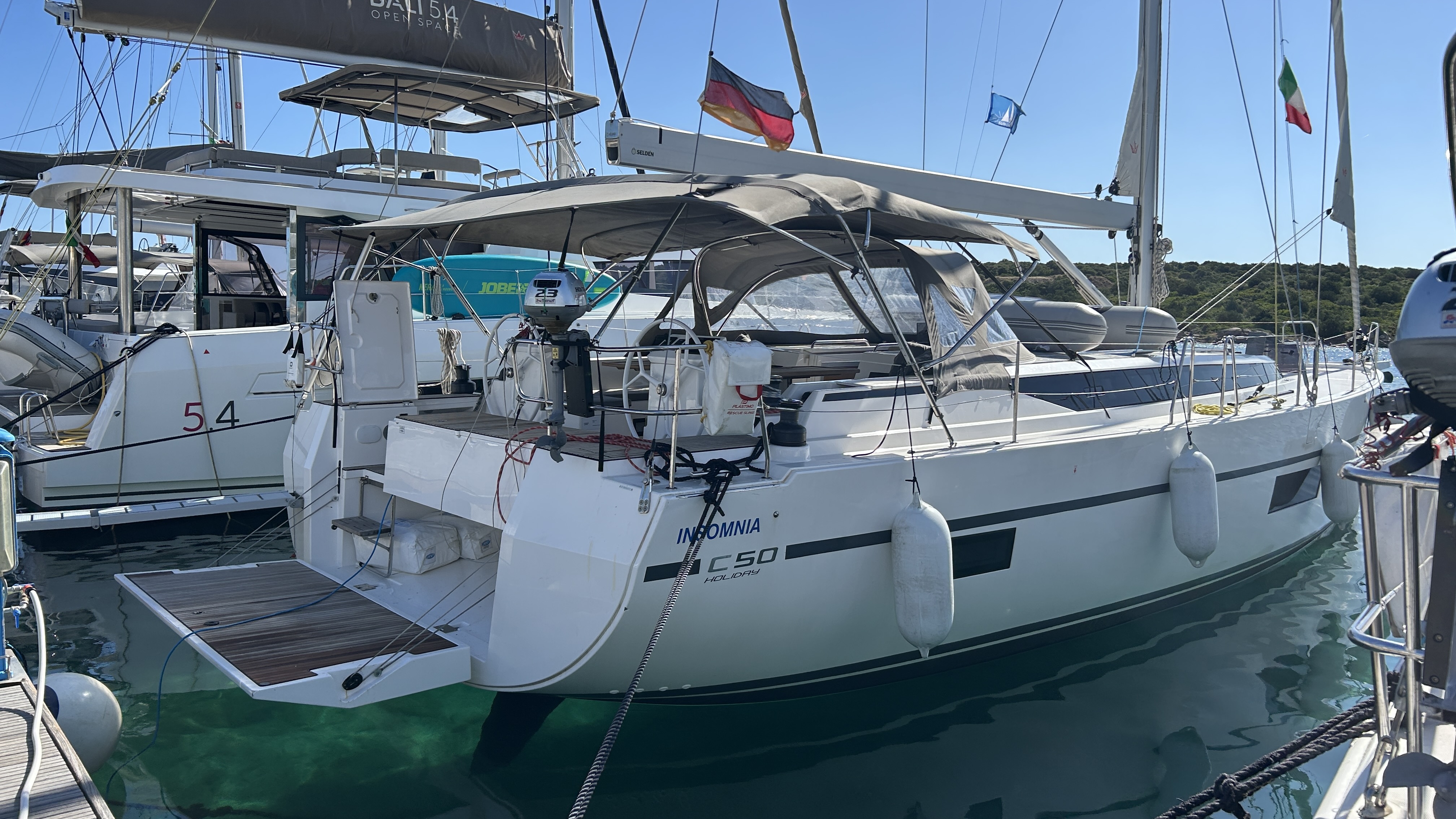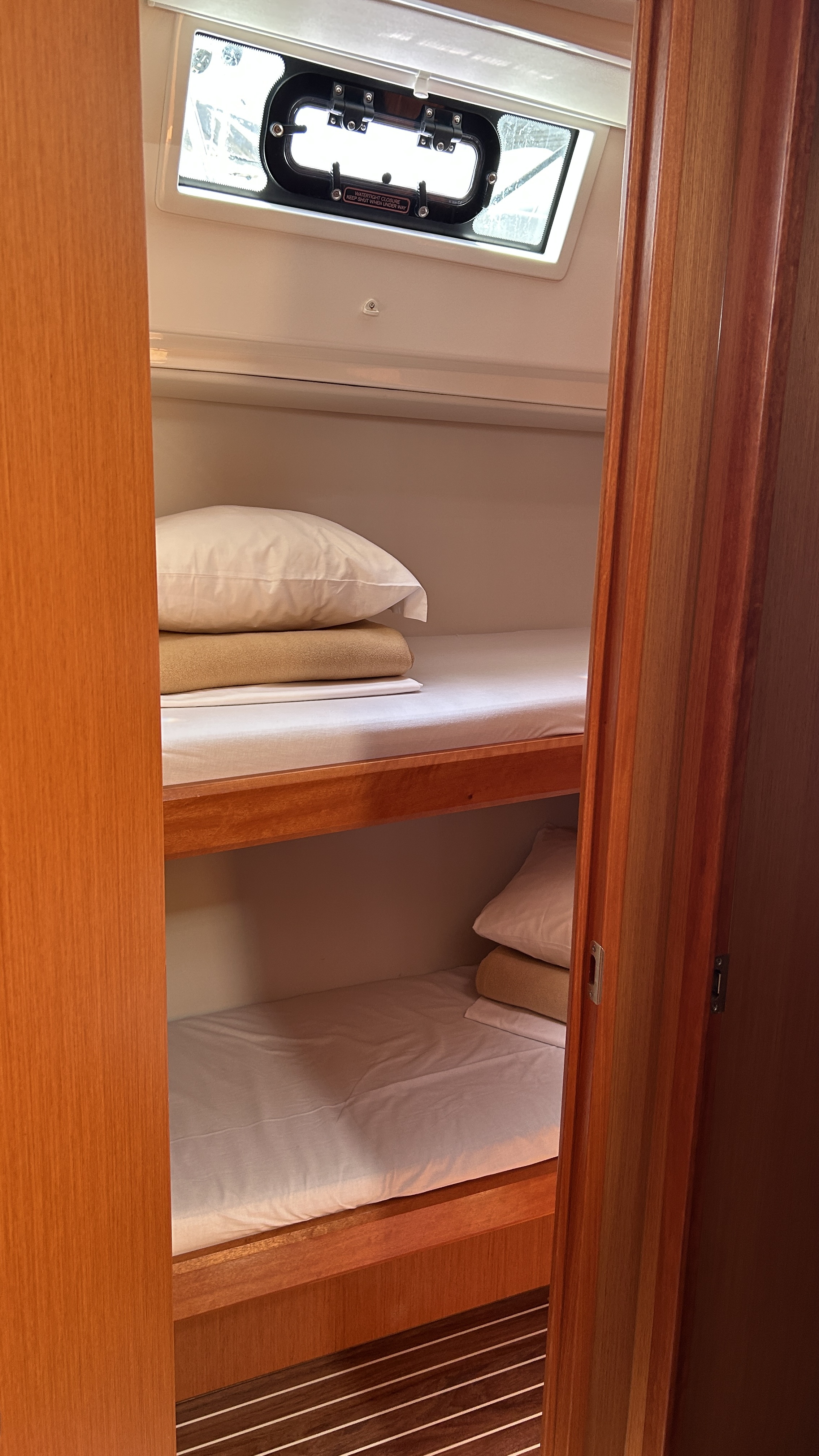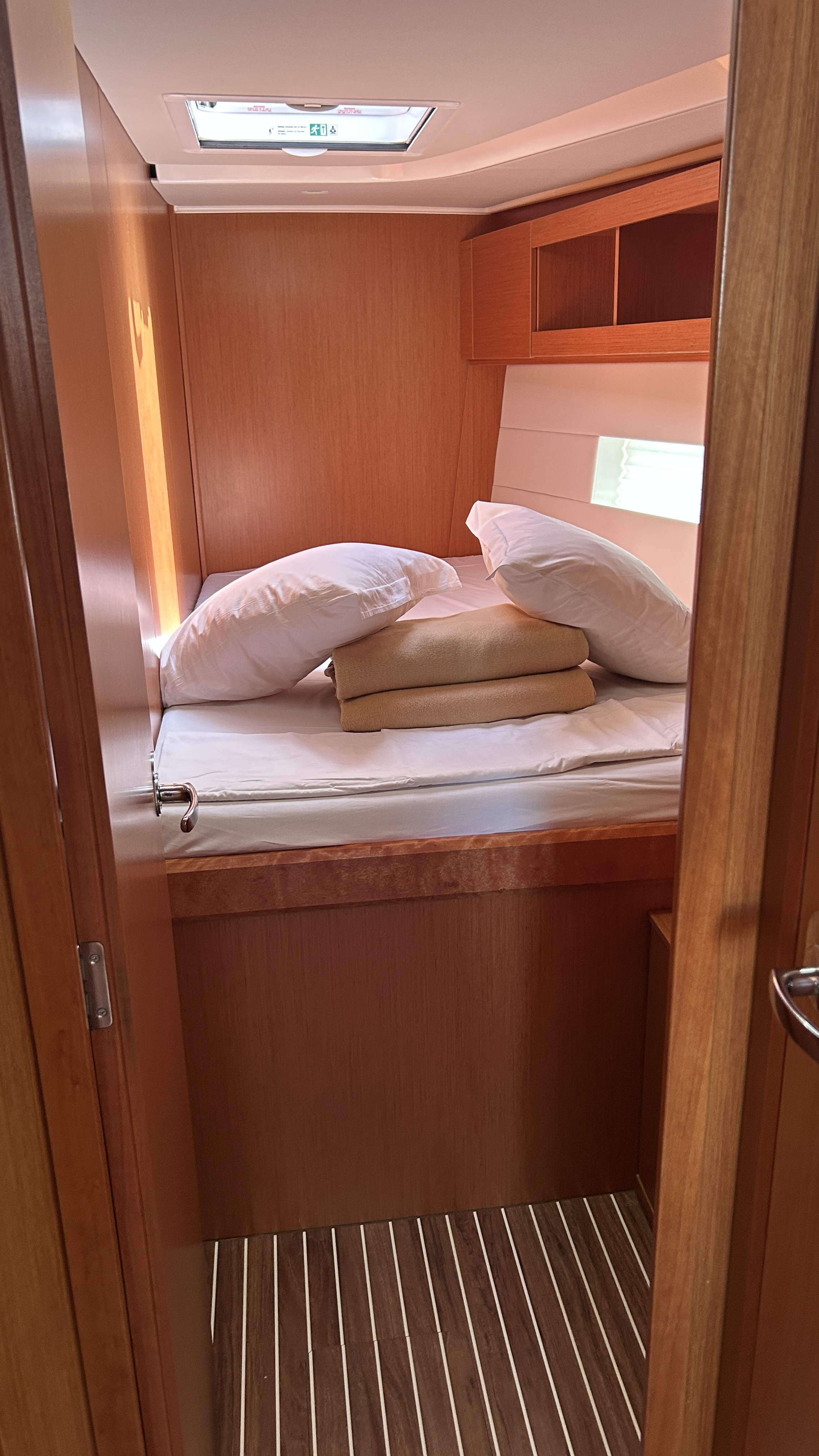| Safety | Automatikwesten, Autopilot, Blitzboje, Bootsmannstuhl, Bordapotheke, Bordwerkzeug, Bugstrahlruder, Feuerlöscher, Lifebelts, Motor-Ersatzteile, Nebelhorn, Notsignale, Radarreflektor, Reparaturset für Beiboot, Rettungsinsel, Suchscheinwerfer, Taschenlampe, UKW-Funk mit AIS, Zweitanker |