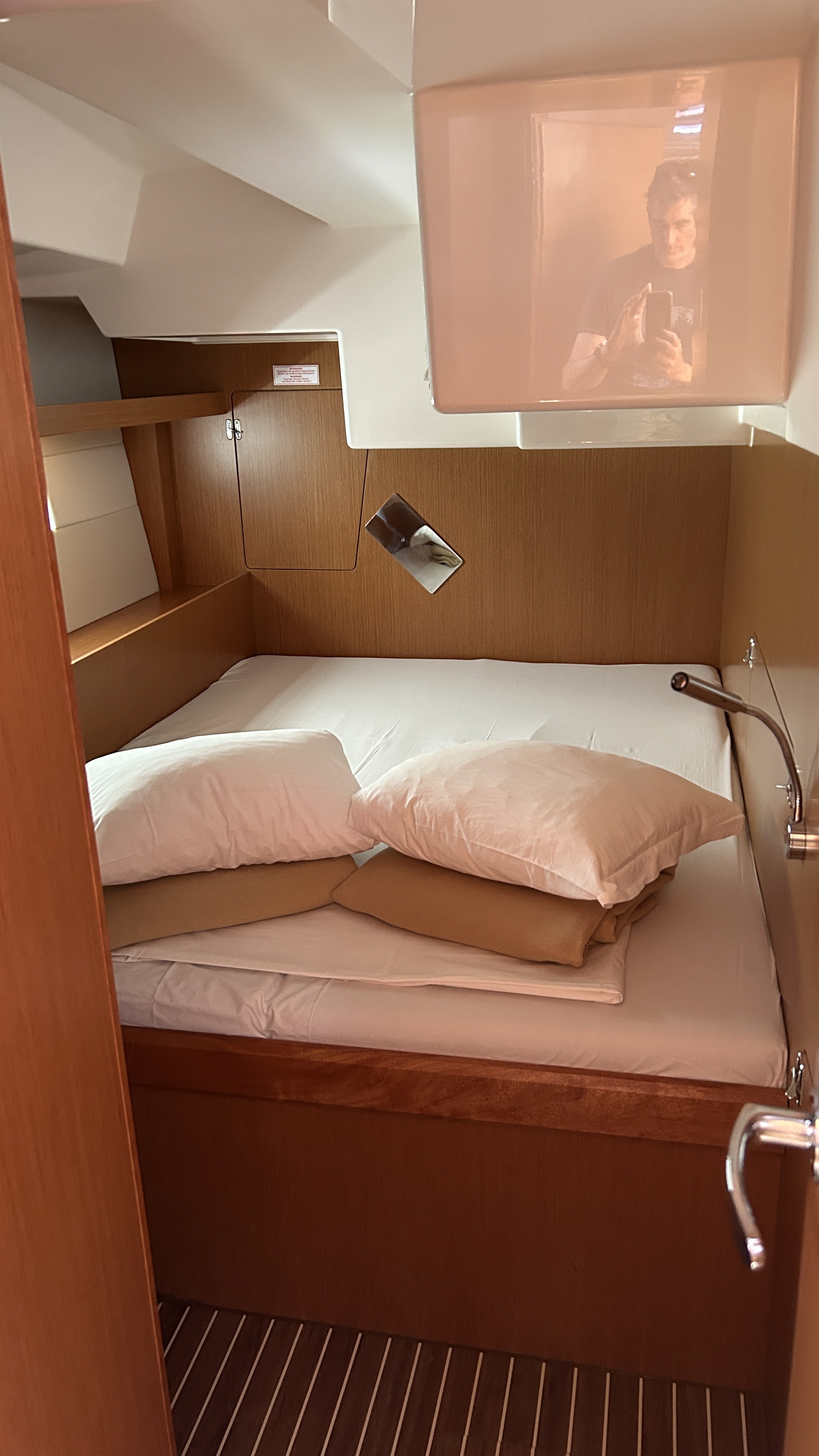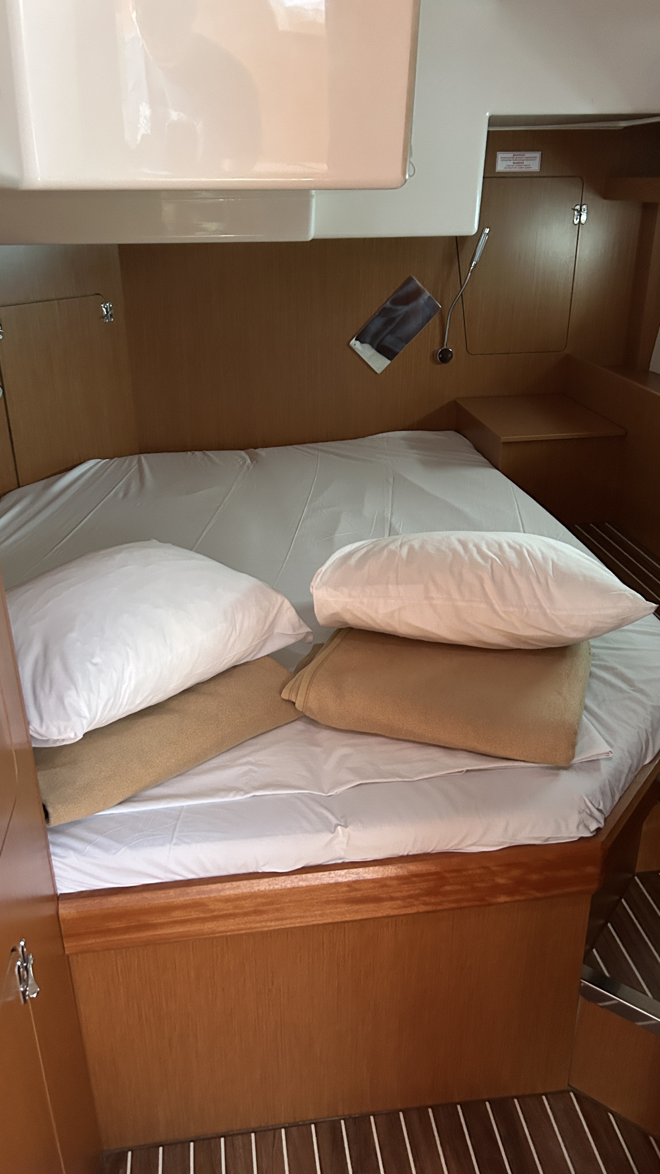 | Navigation | Barometer, Fernglas, GPS mit Kartenplotter im Cockpit, Hafenhandbücher, Handpeilkompass, Navigationsbesteck, Seekarten, Tridata (Log, Echolot, Windm.) |