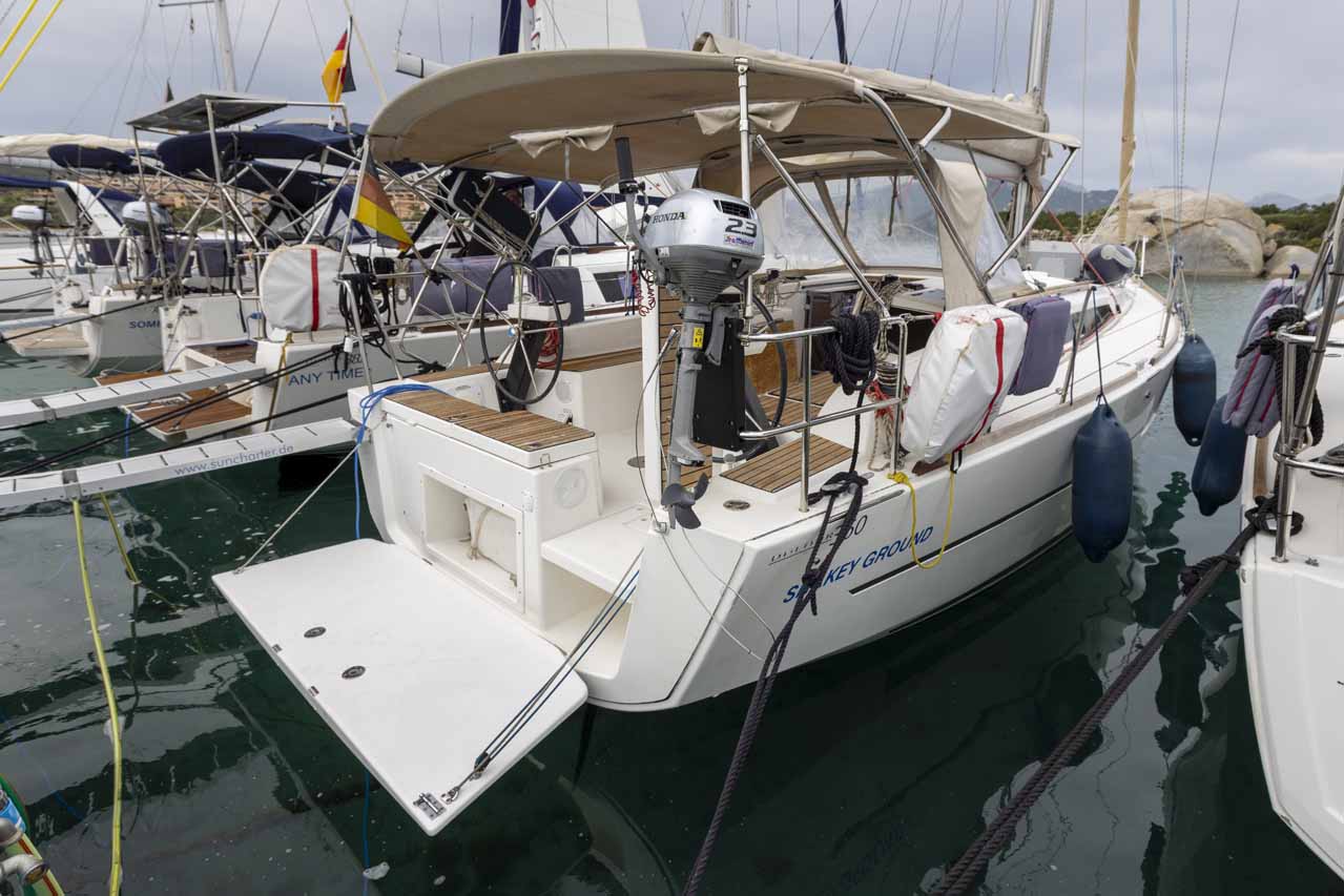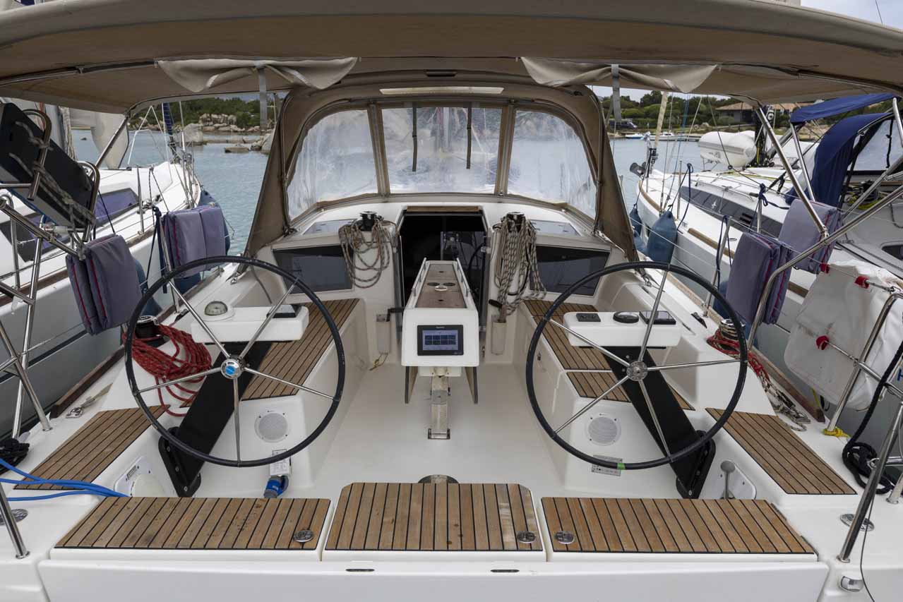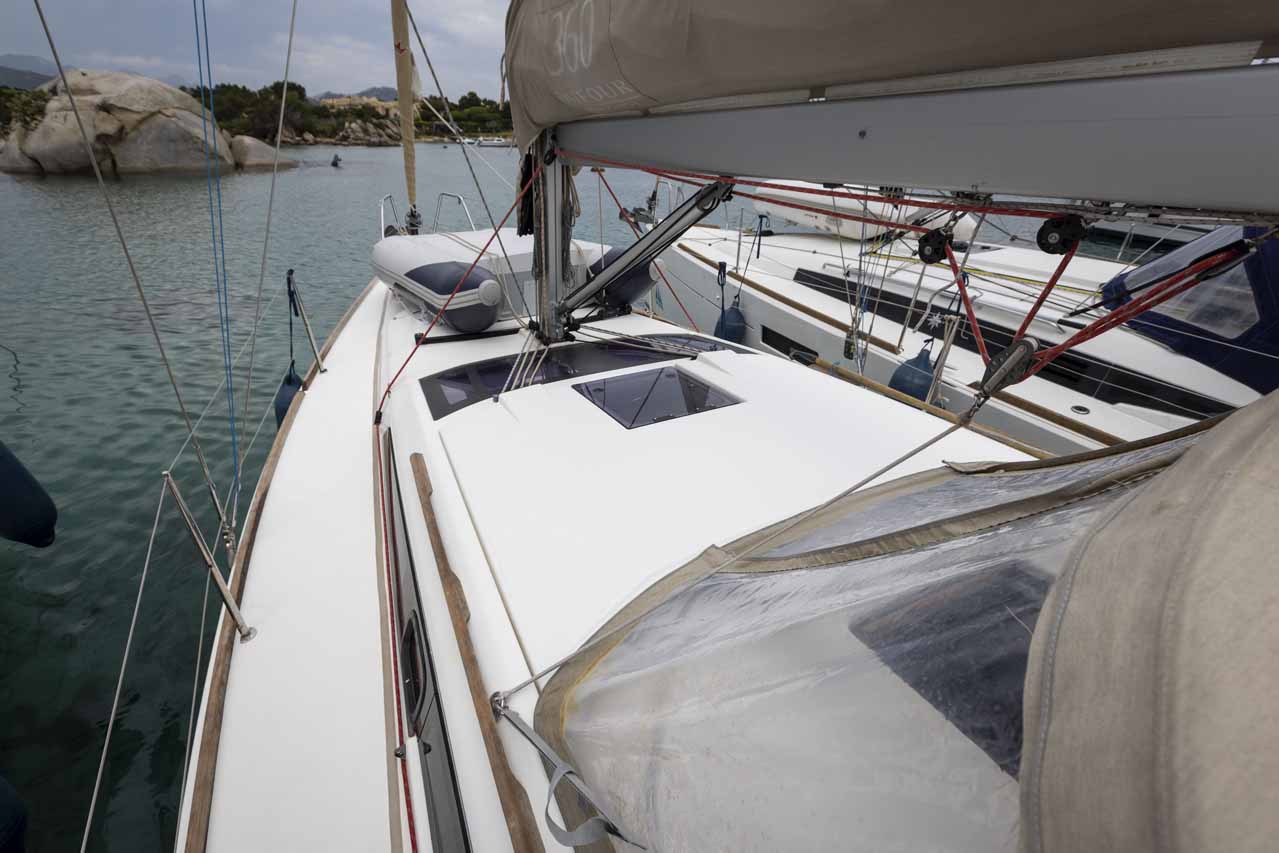 | Outside | 220 V-Landanschluss, Anker mit Kette, Ankerwinsch, Biminitop, Bootshaken, Cockpitdusche, Cockpitlautsprecher, Cockpitpolster, Cockpittisch, Dieselkanister , elektr. Ankerwinsch, Faltpropeller, Fender, Festmacherleinen, Gangway, Kunststoff-Eimer (Pütz), Sprayhood, Teak im Cockpit, Wantenschneider, Wasserkanister , Wasserschlauch, Windex |
