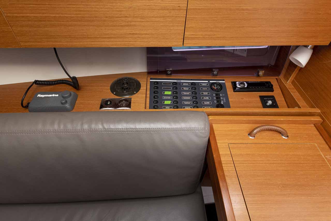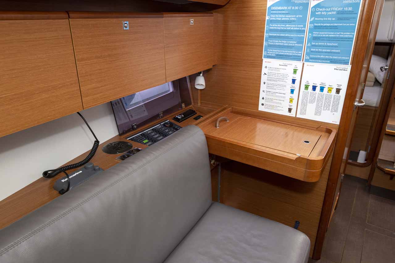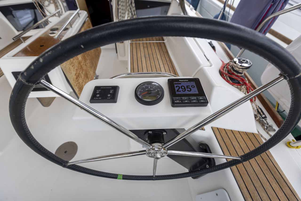 | Navigation | Barometer, Fernglas, GPS mit Kartenplotter im Cockpit, Hafenhandbücher, Handpeilkompass, Navigationsbesteck, Seekarten, Tridata (Log, Echolot, Windm.) |