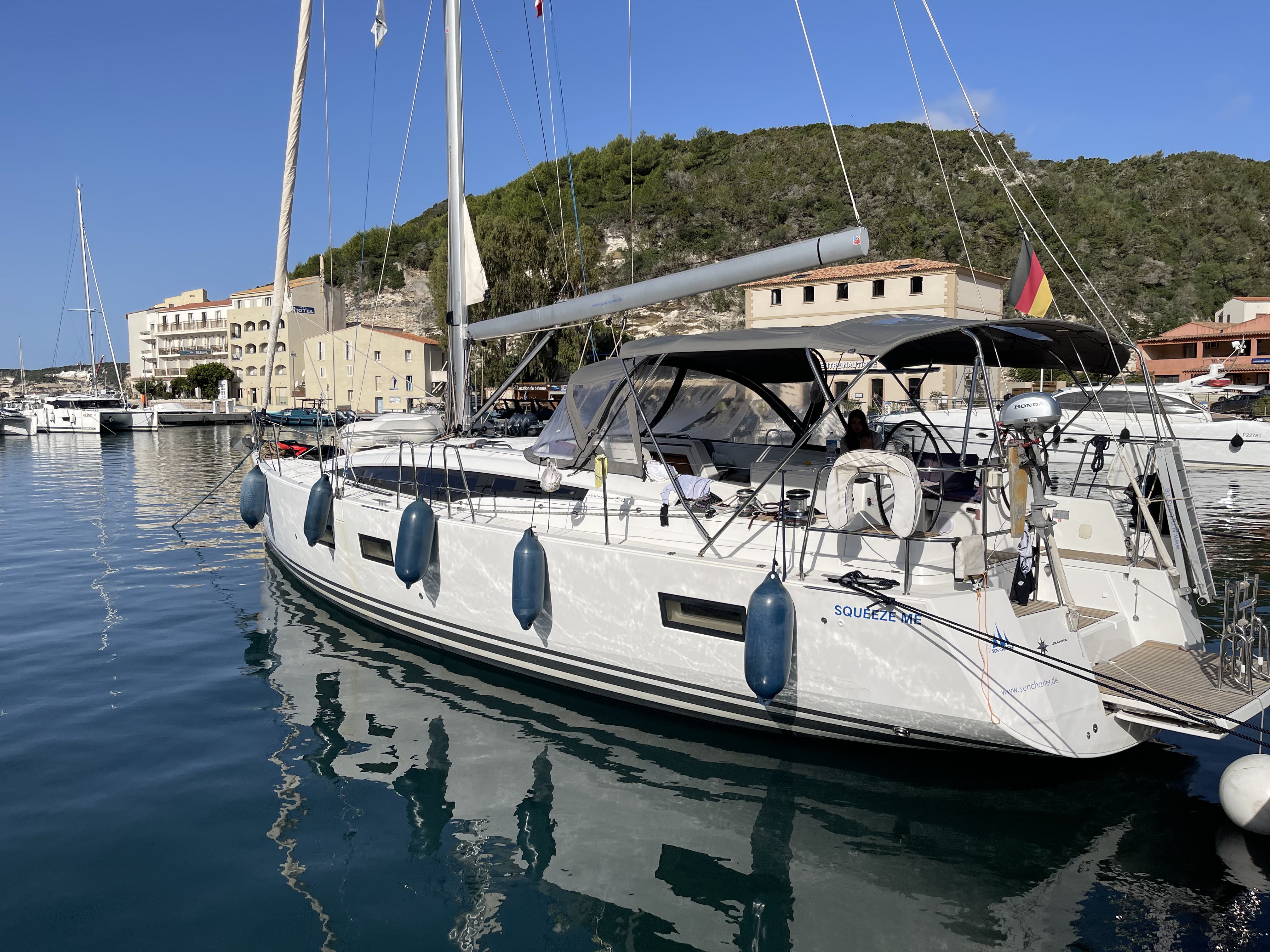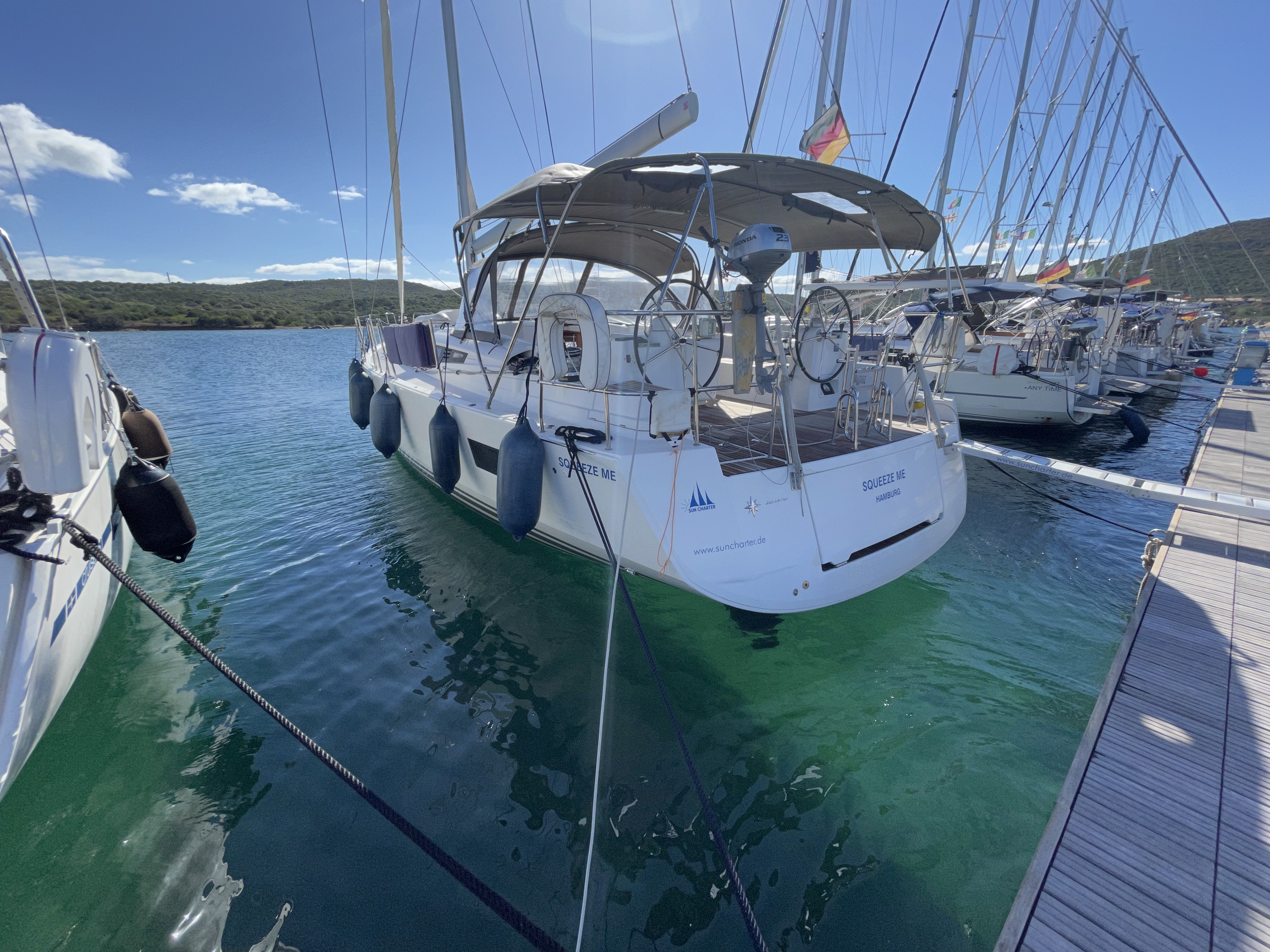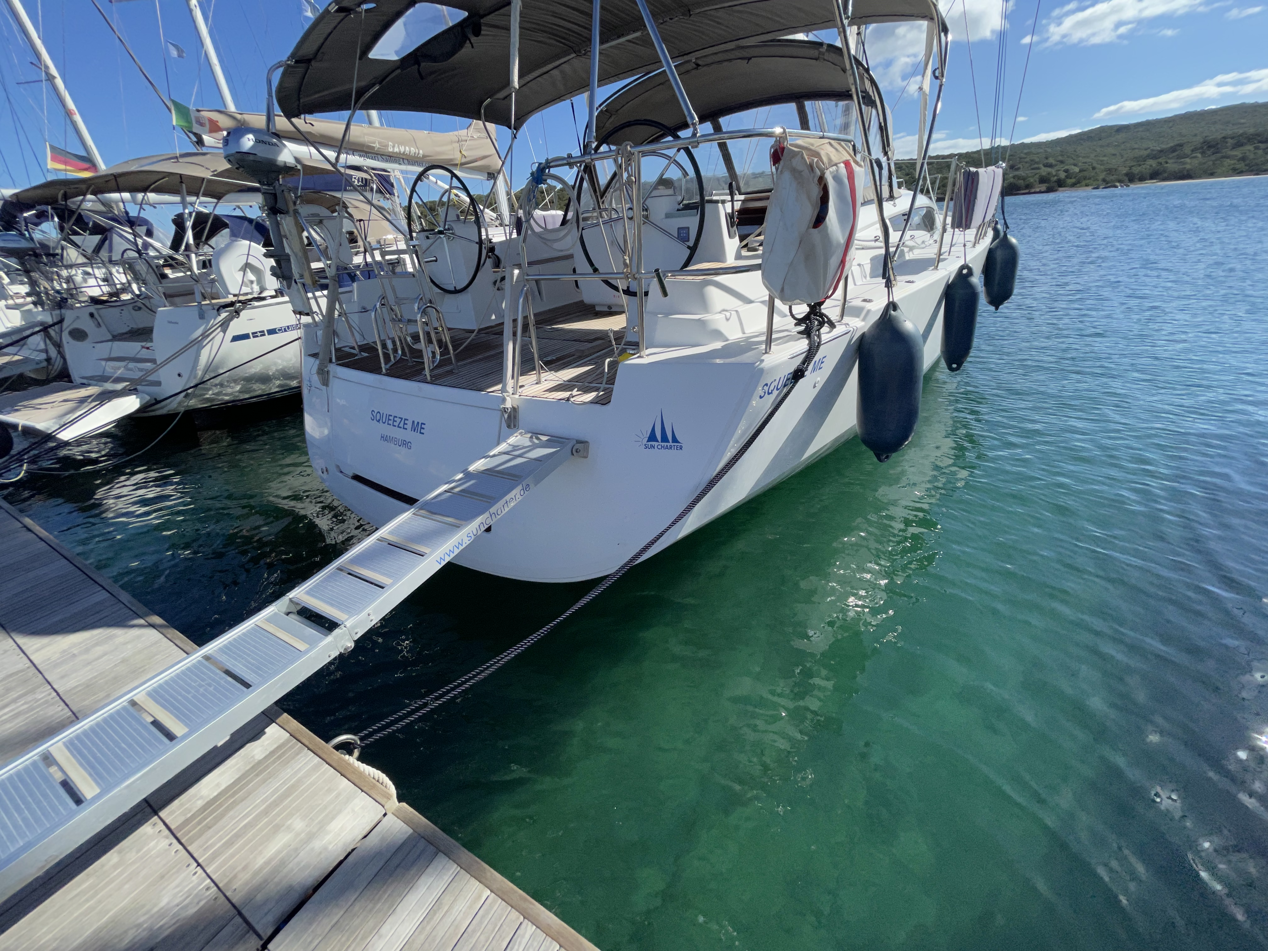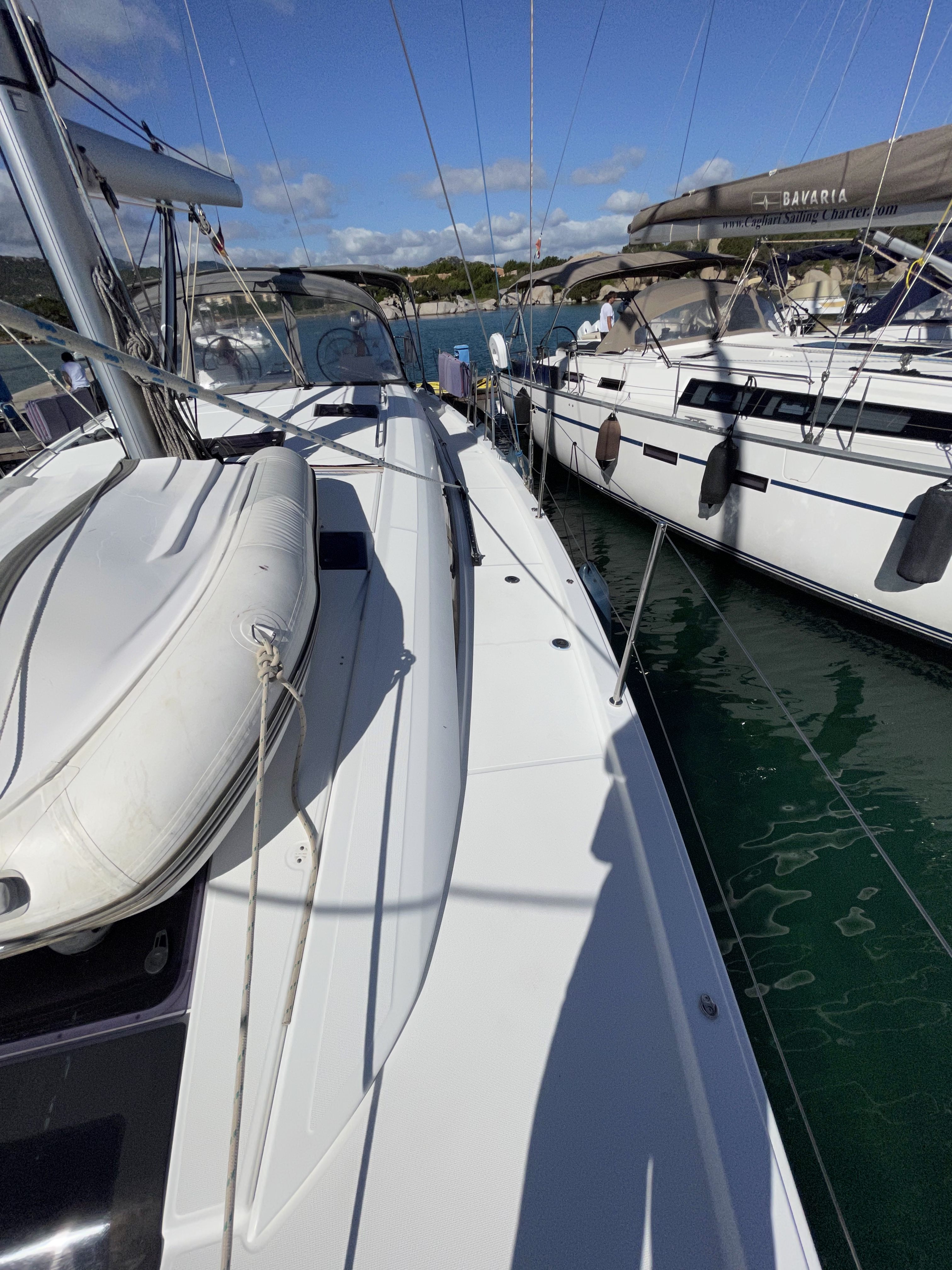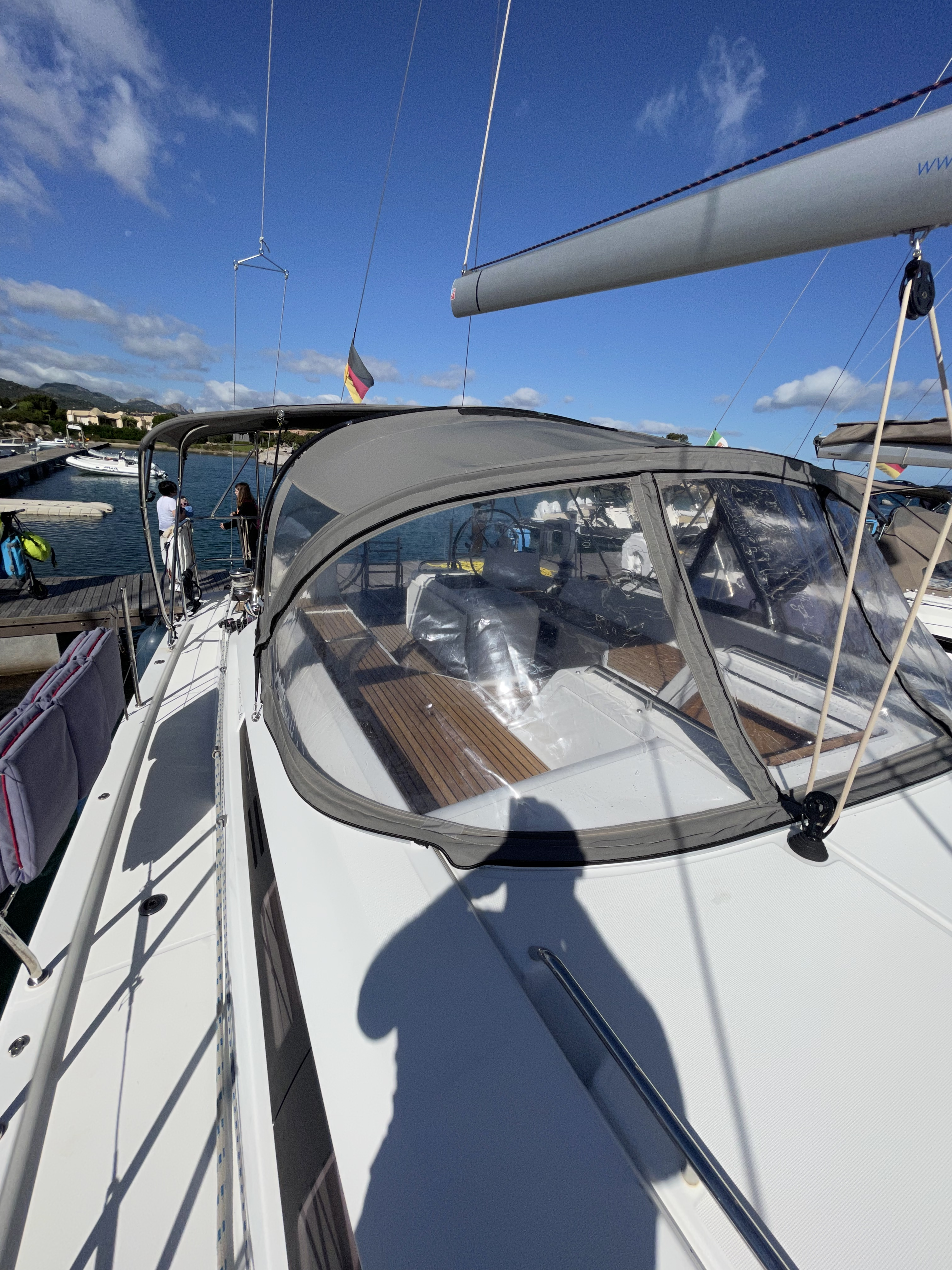 | Outside | 220 V-Landanschluss, Anker mit Kette, Ankerwinsch, Biminitop, Bootshaken, Cockpitdusche, Cockpitlautsprecher, Cockpitpolster, Cockpittisch, Dieselkanister , elektr. Ankerwinsch, Fender, Festmacherleinen, Gangway, Kugelfender, Kunststoff-Eimer (Pütz), Lifeline System, Sprayhood, Teak im Cockpit, Wantenschneider, Wasserkanister , Wasserschlauch, Windex |