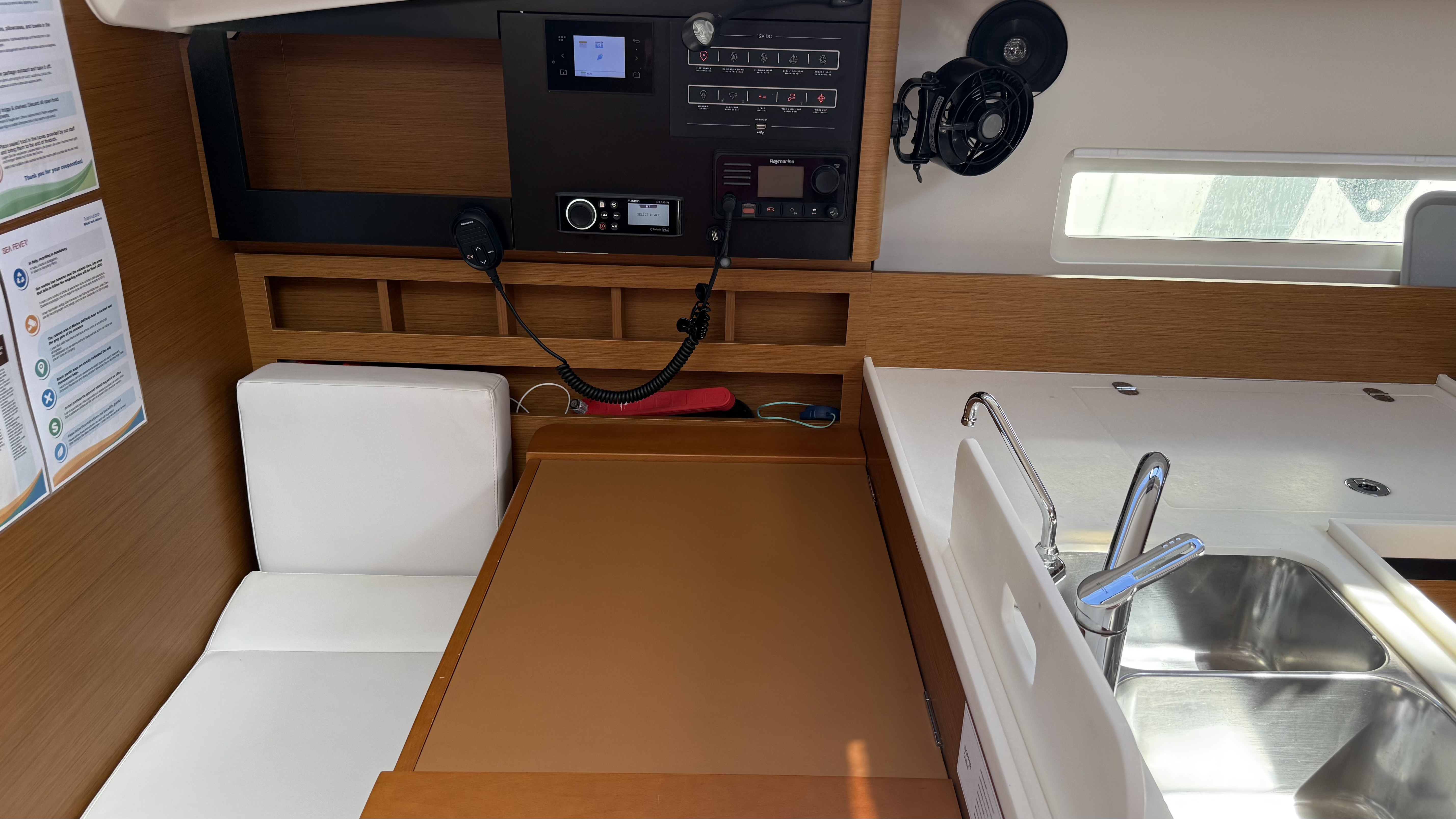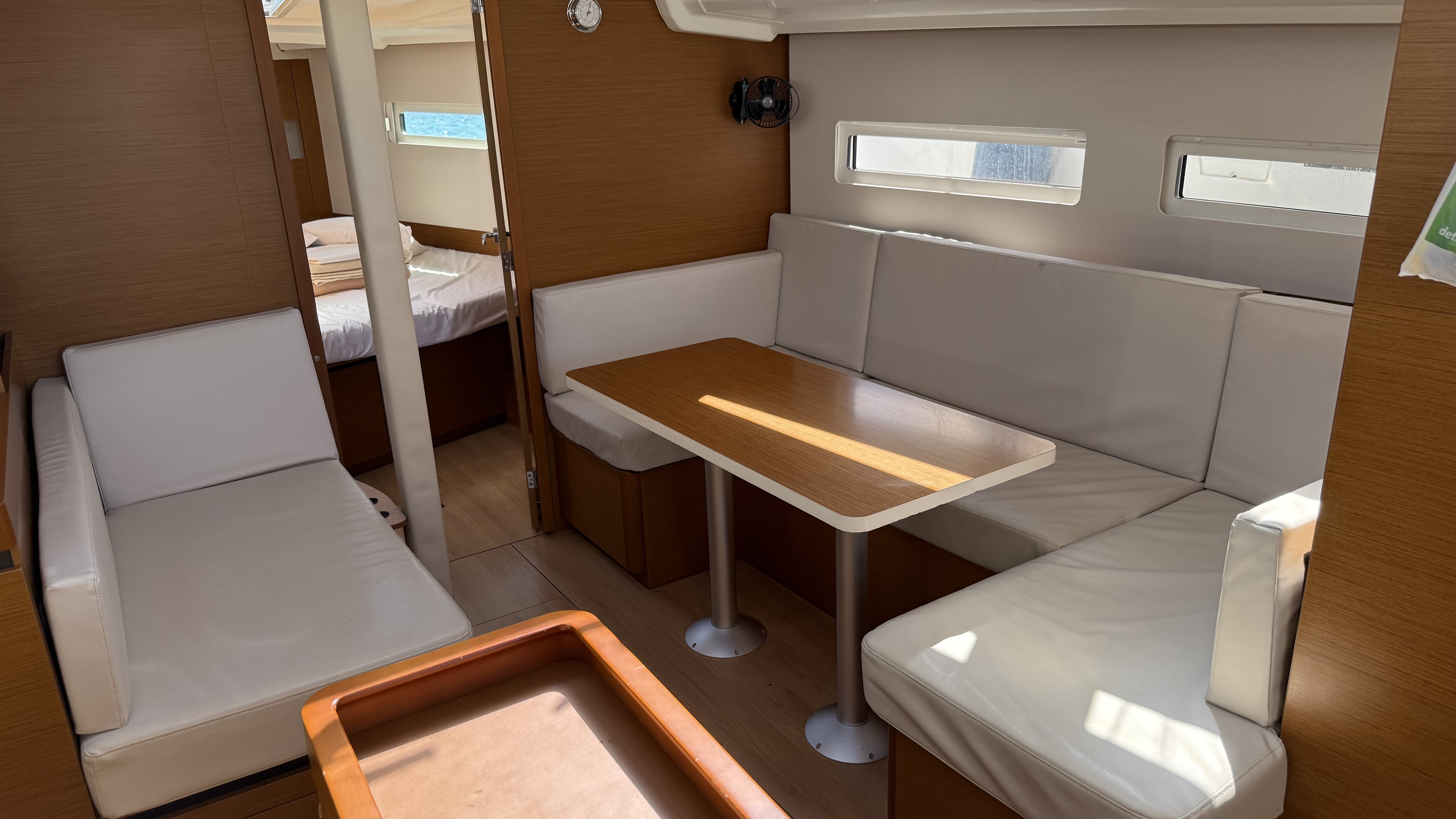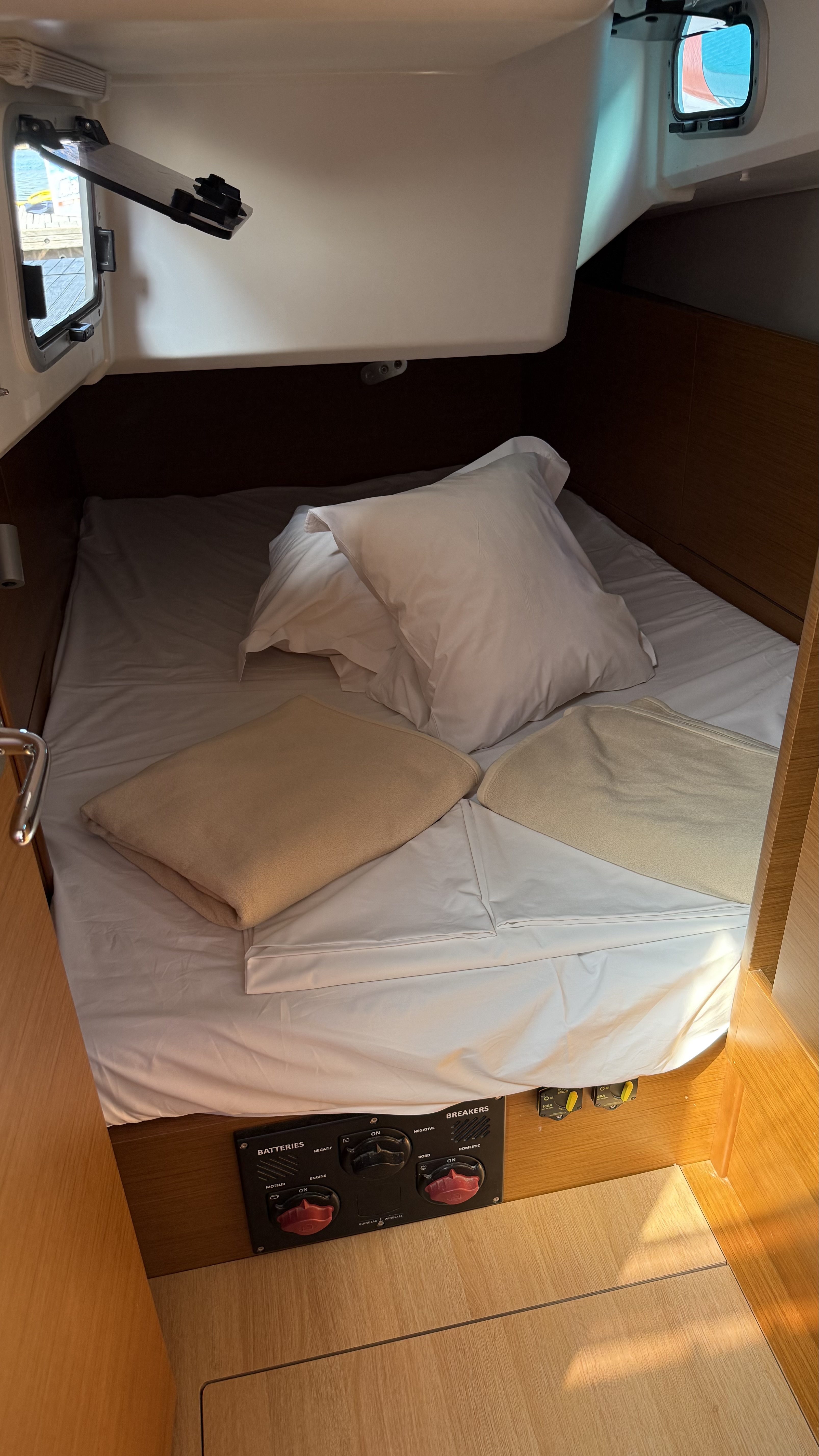 | Inside | Inverter 12V/220V, Kühlschrank, Ladegerät, Luftpumpe für Beiboot, Pantryausstattung, Radio, Salontisch absenkbar, USB Steckdosen in Salon und Kabinen, Ventilatoren in Kabinen, Warmwasser |