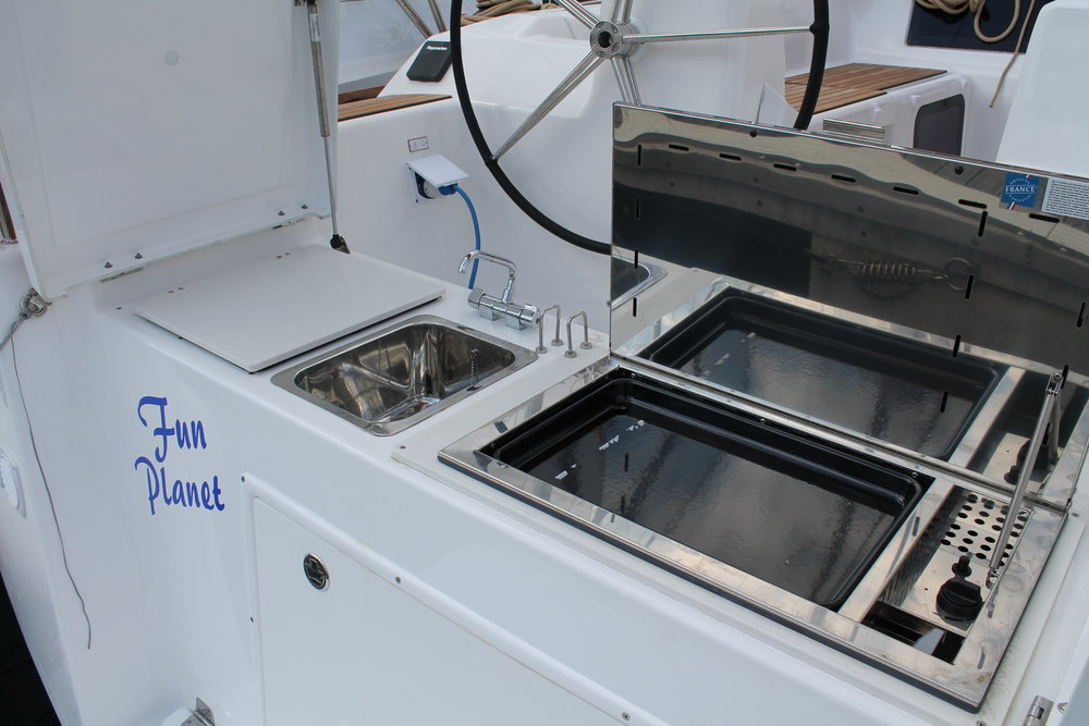 | Outside | Biminitop, Cockpitdusche, Cockpitlautsprecher, Cockpitpolster, Cockpittisch, Deckbeleuchtung, elektr. Ankerwinsch, Sprayhood |