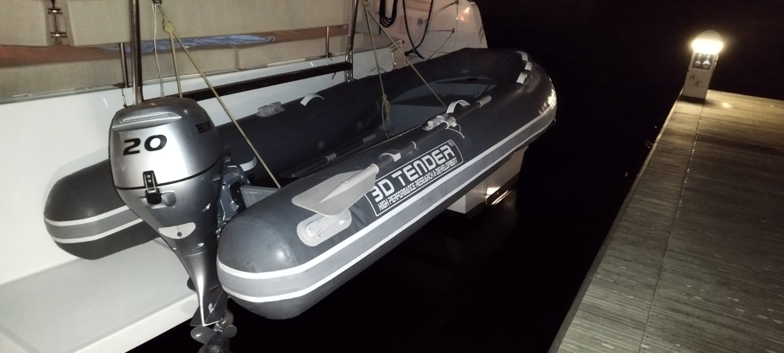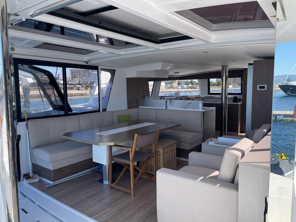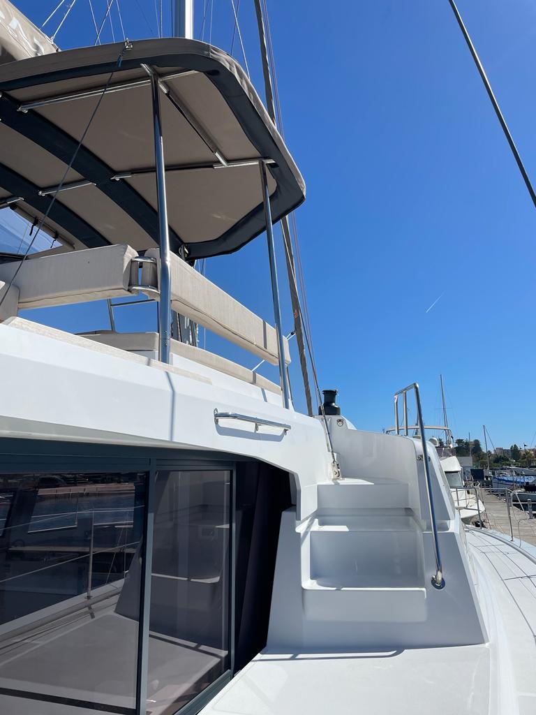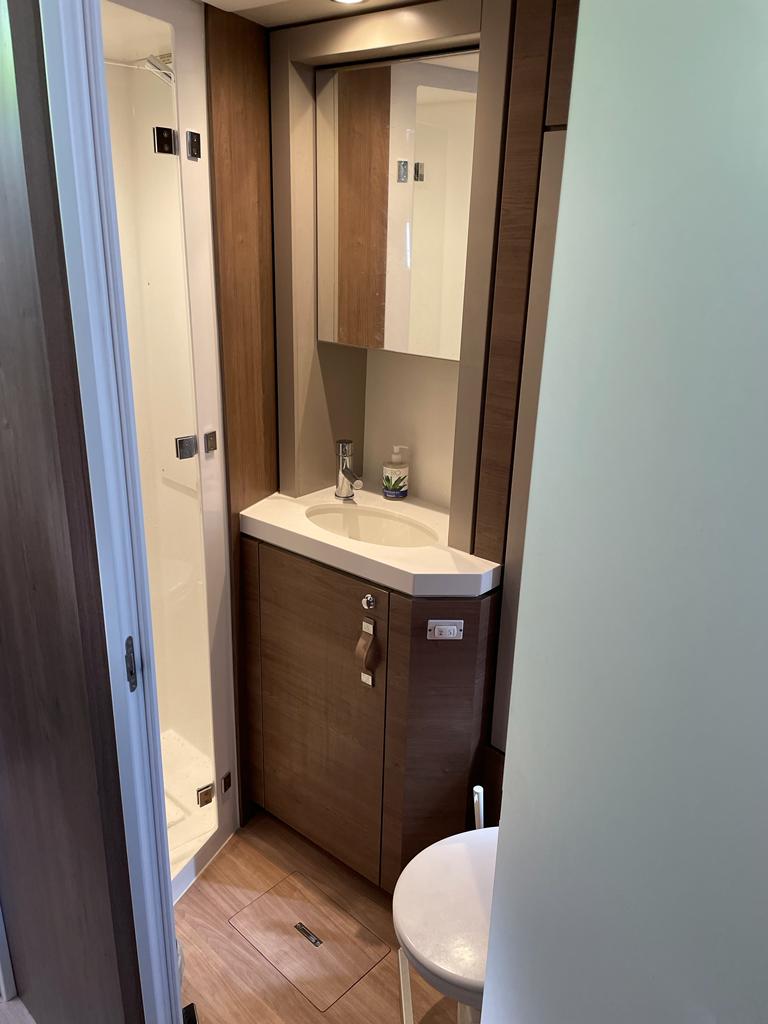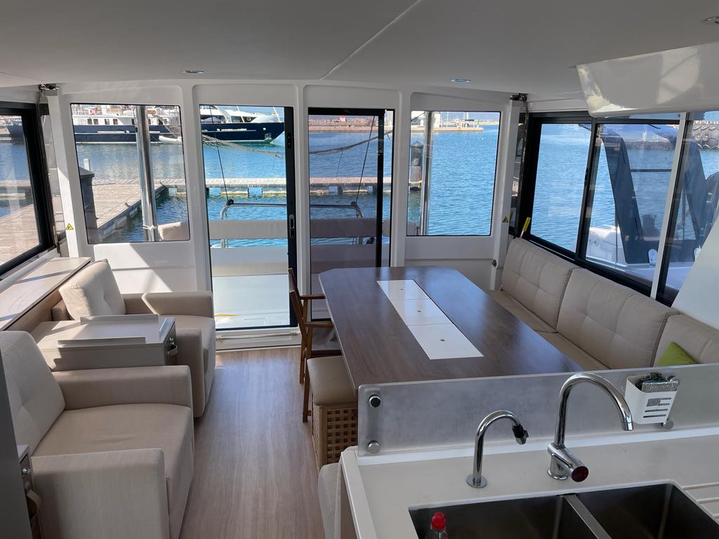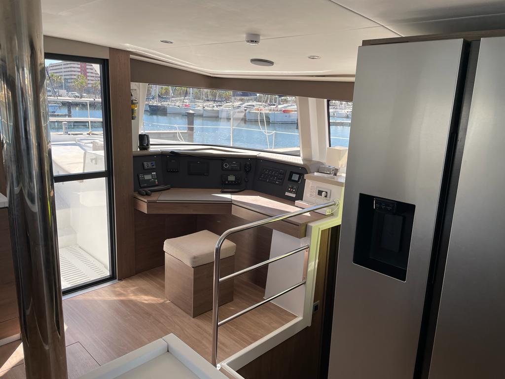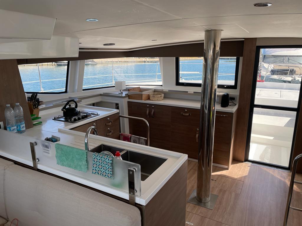 Inside 12V/220V-Steckdosen, Eiswürfelmaschine, Gefrierschrank, Generator, Geschirrspüler, Kaffeemaschine, Klimaanlage (ohne Landstrombedarf), Kühlschrank, Pantryausstattung, Radio mit Bluetooth, Ventilatoren in Kabinen, Watermaker, WC (elektr.)