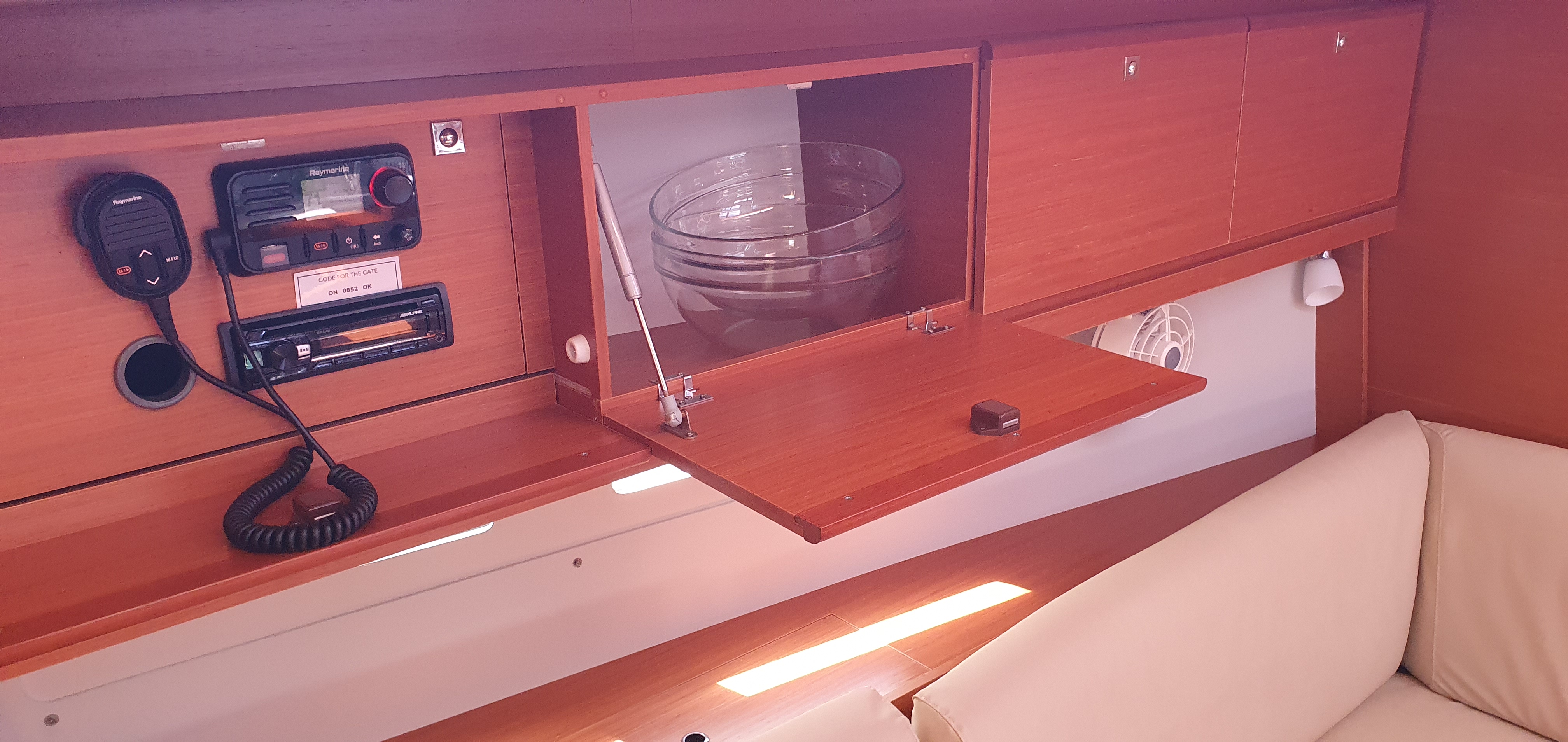 | Outside | Badeleiter, Biminitop, Cockpitdusche, Cockpitlautsprecher, Cockpitpolster, Cockpittisch, elektr. Ankerwinsch, Grill, Selbstholende Winschen, Sprayhood |