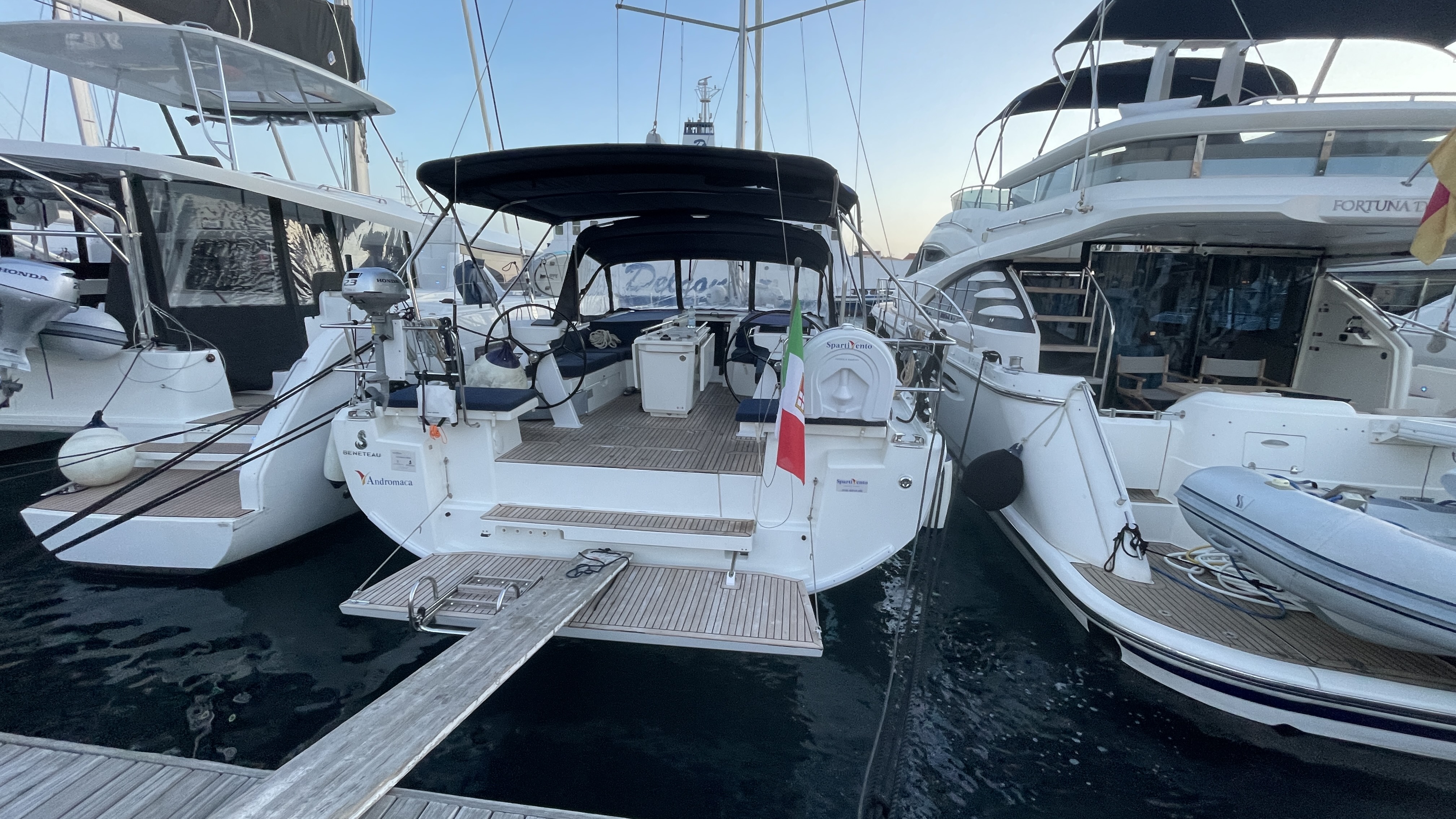 Outside Anker mit Kette, Cockpitdusche, Cockpitpolster, Gangway, Teak im Cockpit