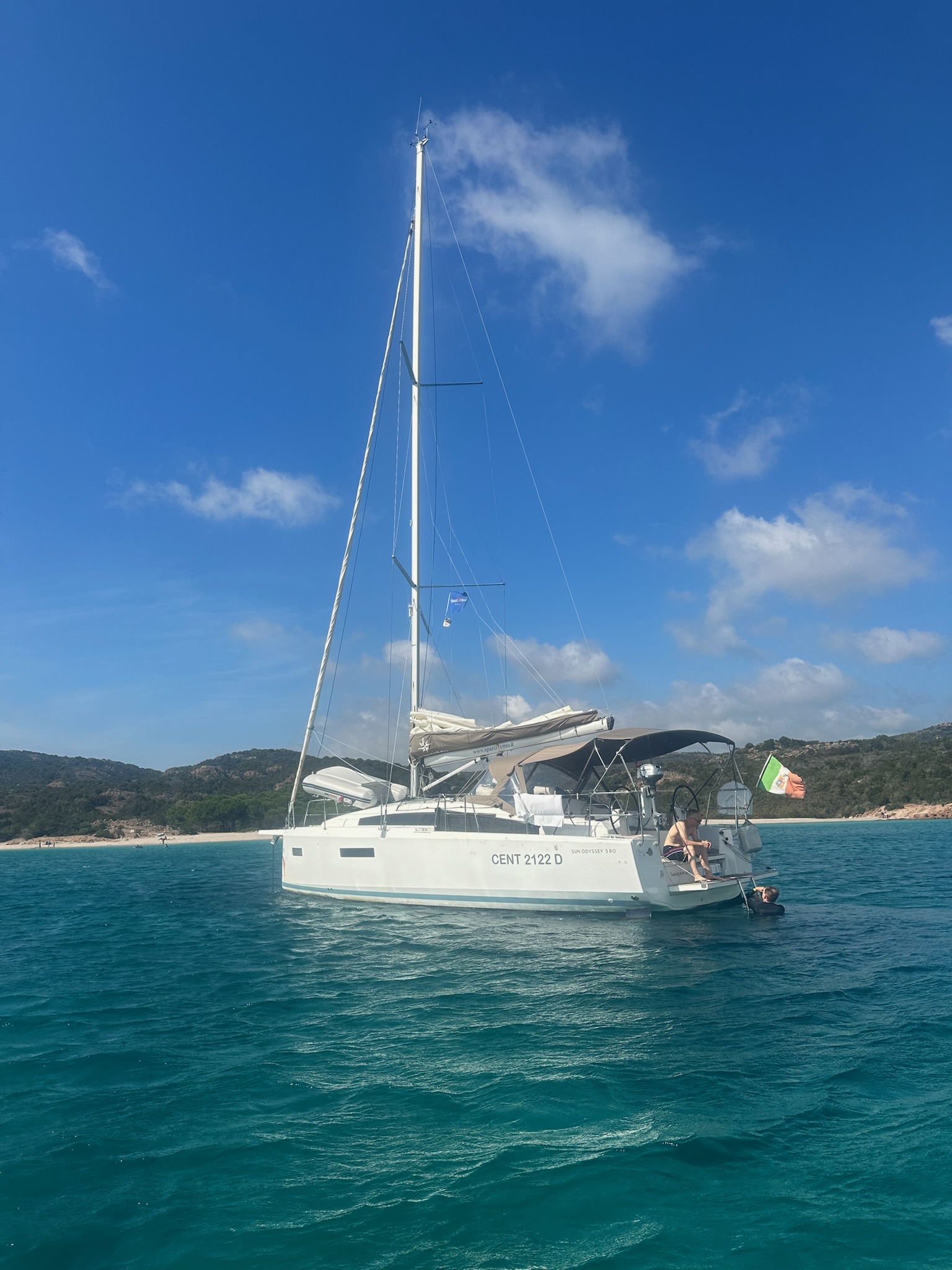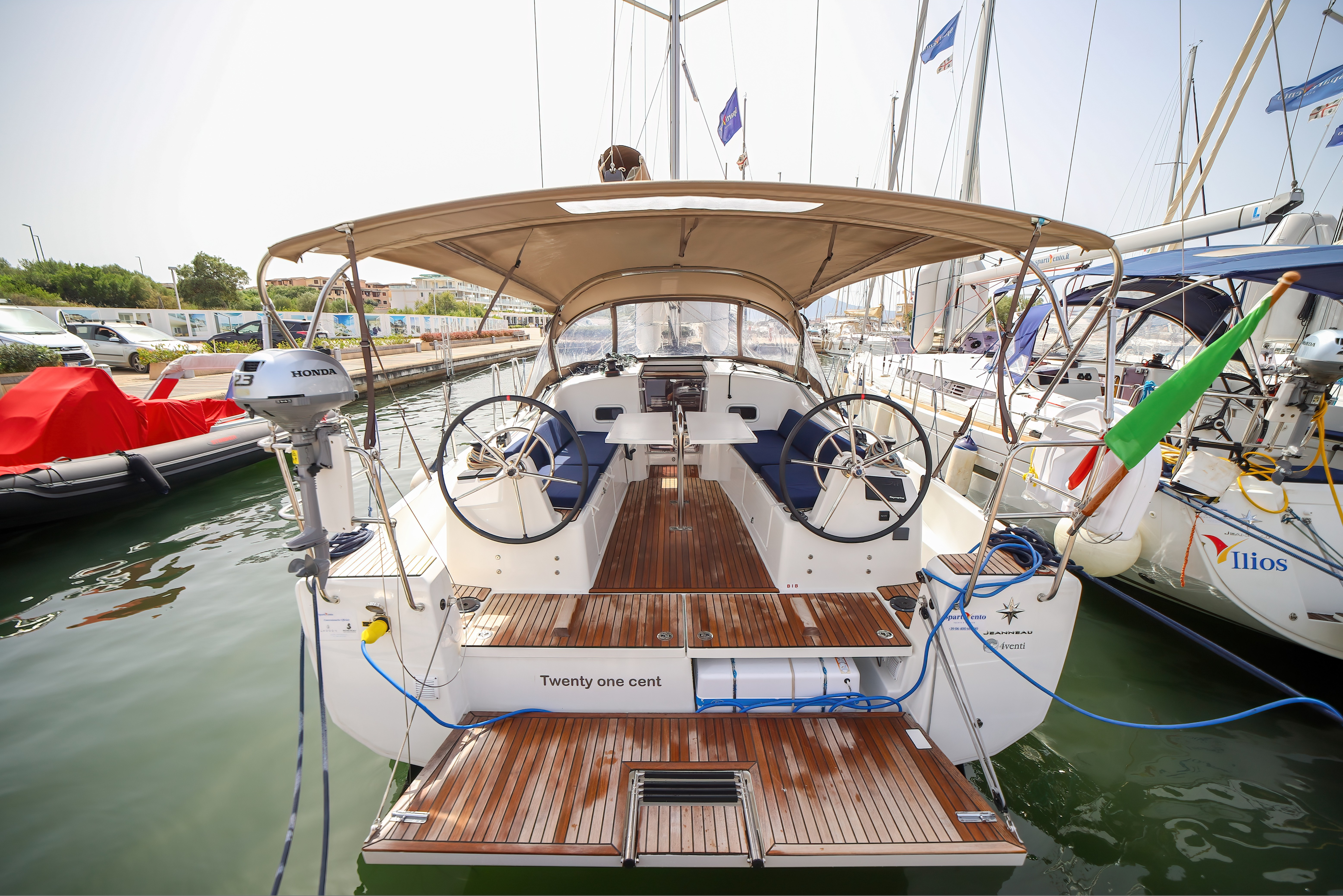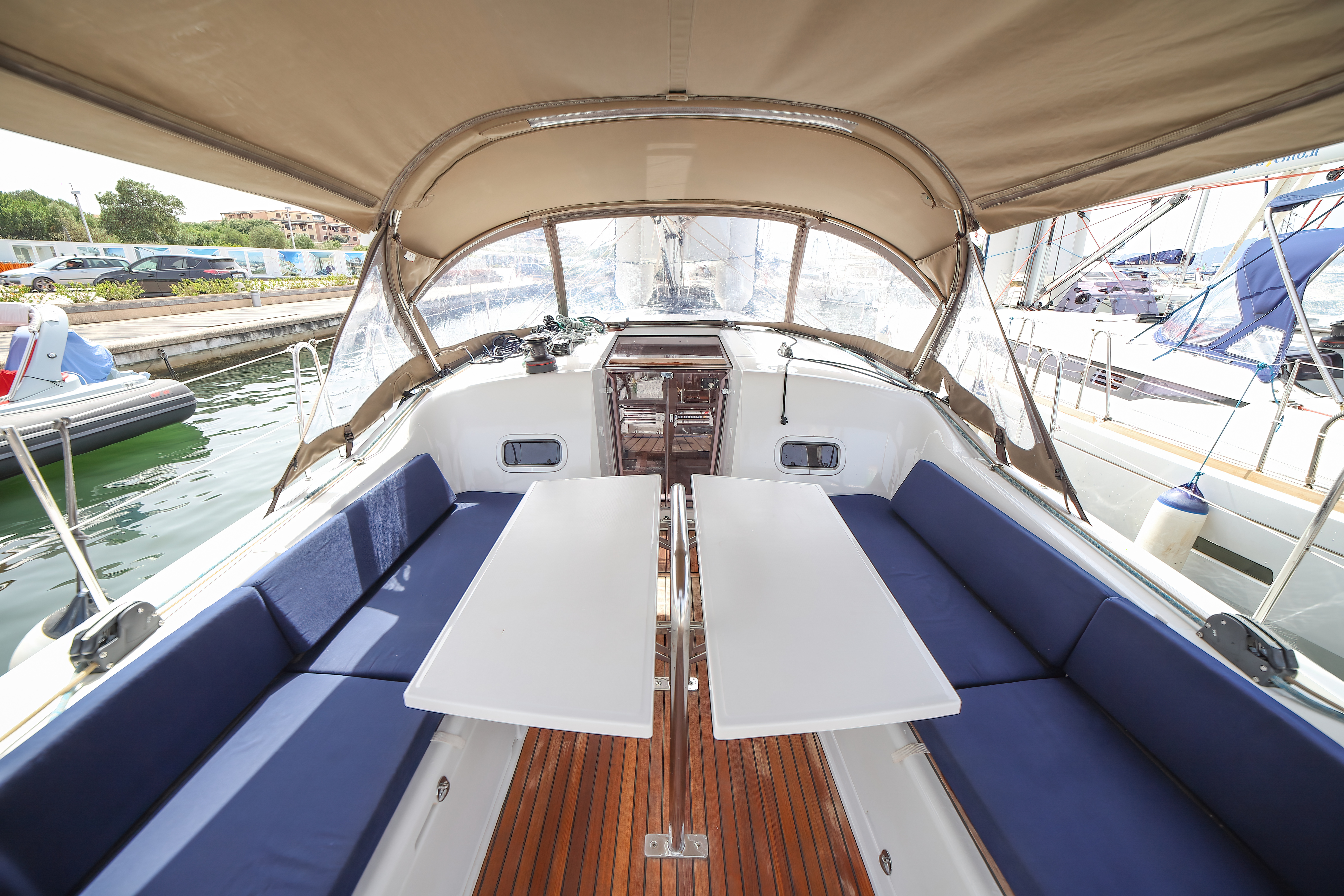 | Outside | Anker mit Kette, Biminitop, Cockpitdusche, Gangway |
