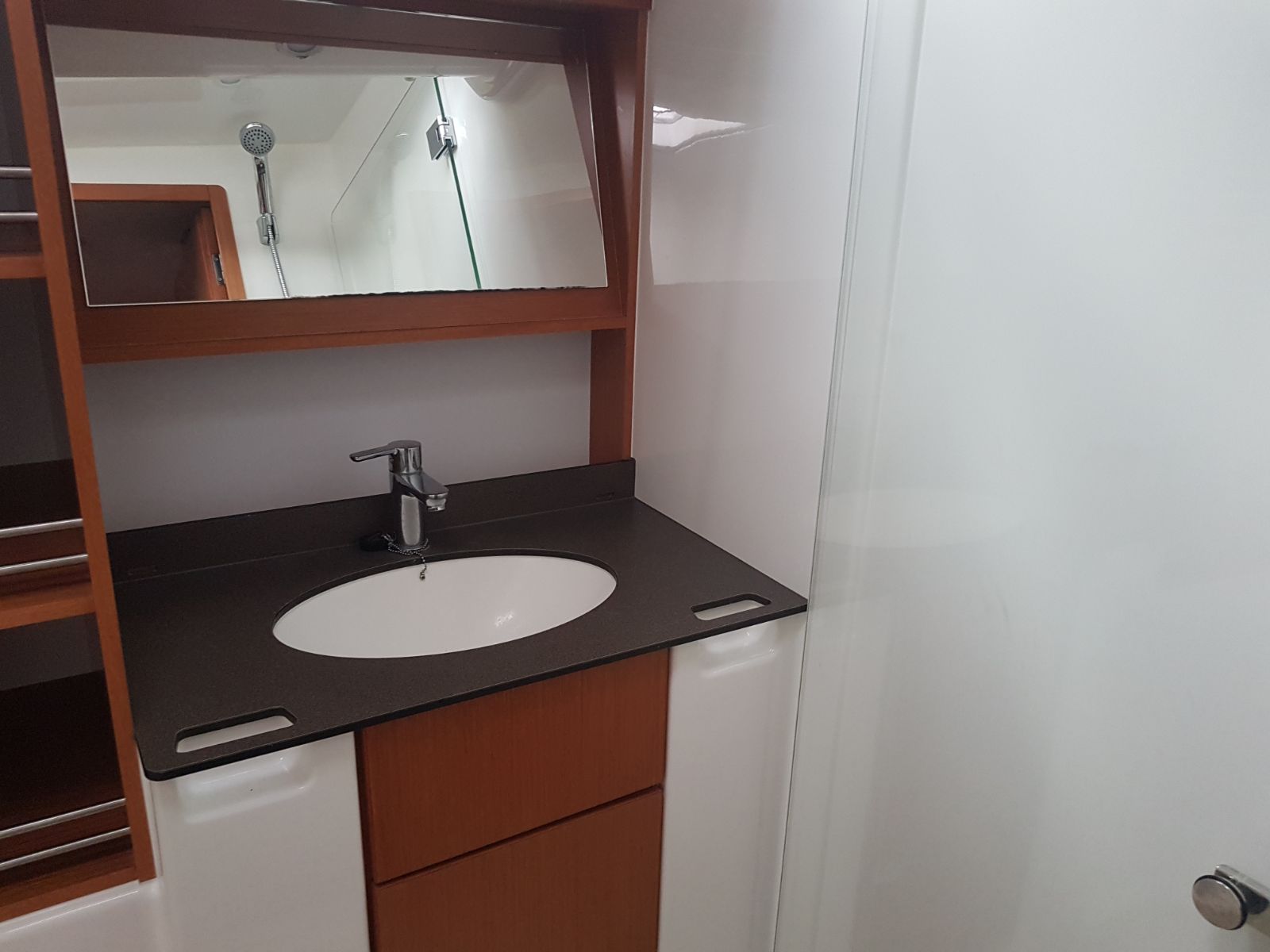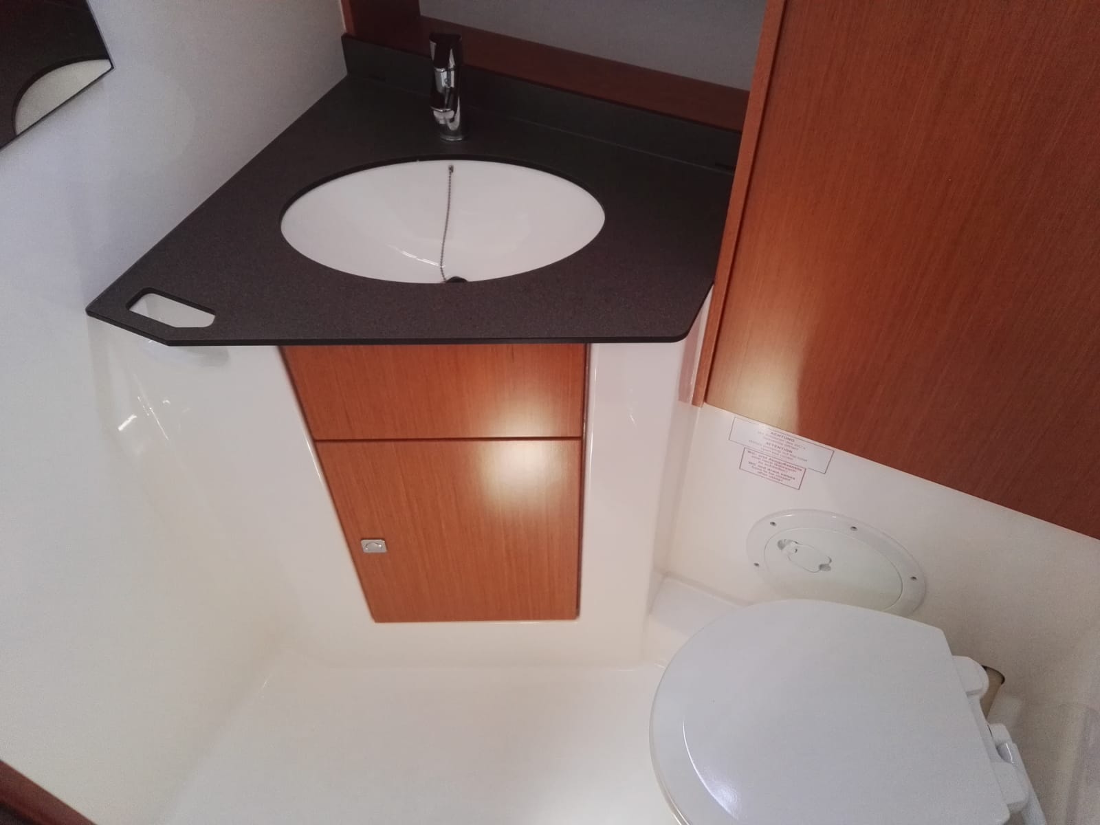 | Outside | Anker mit Kette, Badeleiter, Bootshaken, Cockpitdusche, Cockpitlautsprecher, Cockpittisch, elektr. Ankerwinsch, Festmacherleinen, Sprayhood, Teak im Cockpit, Winschen |
