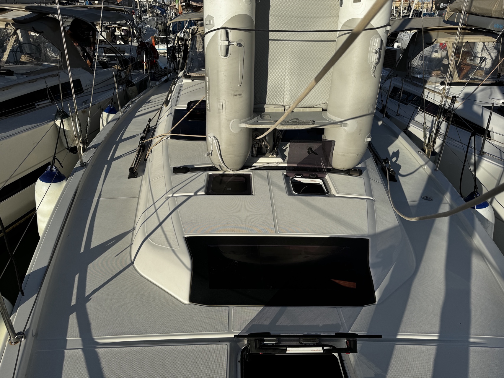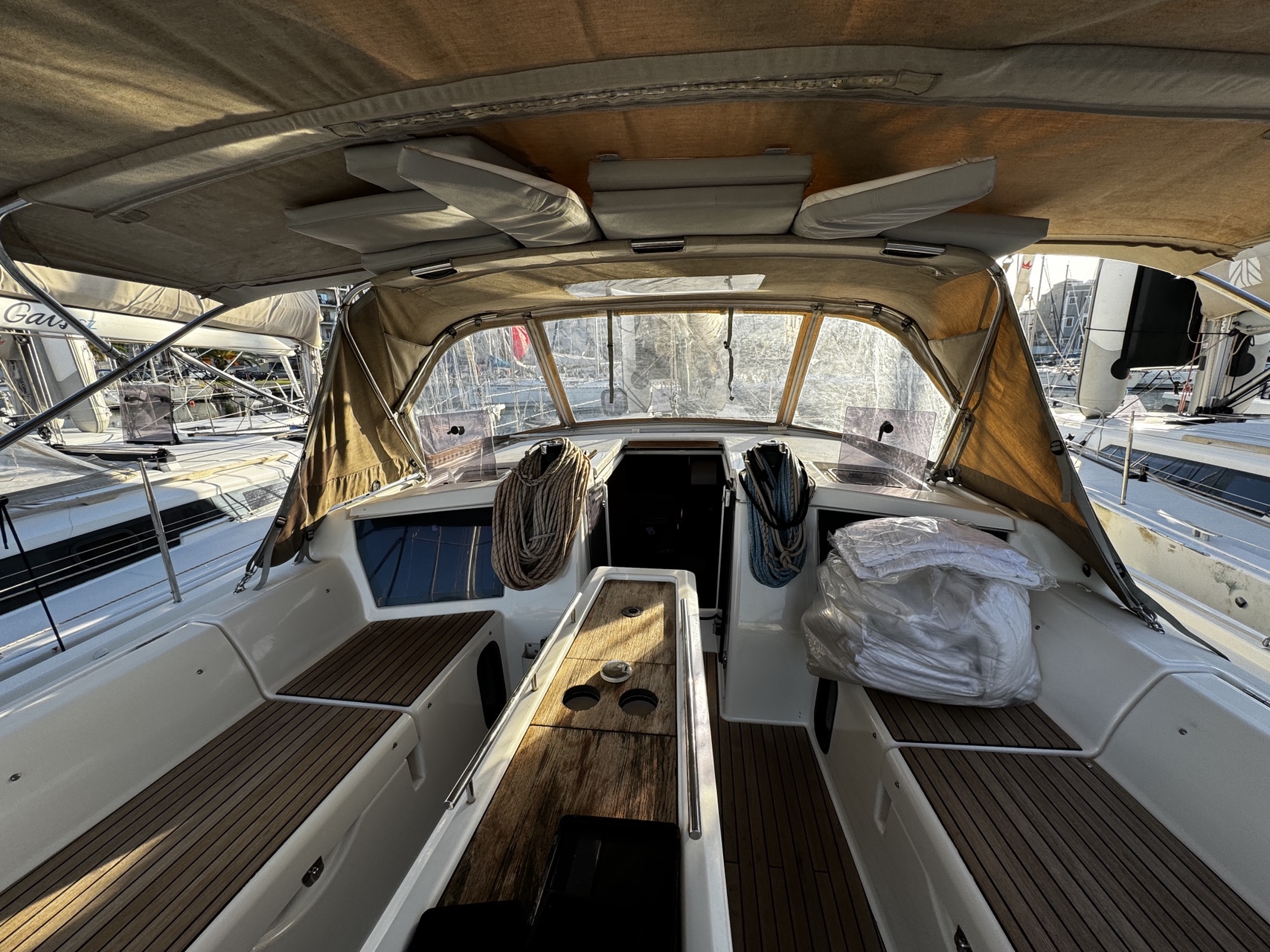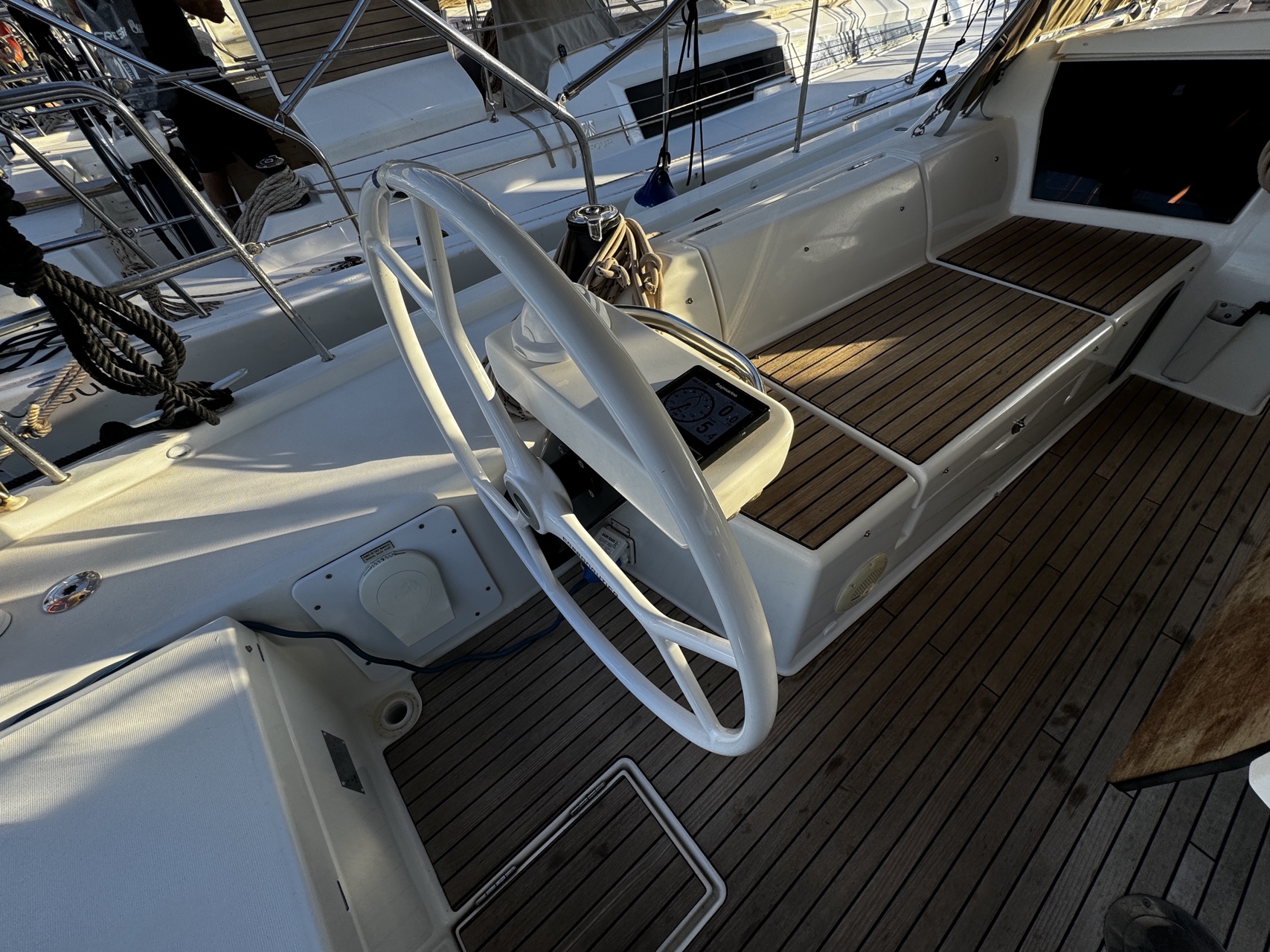 | Outside | Anker mit Kette, Ankerwinsch, Außendusche, Badeplattform, Biminitop, Bootshaken, Cockpitdusche, Cockpitlautsprecher, Deckbeleuchtung, elektr. Ankerwinsch, Fender, Festmacherleinen, Grill, Kunststoff-Eimer (Pütz), Sprayhood, Teak im Cockpit, Windex, Winschen |