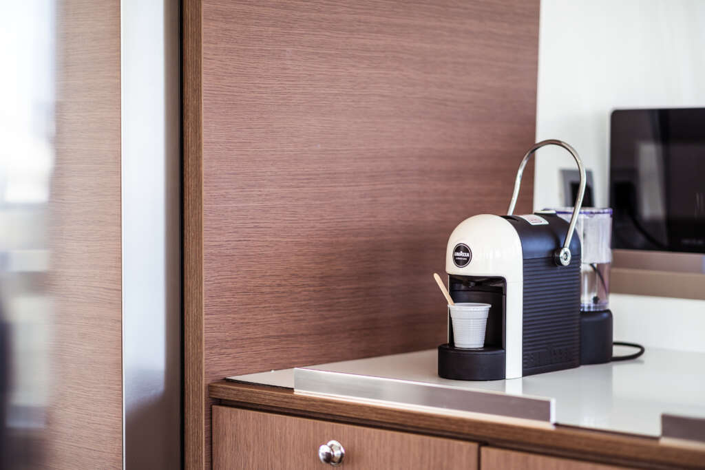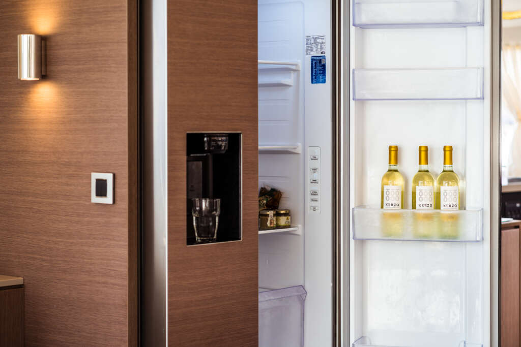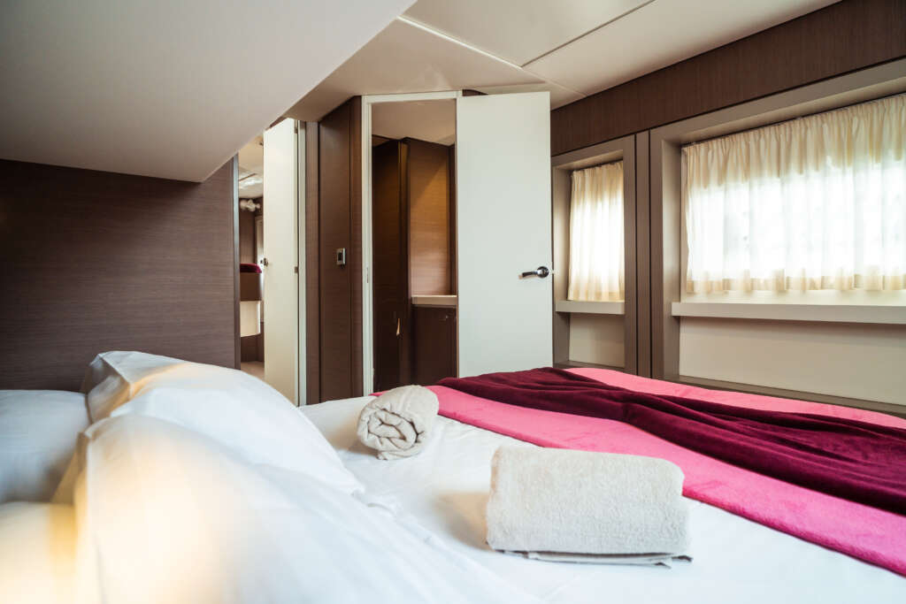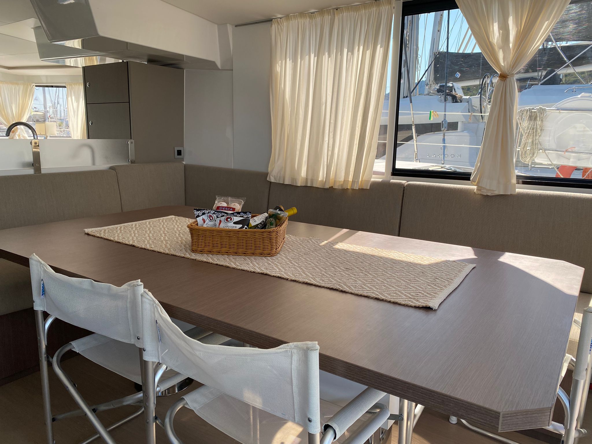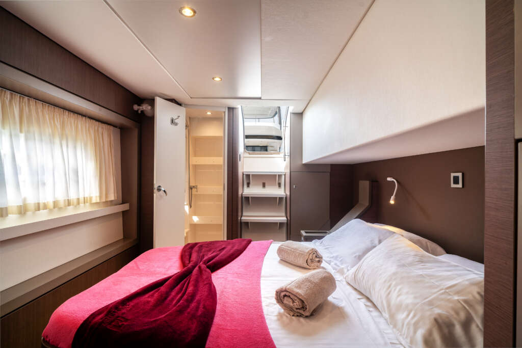 | Inside | Gasherd mit Backofen, Gefrierschrank, Generator, Inverter 12V/220V, Kaffeemaschine, Klimaanlage (ohne Landstrombedarf), Kühlschrank, Lautsprecher im Salon, Mikrowelle, Pantryausstattung, Radio mit USB, USB Steckdosen in den Kabinen, Ventilatoren in Salon und Kabinen, Watermaker, WC (elektr.) |