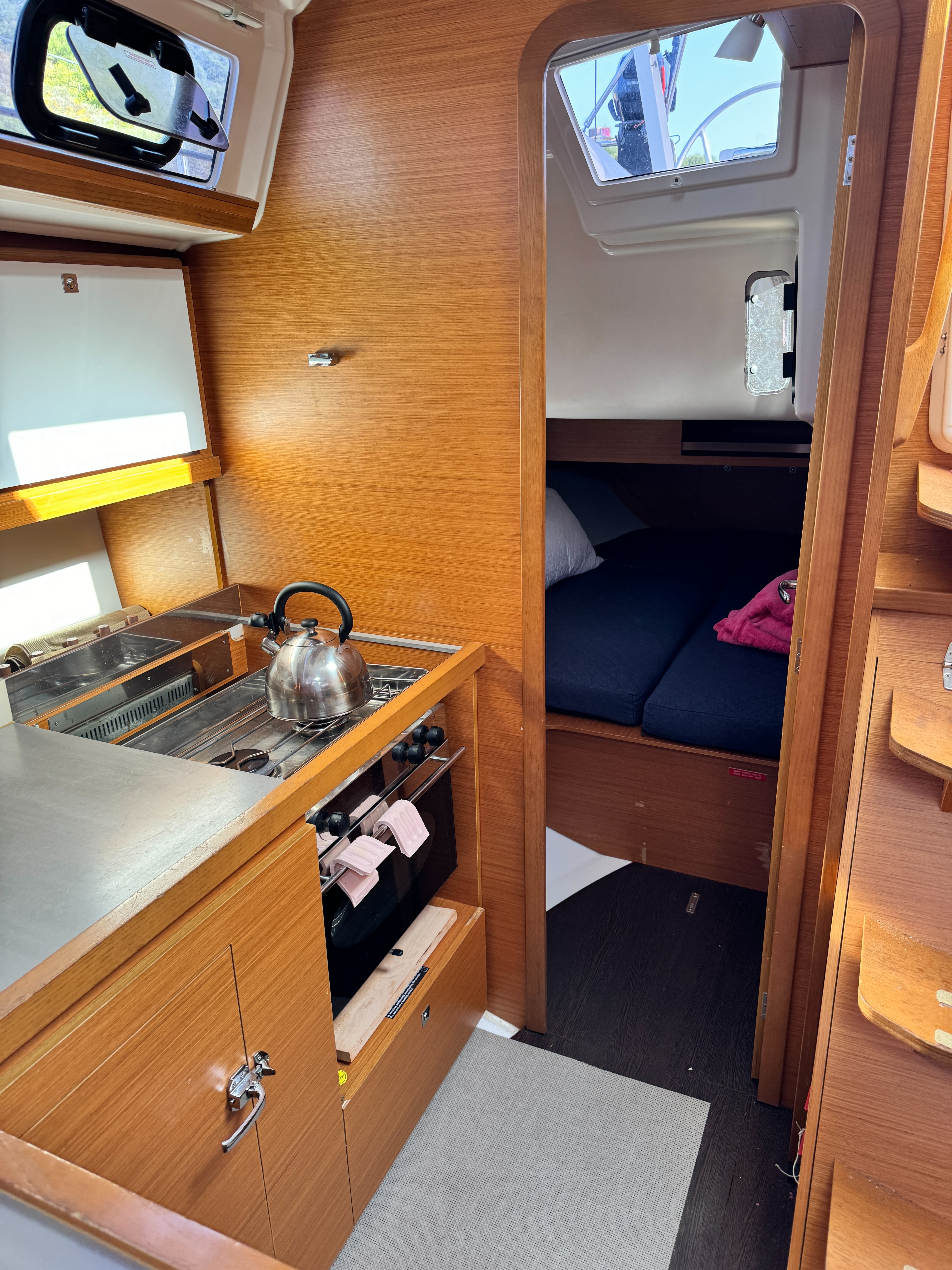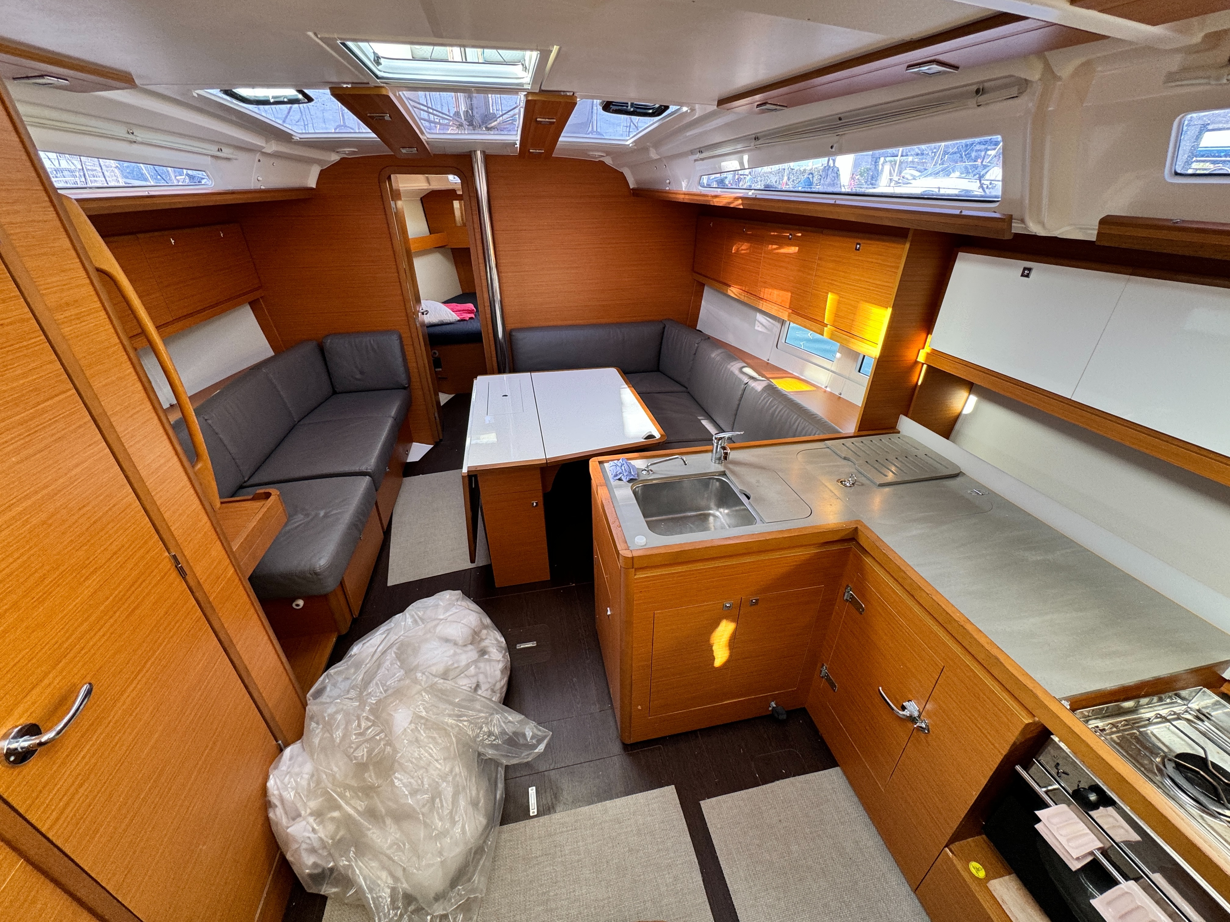 | Inside | Gasherd mit Backofen, Inverter 12V/220V, Kühlschrank, Lautsprecher im Salon, Pantryausstattung, Radio mit CD und USB, USB Steckdosen in den Kabinen, Ventilatoren in Salon und Kabinen, WC (elektr.) |