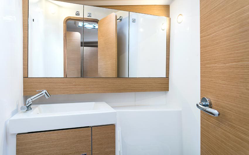 | Inside | Gasherd mit Backofen, Kühlschrank, Lautsprecher im Salon, Mikrowelle, Pantryausstattung, Radio mit CD, Radio mit USB, Salontisch absenkbar, Ventilatoren in Salon und Kabinen, Warmwasser, Wasserkocher, WC (elektr.) |