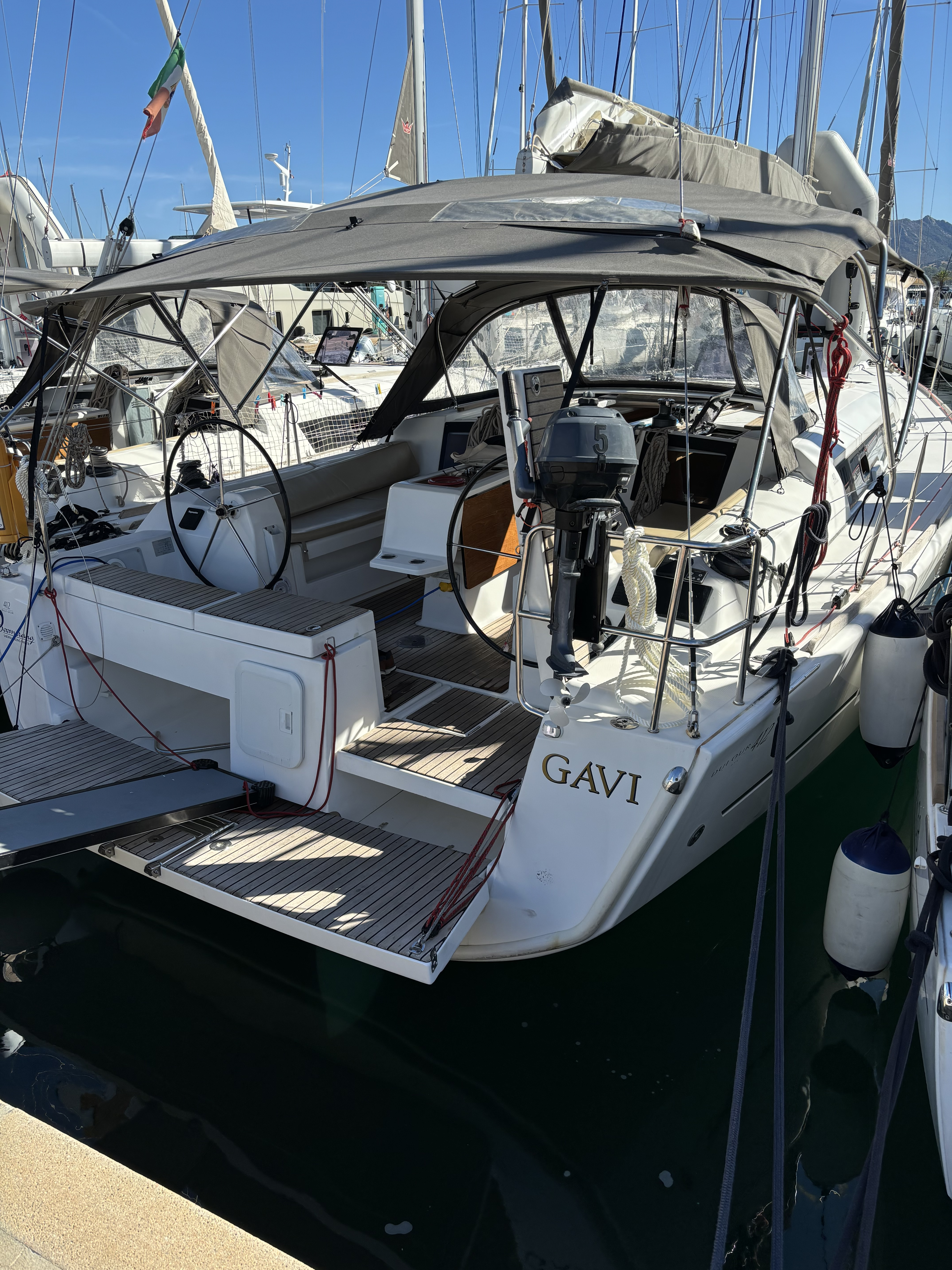 | Outside | Anker mit Kette, Biminitop, Bootshaken, Bürste und Schwamm, Cockpitdusche, Cockpitlautsprecher, Cockpitleuchte, Cockpittisch, Deckpolster, elektr. Ankerwinsch, elektr. Winsch, Fender, Festmacherleinen, Gangway, Grill, Hardtop, Schnorchelausrüstung, Sprayhood, Teak im Cockpit, Wasserschlauch, Windex |