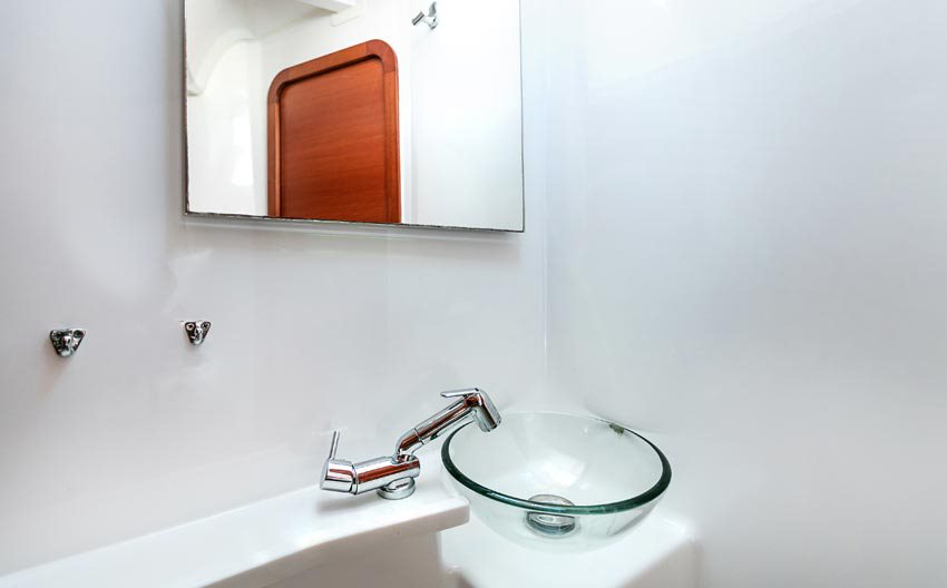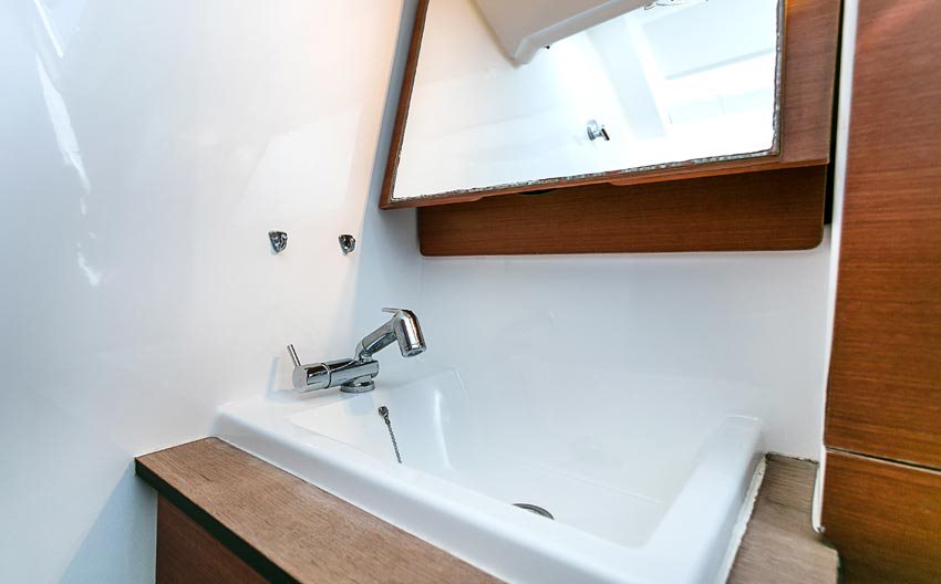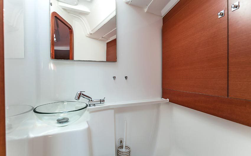 | Inside | Gasherd mit Backofen, Kühlschrank, Lautsprecher im Salon, Pantryausstattung, Radio mit CD, Radio mit USB, Salontisch absenkbar, USB Steckdosen in den Kabinen, Ventilatoren in Salon und Kabinen, Warmwasser |
