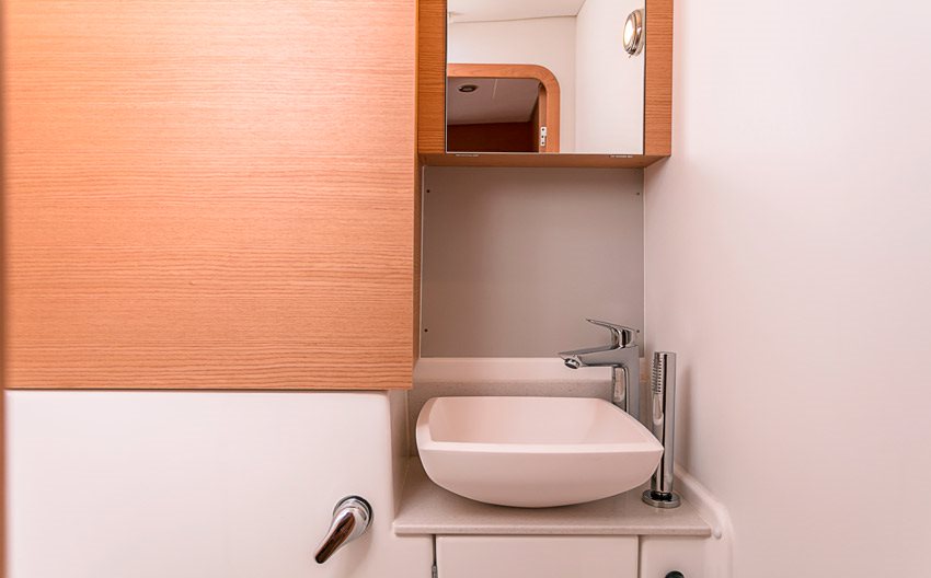 | Inside | Gasherd mit Backofen, Inverter 12V/220V, Kaffeemaschine, Klimaanlage (Landstrom), Kühlschrank, Lautsprecher im Salon, Mikrowelle, Pantryausstattung, Radio mit USB, Salontisch absenkbar, USB Steckdosen in den Kabinen, Ventilatoren in Salon und Kabinen, WC (elektr.) |
