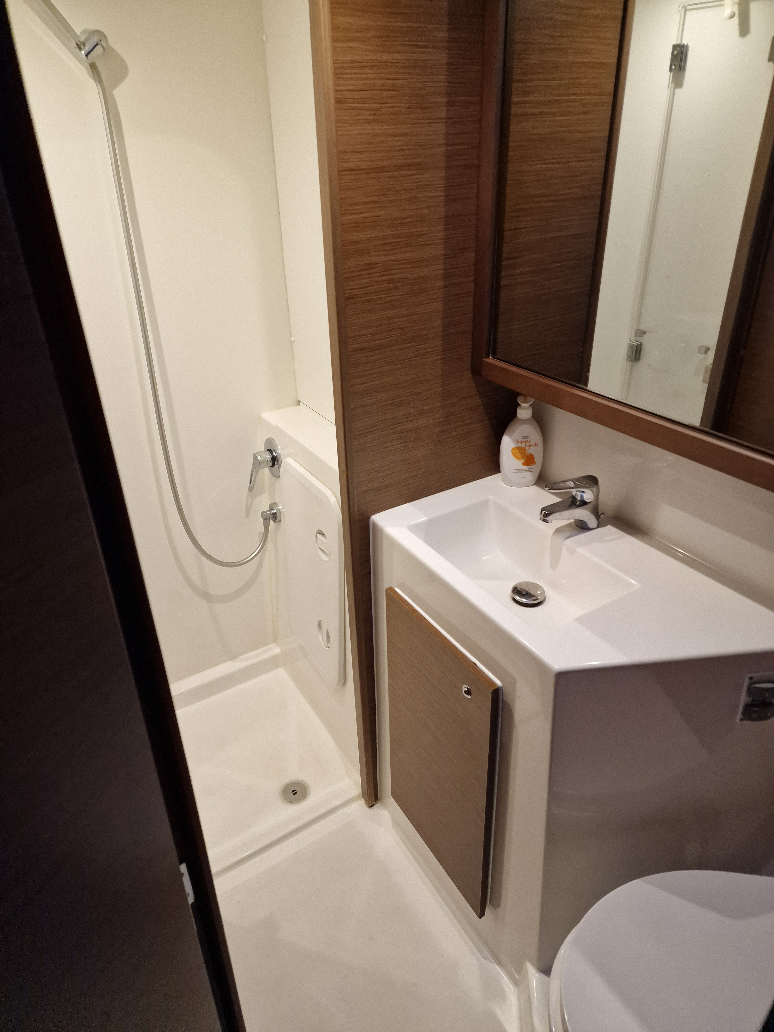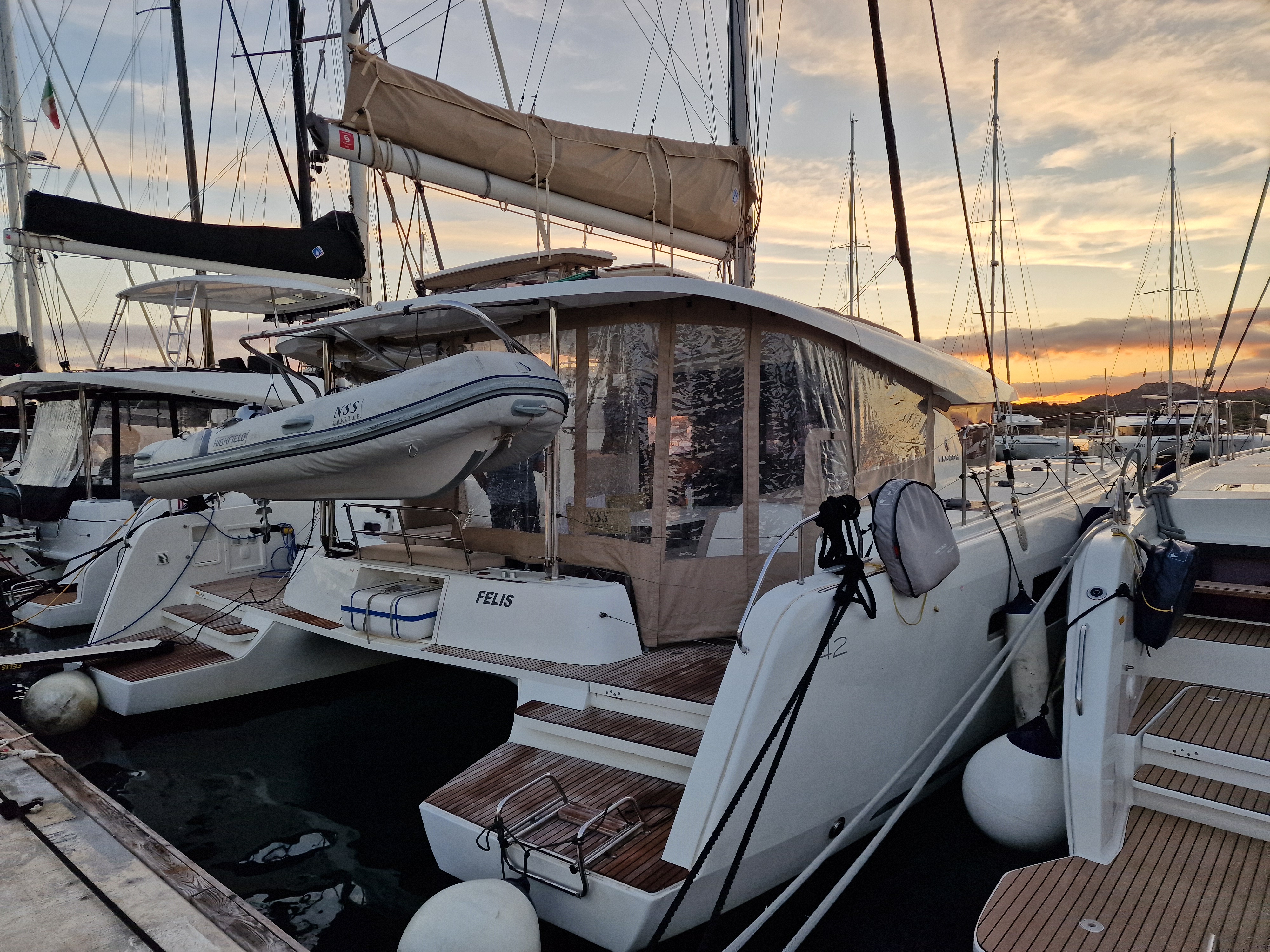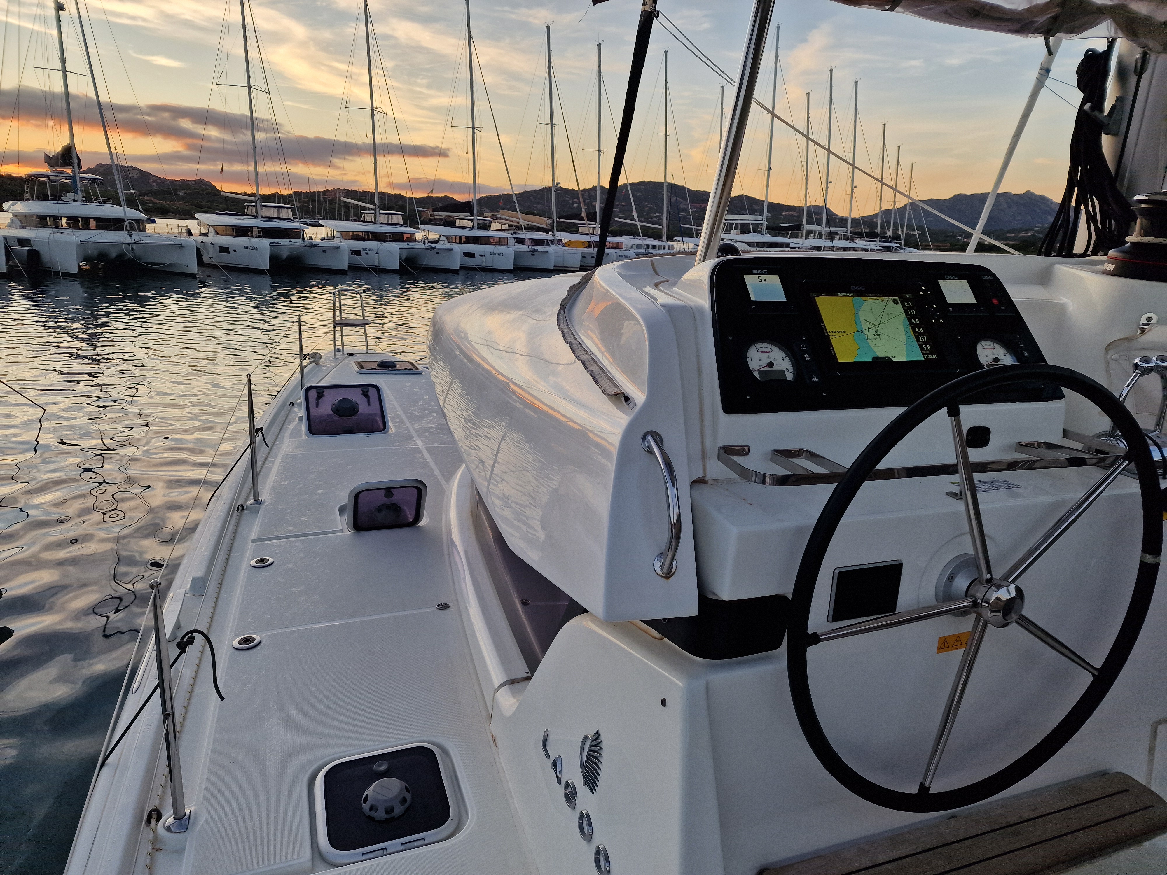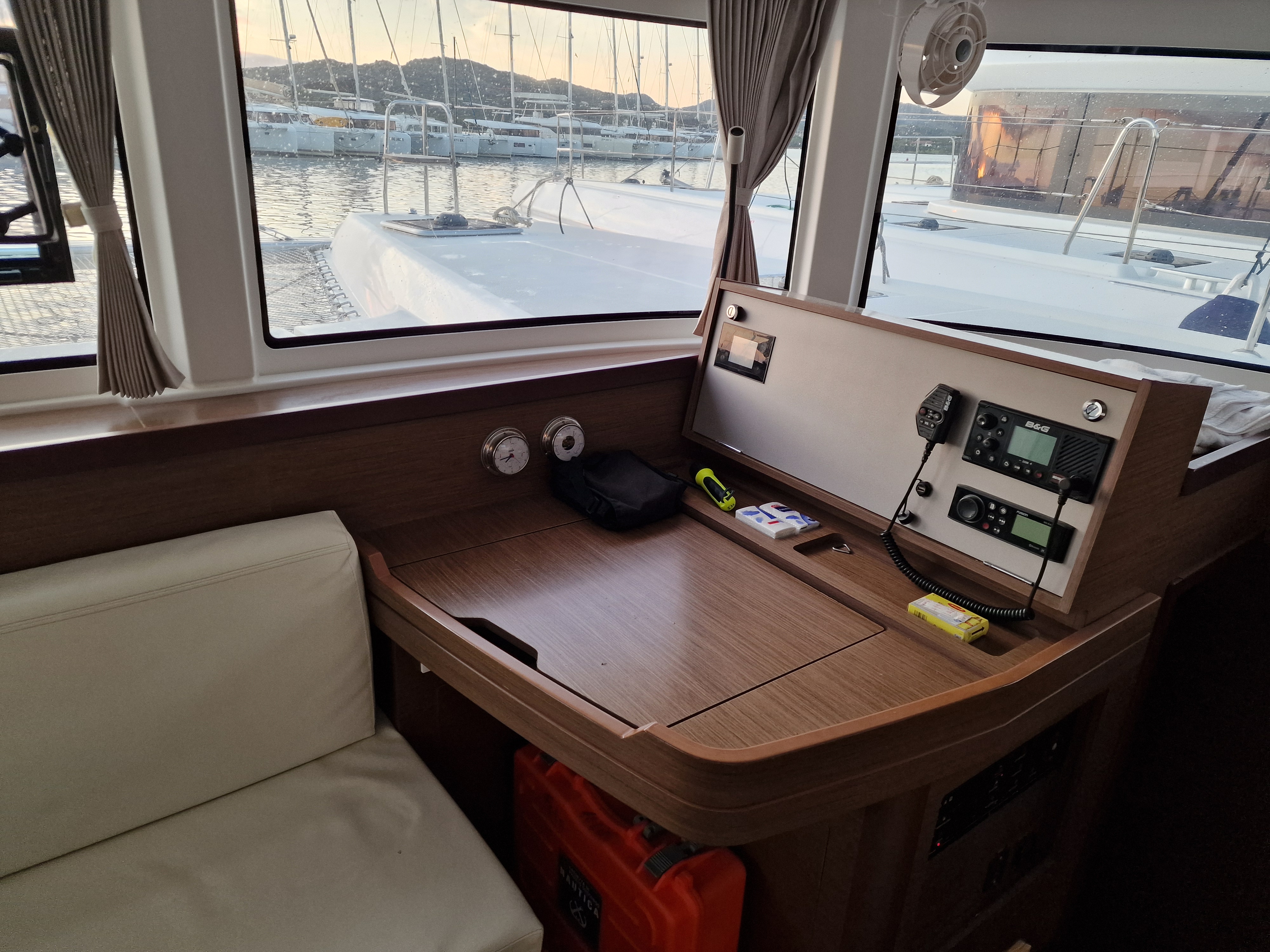 | Inside | Backofen, Inverter 12V/220V, Landstromkabel, Mokkakanne, Pantryausstattung, Radio, USB Steckdosen in den Kabinen, Ventilatoren in Kabinen, Warmwasser, Watermaker, WC (elektr.) |