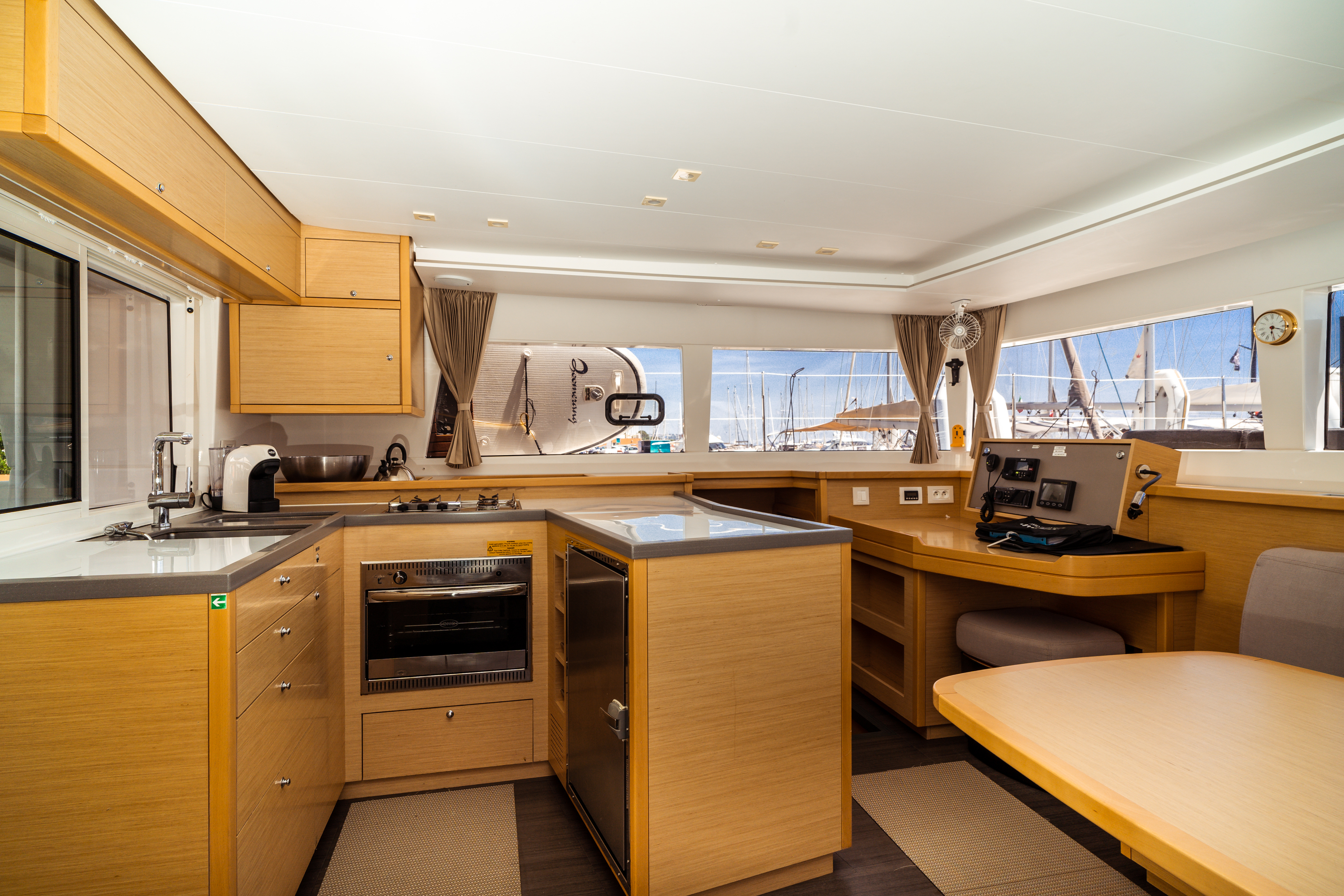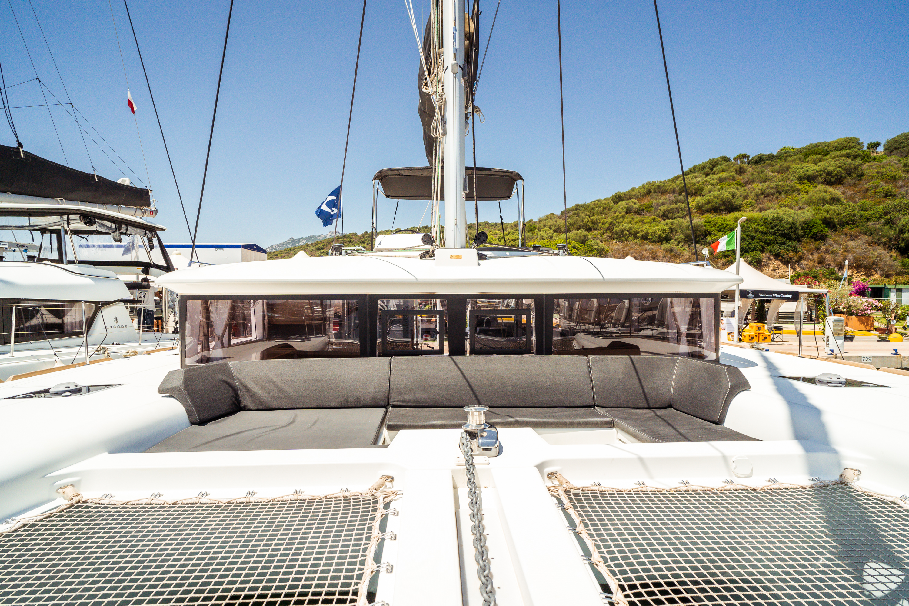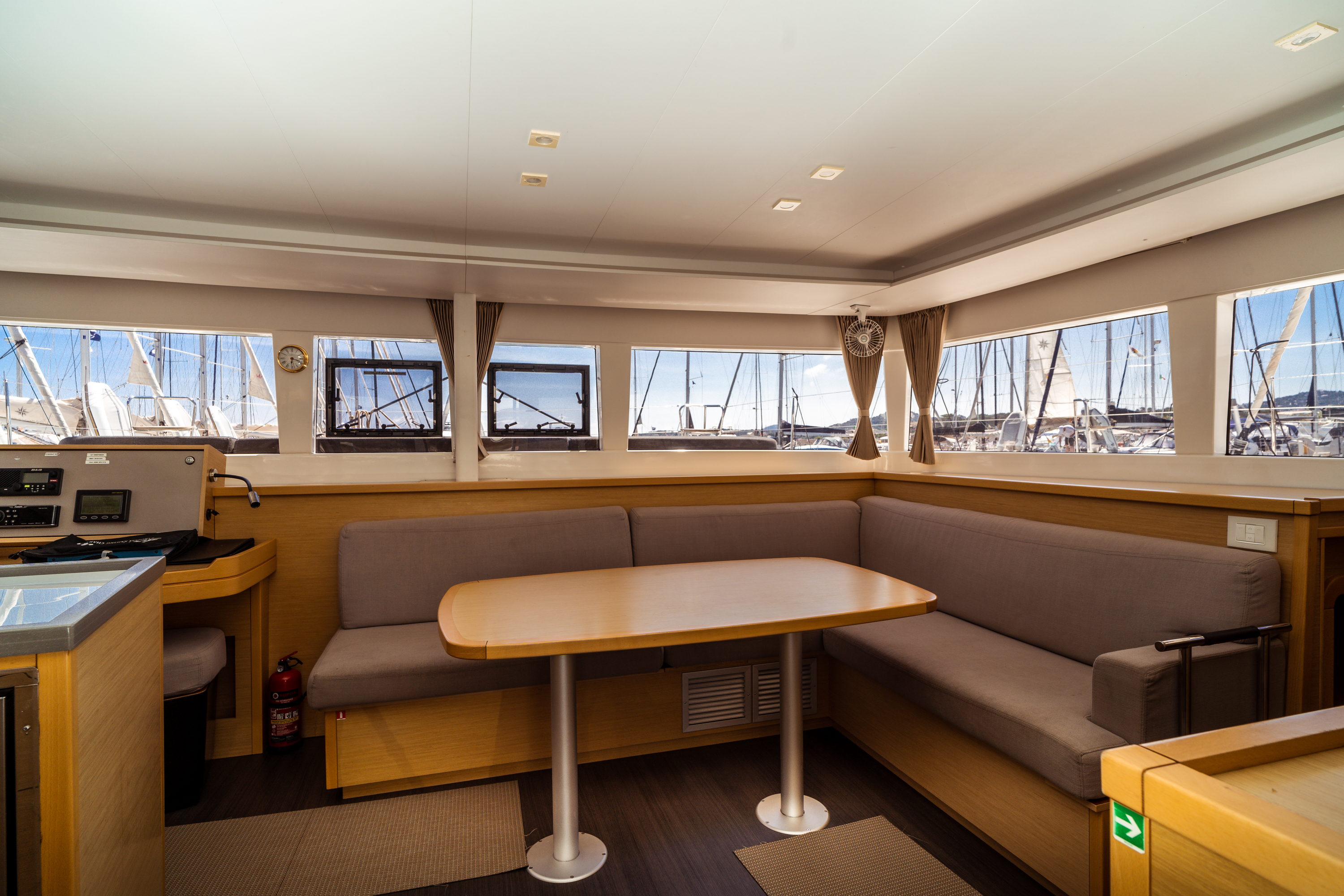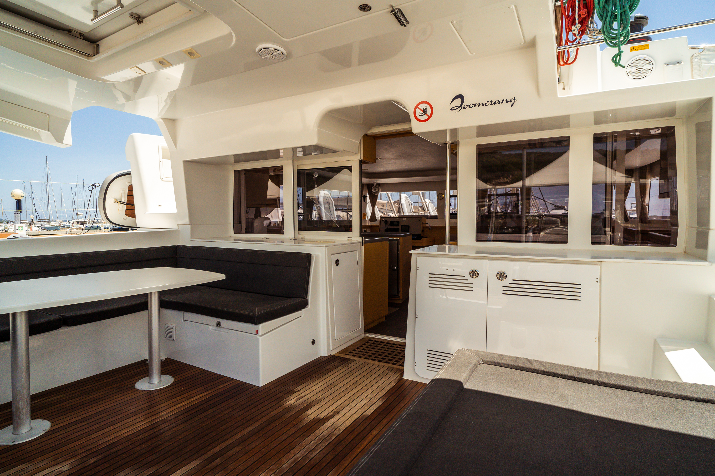 | Outside | Anker mit Kette, Biminitop, Bootshaken, Bürste und Schwamm, Cockpitdusche, elektr. Ankerwinsch, elektr. Winsch, Festmacherleinen, Gangway, Schnorchelausrüstung, Sprayhood, Wasserschlauch |