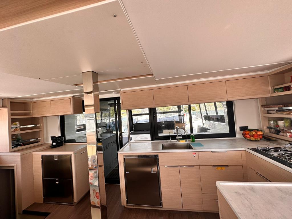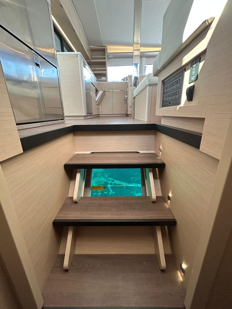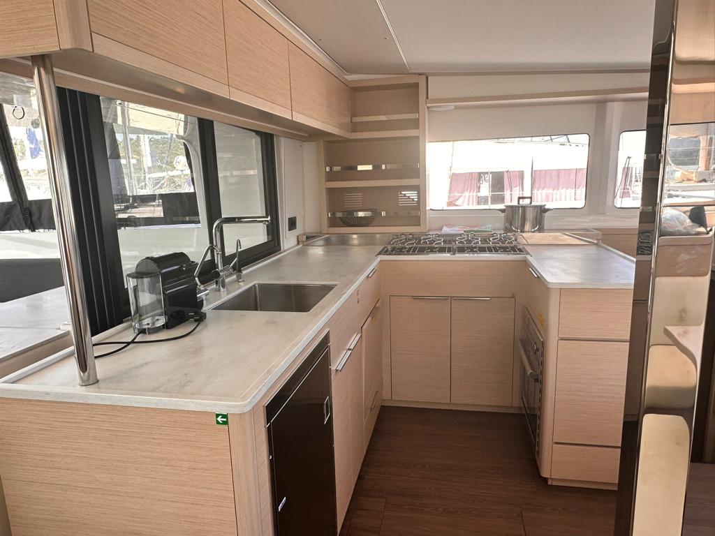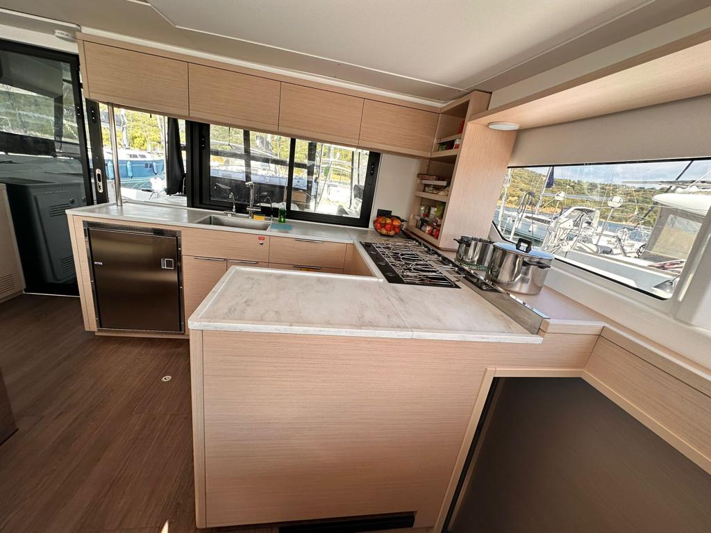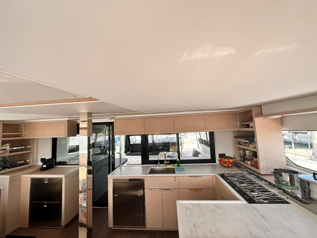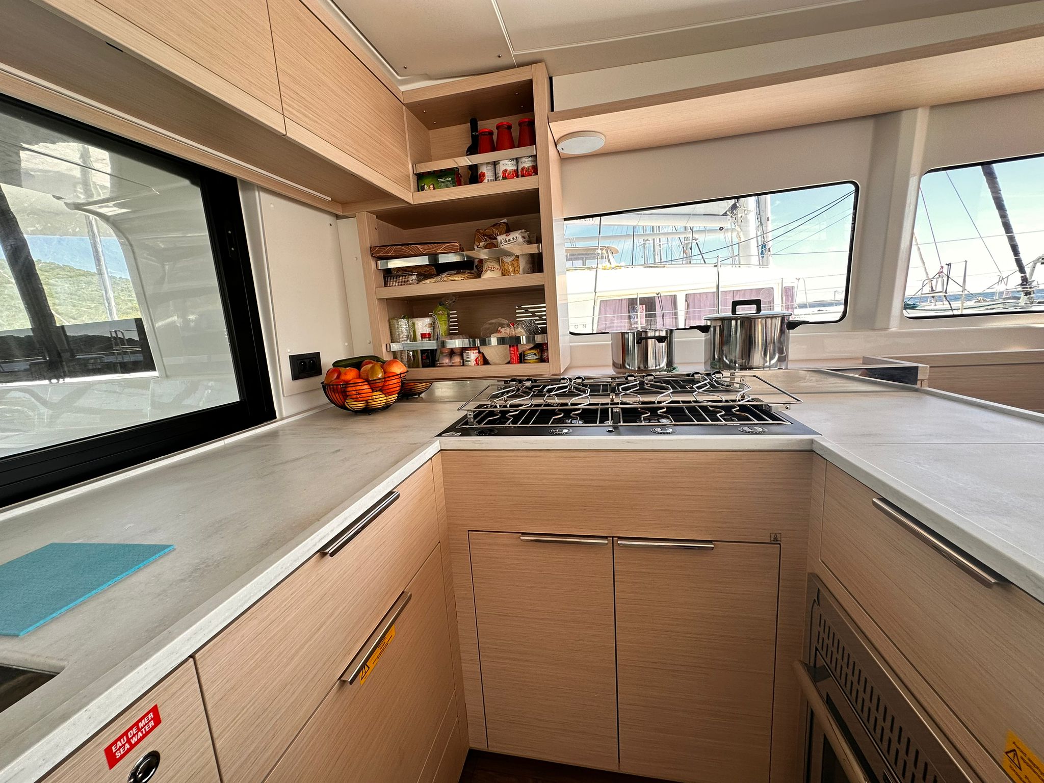 | Inside | 3-flammiger Gasherd, Borduhr, Eiswürfelmaschine, Gasherd mit Backofen, Gefrierschrank, Generator, Geschirrspüler, Heizung, Klimaanlage (ohne Landstrombedarf), Kühlschrank, Luftpumpe für Beiboot, Pantryausstattung, Radio, Radio mit CD, MP3, AUX-In, Radio mit USB, USB Steckdosen in den Kabinen, Ventilatoren in Kabinen, Warmwasser, Watermaker, WC (elektr.) |