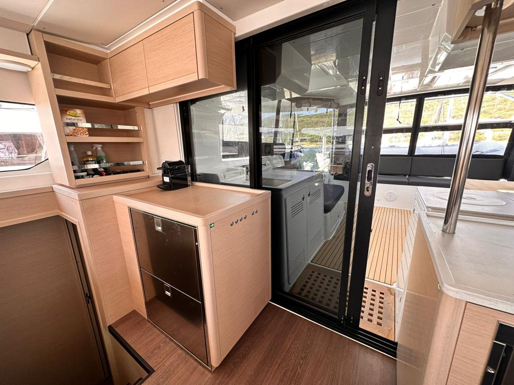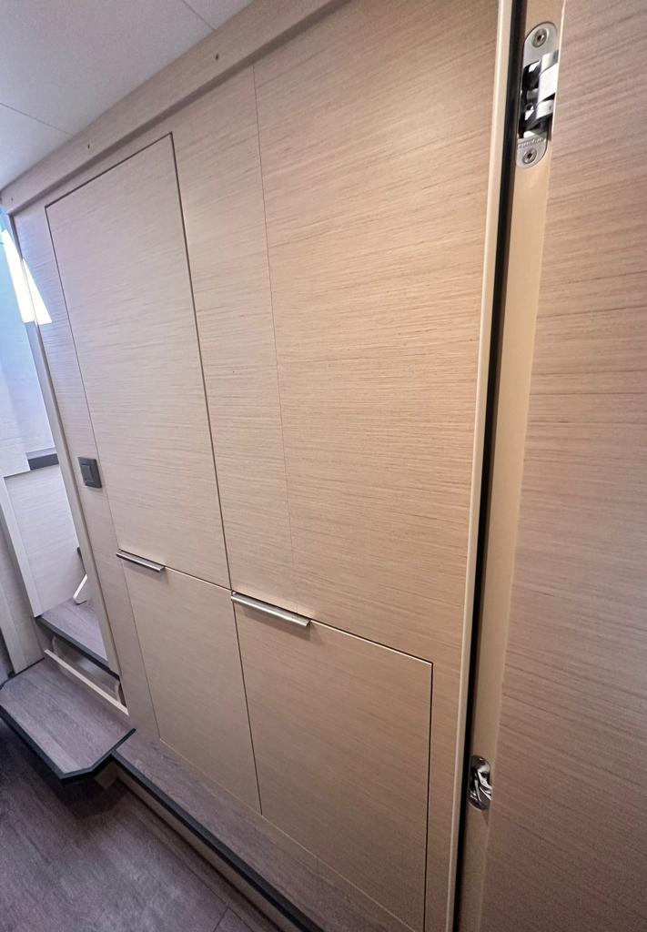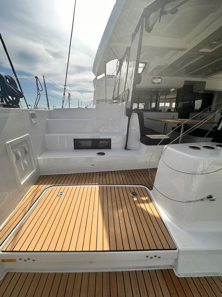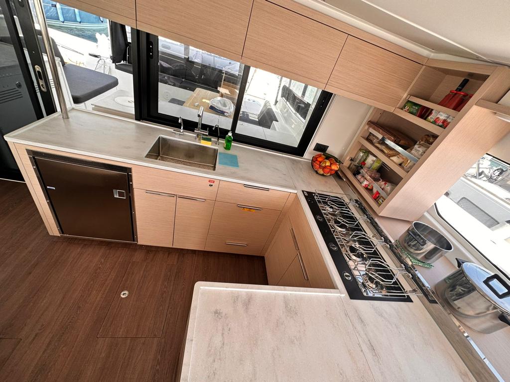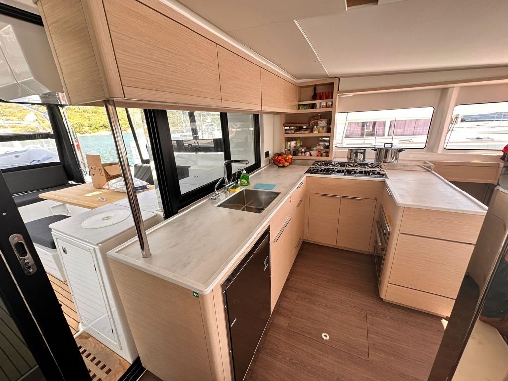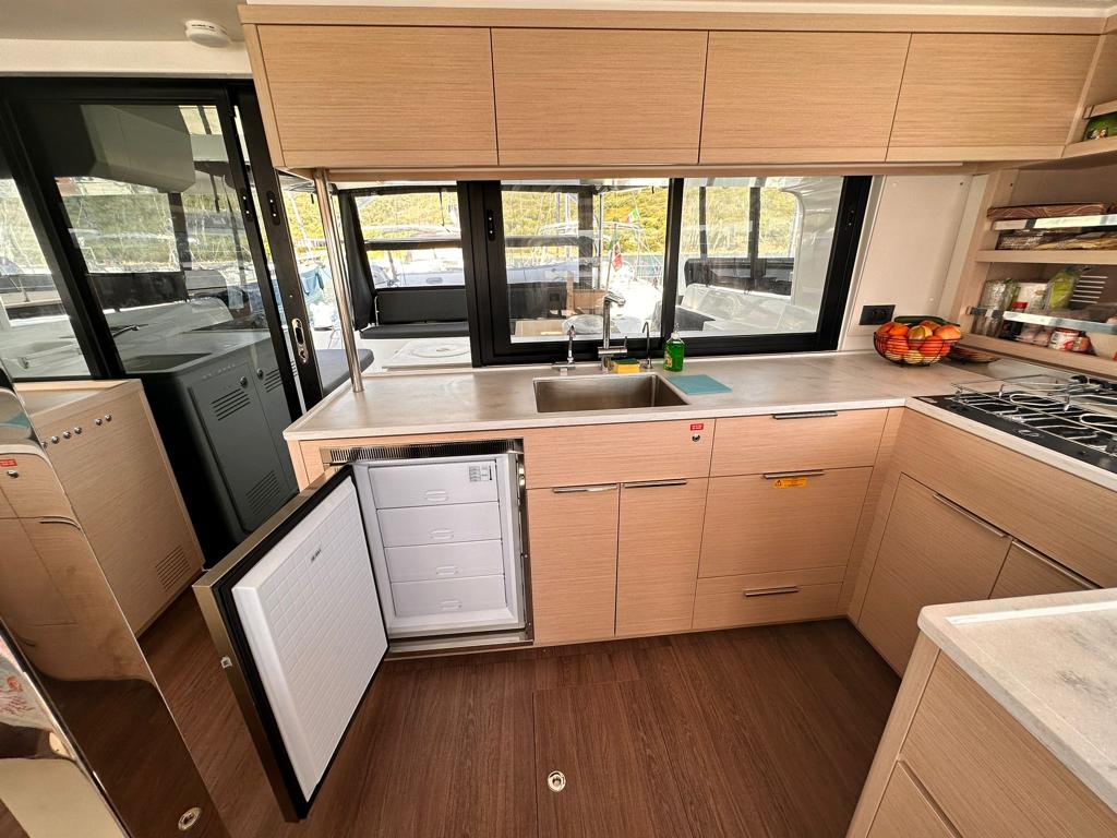 | Inside | 3-flammiger Gasherd, Borduhr, Eiswürfelmaschine, Gasherd mit Backofen, Gefrierschrank, Generator, Geschirrspüler, Heizung, Klimaanlage (ohne Landstrombedarf), Kühlschrank, Luftpumpe für Beiboot, Pantryausstattung, Radio, Radio mit CD, MP3, AUX-In, Radio mit USB, USB Steckdosen in den Kabinen, Ventilatoren in Kabinen, Warmwasser, Watermaker, WC (elektr.) |