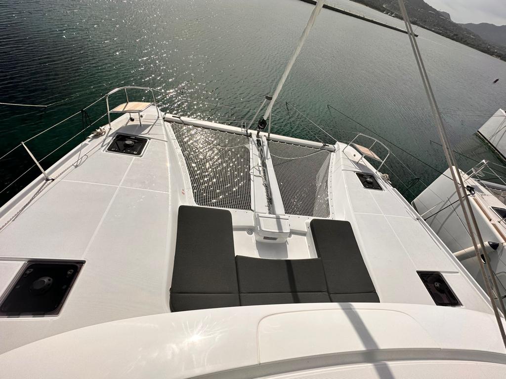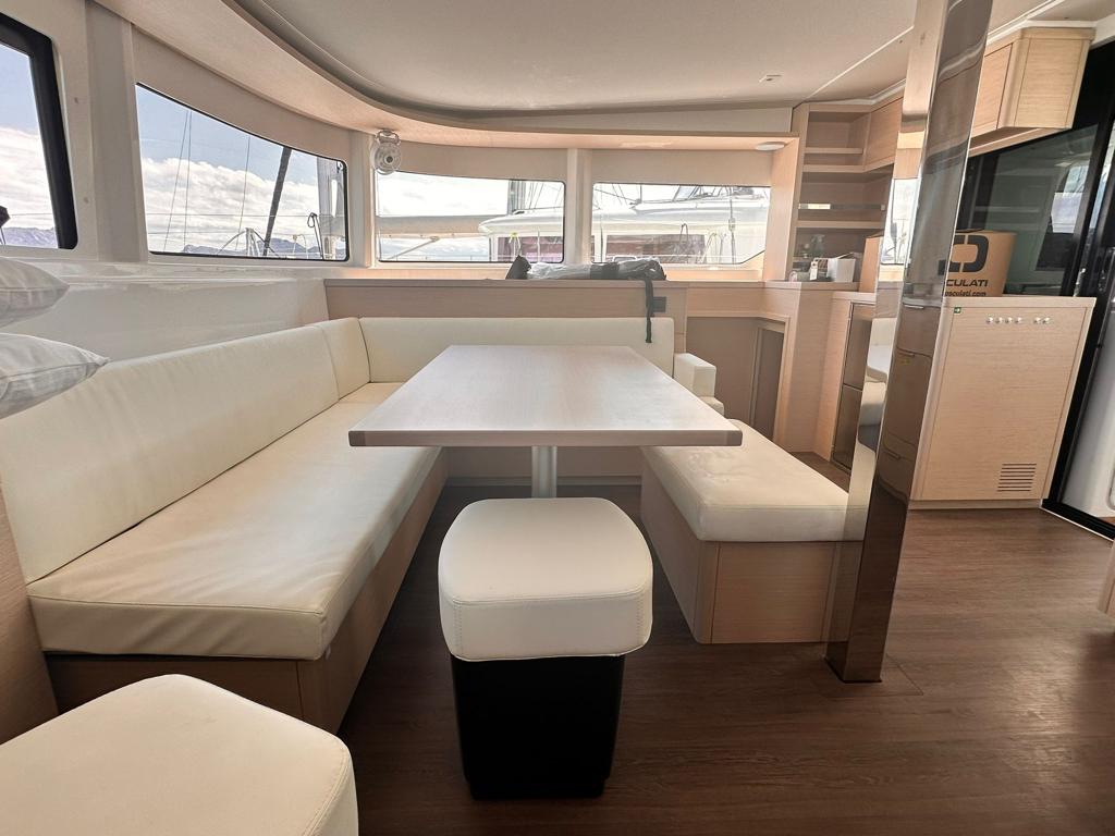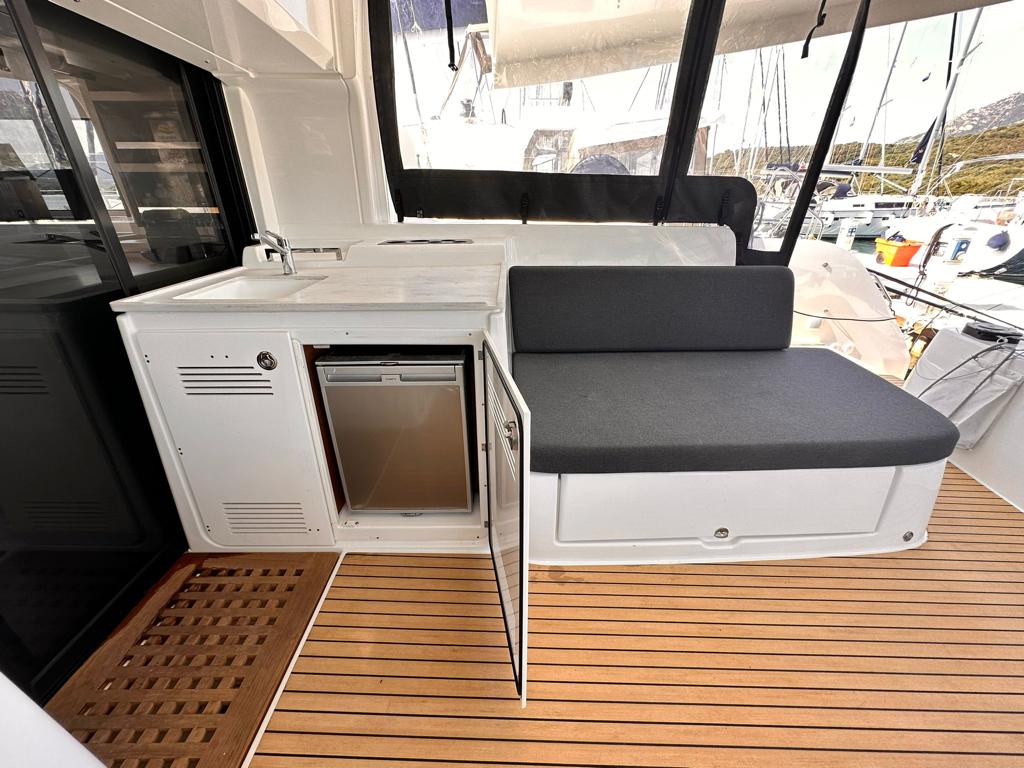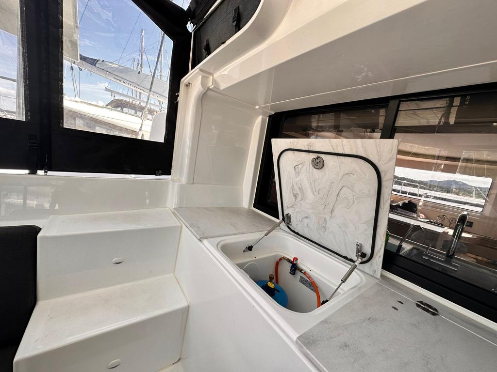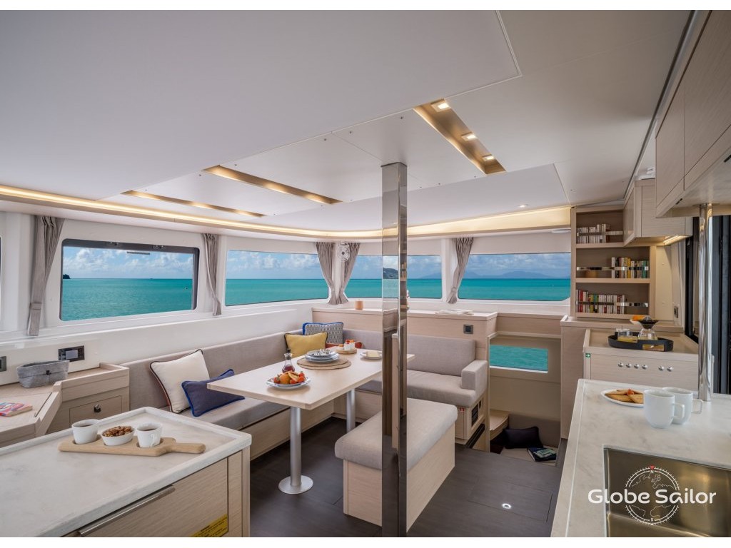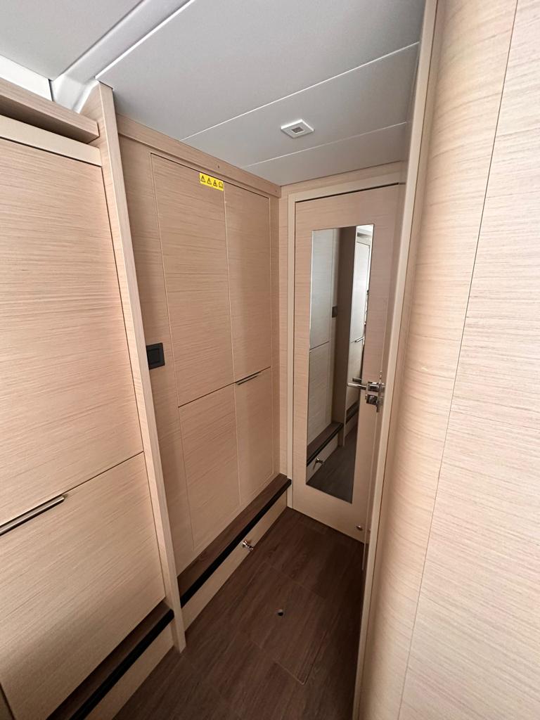 | Inside | 3-flammiger Gasherd, Borduhr, Eiswürfelmaschine, Gasherd mit Backofen, Gefrierschrank, Generator, Geschirrspüler, Heizung, Klimaanlage (ohne Landstrombedarf), Kühlschrank, Luftpumpe für Beiboot, Pantryausstattung, Radio, Radio mit CD, MP3, AUX-In, Radio mit USB, USB Steckdosen in den Kabinen, Ventilatoren in Kabinen, Warmwasser, Watermaker, WC (elektr.) |