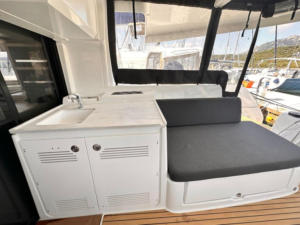 | Outside | Benzinkanister, Biminitop, Cockpitlautsprecher, Cockpitpolster, elektr. Ankerwinsch, elektr. Winsch, Festmacherleinen, Flybridge, Sprayhood, Windex |
