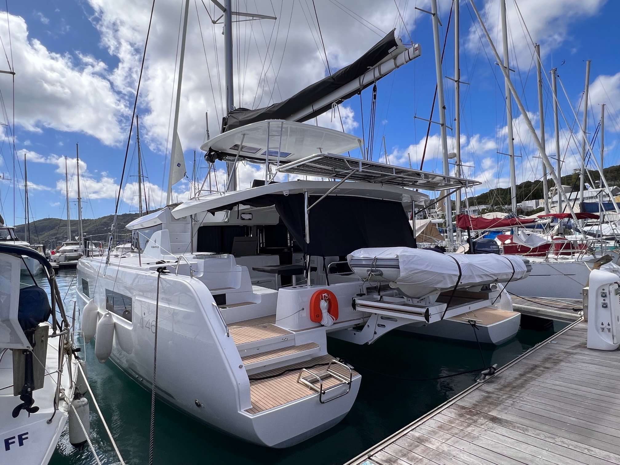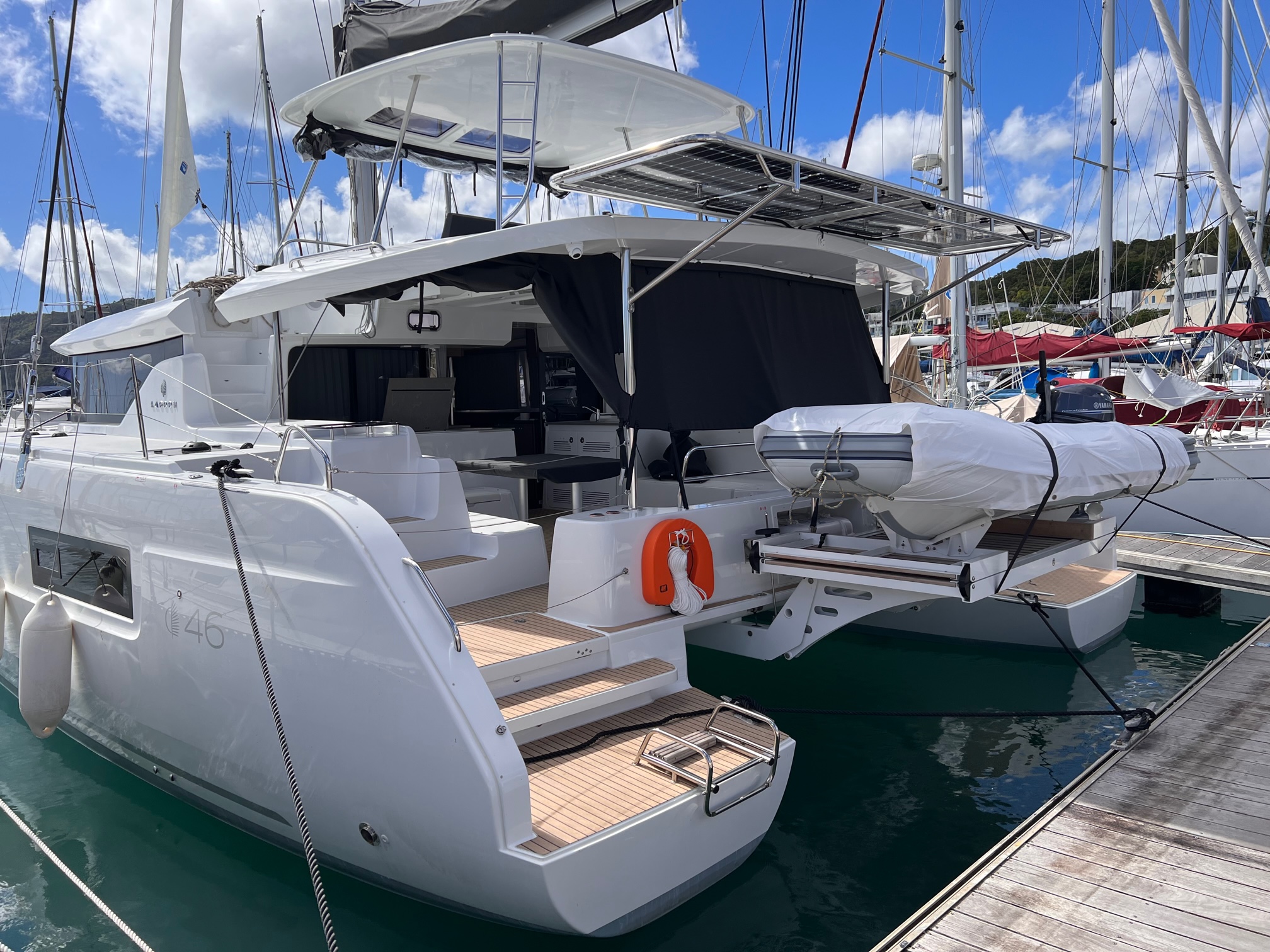 Anker mit Kette, Außendusche, Biminitop, Bootshaken, Bürste und Schwamm, Cockpitlautsprecher, Cockpittisch, Davits, Deckpolster, elektr. Ankerwinsch, Fender, Festmacherleinen, Gangway, Schnorchelausrüstung, Solaranlage, Wasserschlauch, Windex |
