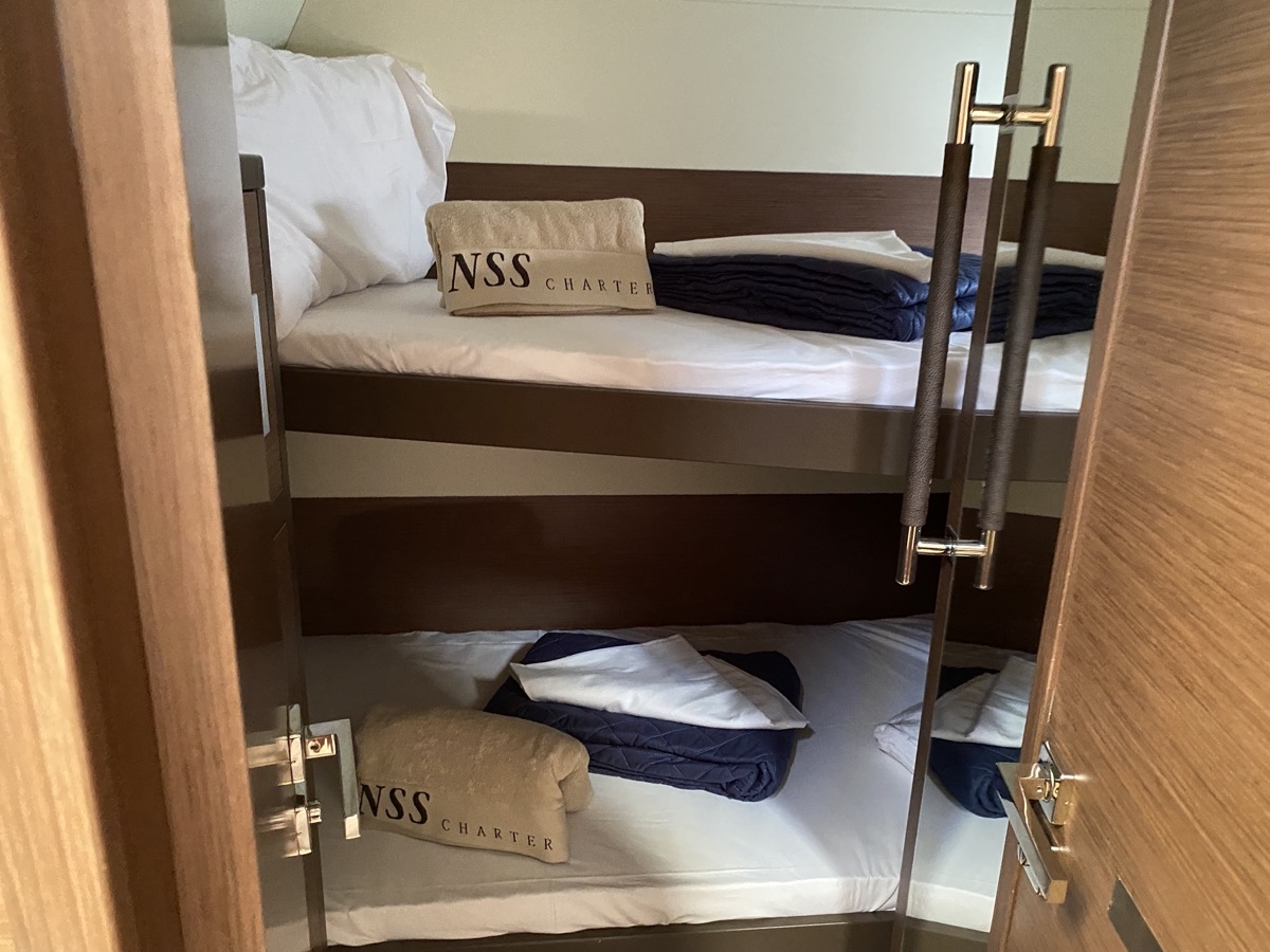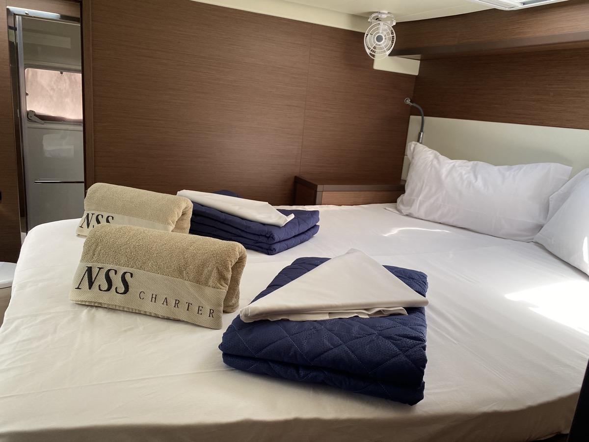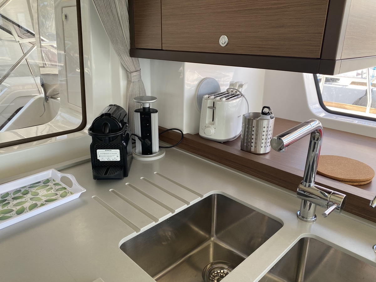 | Inside | Backofen, Eiswürfelmaschine, Generator, Inverter 12V/220V, Kaffeemaschine, Klimaanlage (ohne Landstrombedarf), Landstromkabel, Mikrowelle, Mokkakanne, Pantryausstattung, Radio, USB Steckdosen in den Kabinen, Ventilator, Ventilatoren in Kabinen, Warmwasser, Waschmaschine, Watermaker, WC (elektr.) |