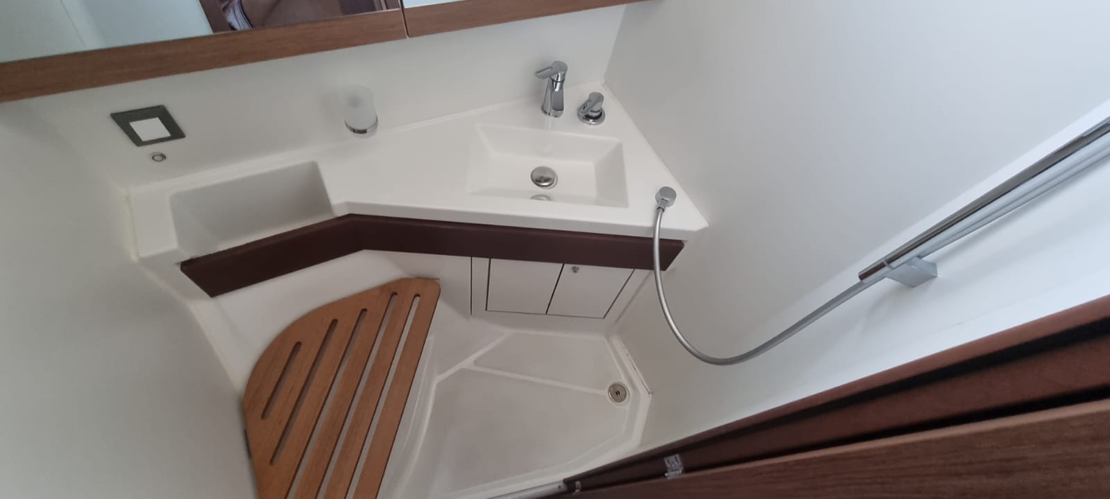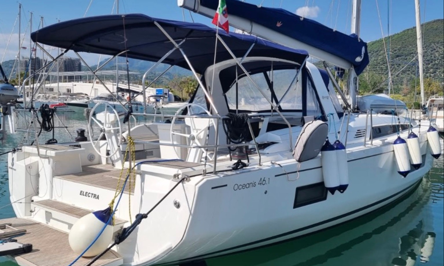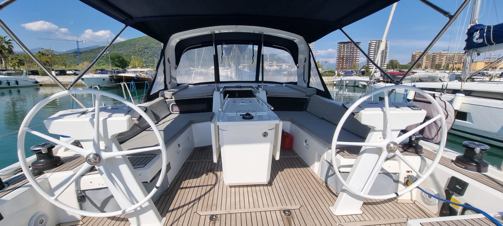 | Outside | Biminitop, Cockpitdusche, Cockpitlautsprecher, Cockpitpolster, Cockpittisch, elektr. Ankerwinsch, elektr. Winsch, Teak im Cockpit |