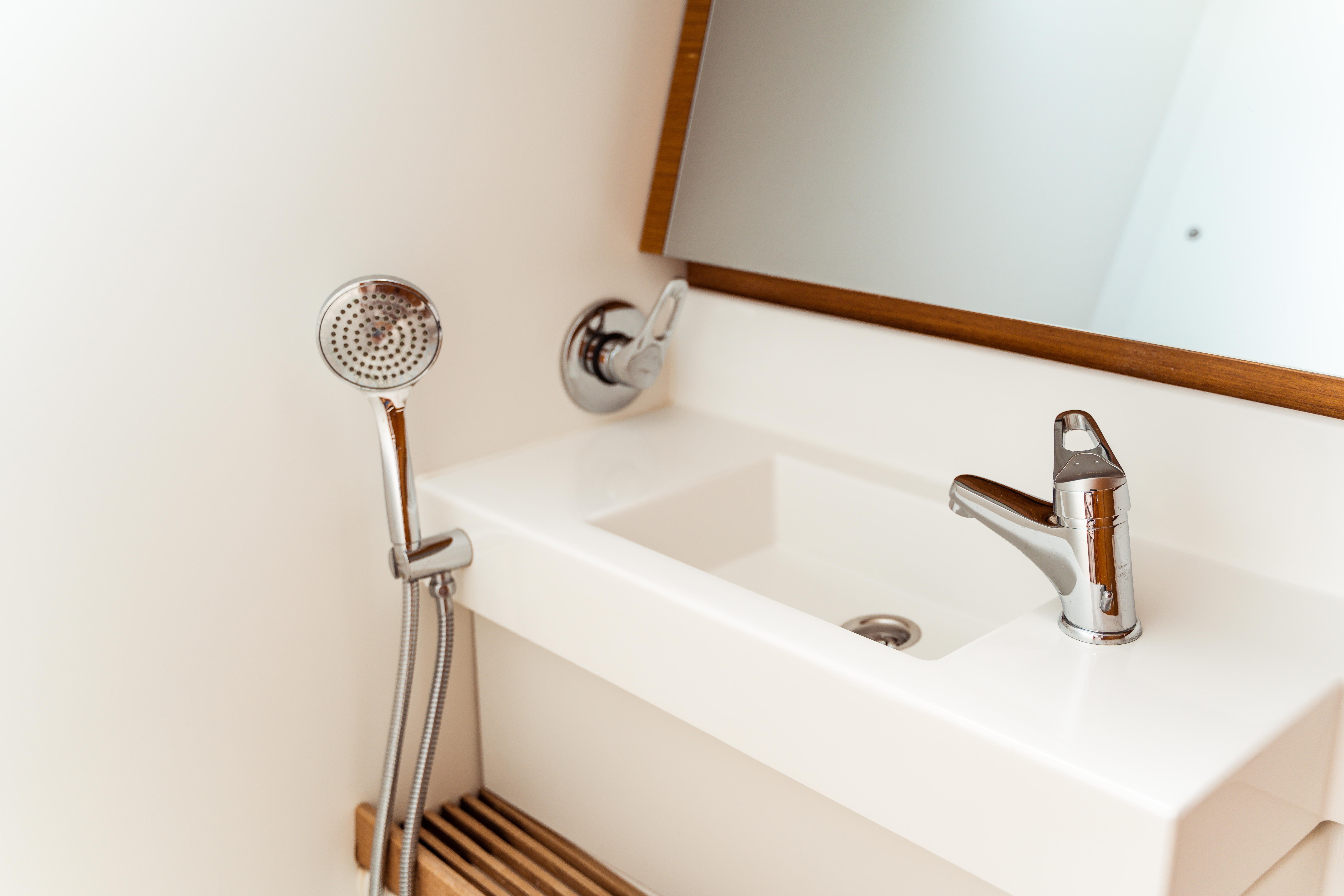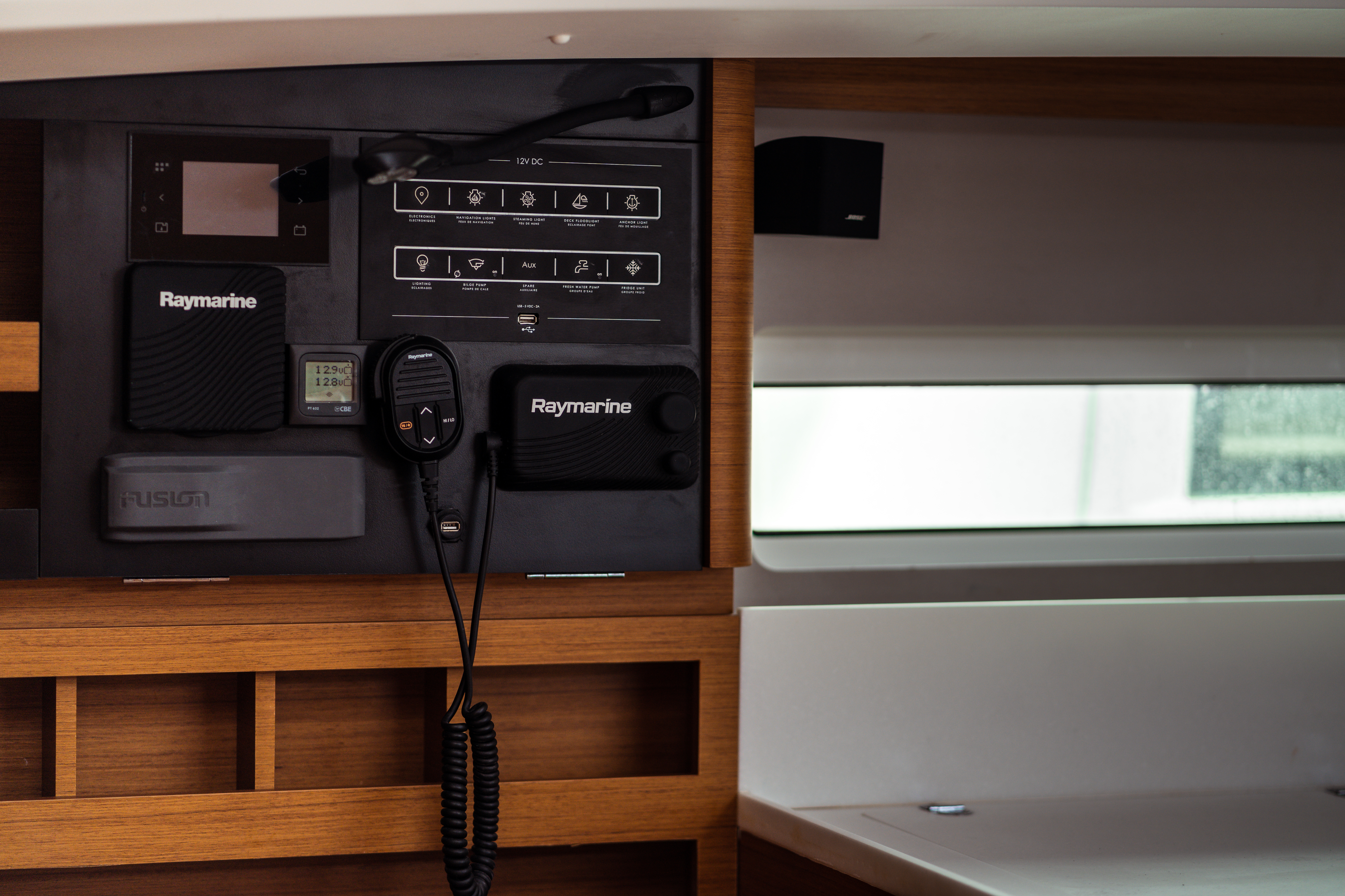 | Inside | Gasherd mit Backofen, Kühlschrank, Lautsprecher im Salon, Pantryausstattung, Radio mit USB, Salontisch absenkbar, USB Steckdosen in den Kabinen, Ventilatoren in Salon und Kabinen, Wasserkocher |