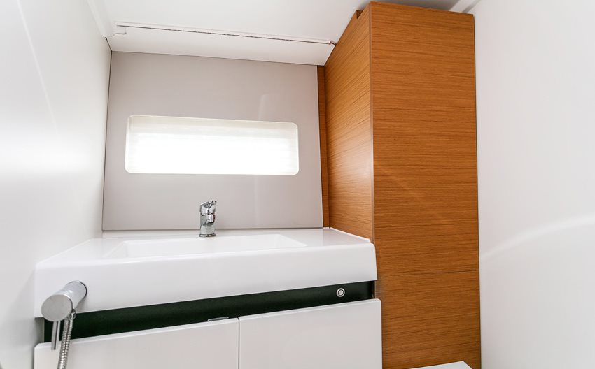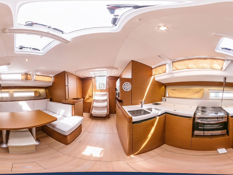 Inside Gasherd mit Backofen, Inverter 12V/220V, Kühlschrank, Pantryausstattung, Radio mit USB, Salontisch absenkbar, USB Steckdosen in den Kabinen, Ventilatoren in Salon und Kabinen