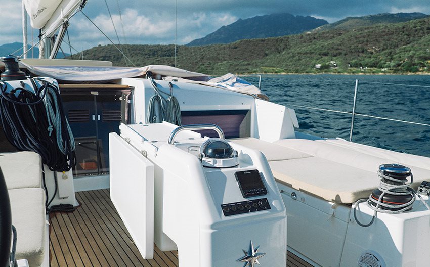 | Outside | Anker mit Kette, Biminitop, Bootshaken, Bürste und Schwamm, Cockpitdusche, Cockpitlautsprecher, Cockpitleuchte, Cockpittisch, Deckpolster, elektr. Ankerwinsch, Fender, Festmacherleinen, Gangway, Hardtop, Schnorchelausrüstung, Sprayhood, Teak im Cockpit, Wasserschlauch, Windex |