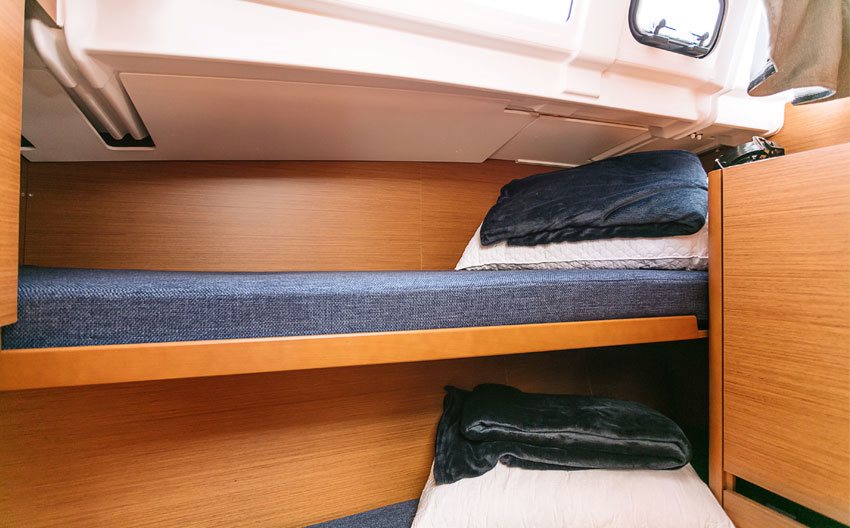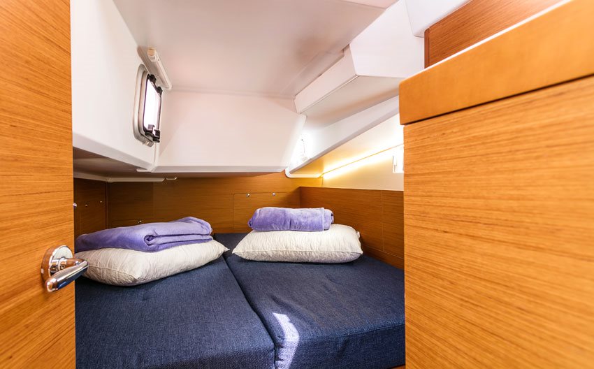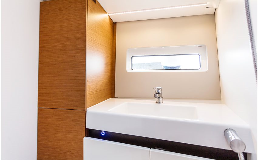 | Inside | Gasherd mit Backofen, Inverter 12V/220V, Klimaanlage, Kühlschrank, Lautsprecher im Salon, Pantryausstattung, Radio mit USB, Salontisch absenkbar, USB Steckdosen in den Kabinen, Ventilatoren in Salon und Kabinen, Wasserkocher |